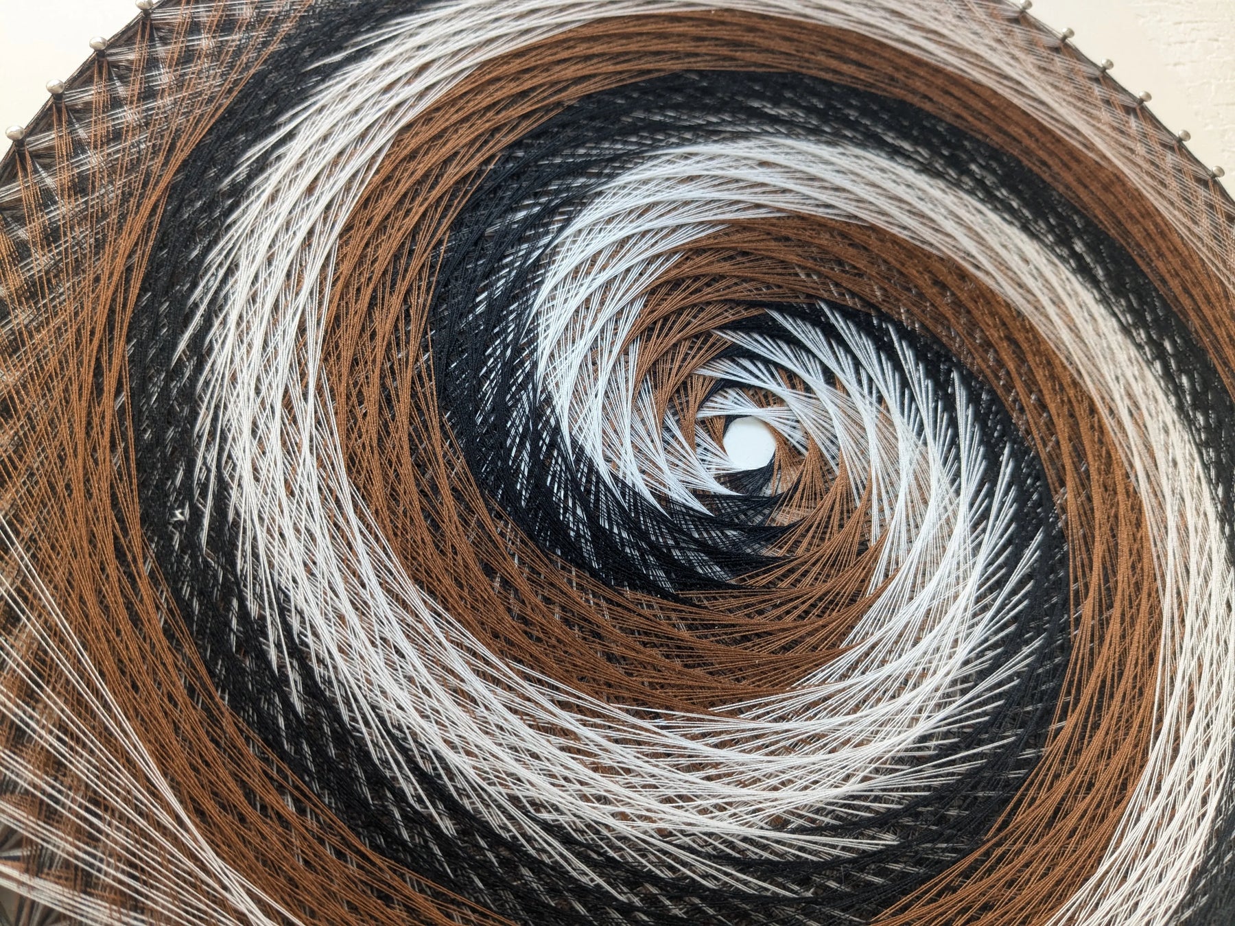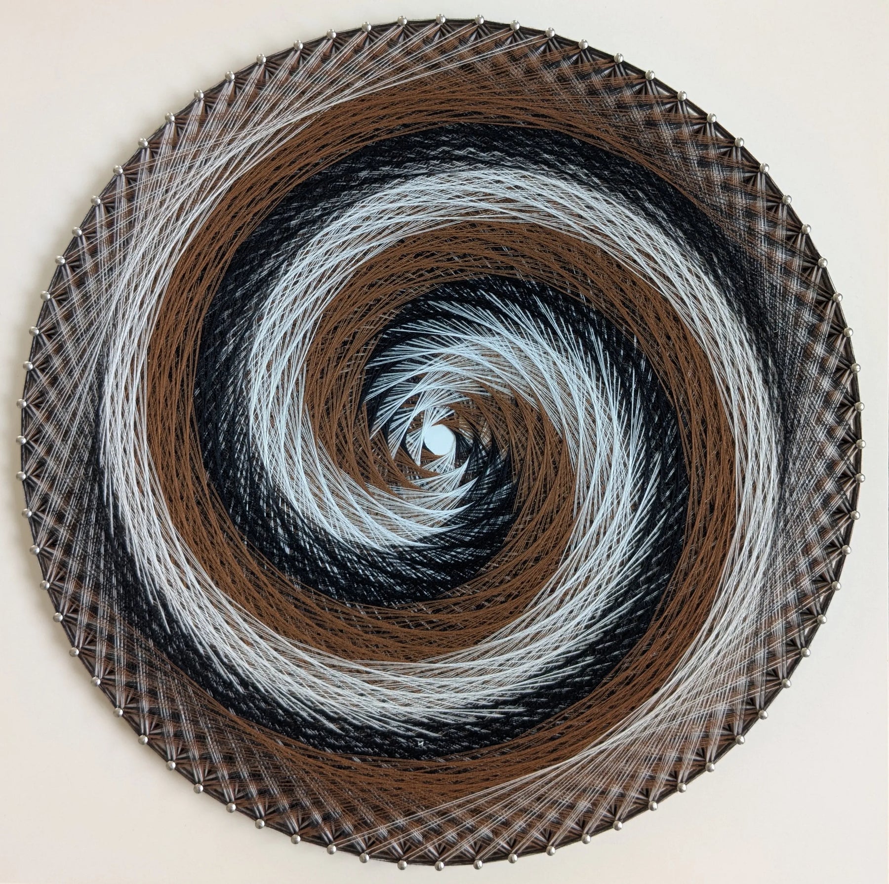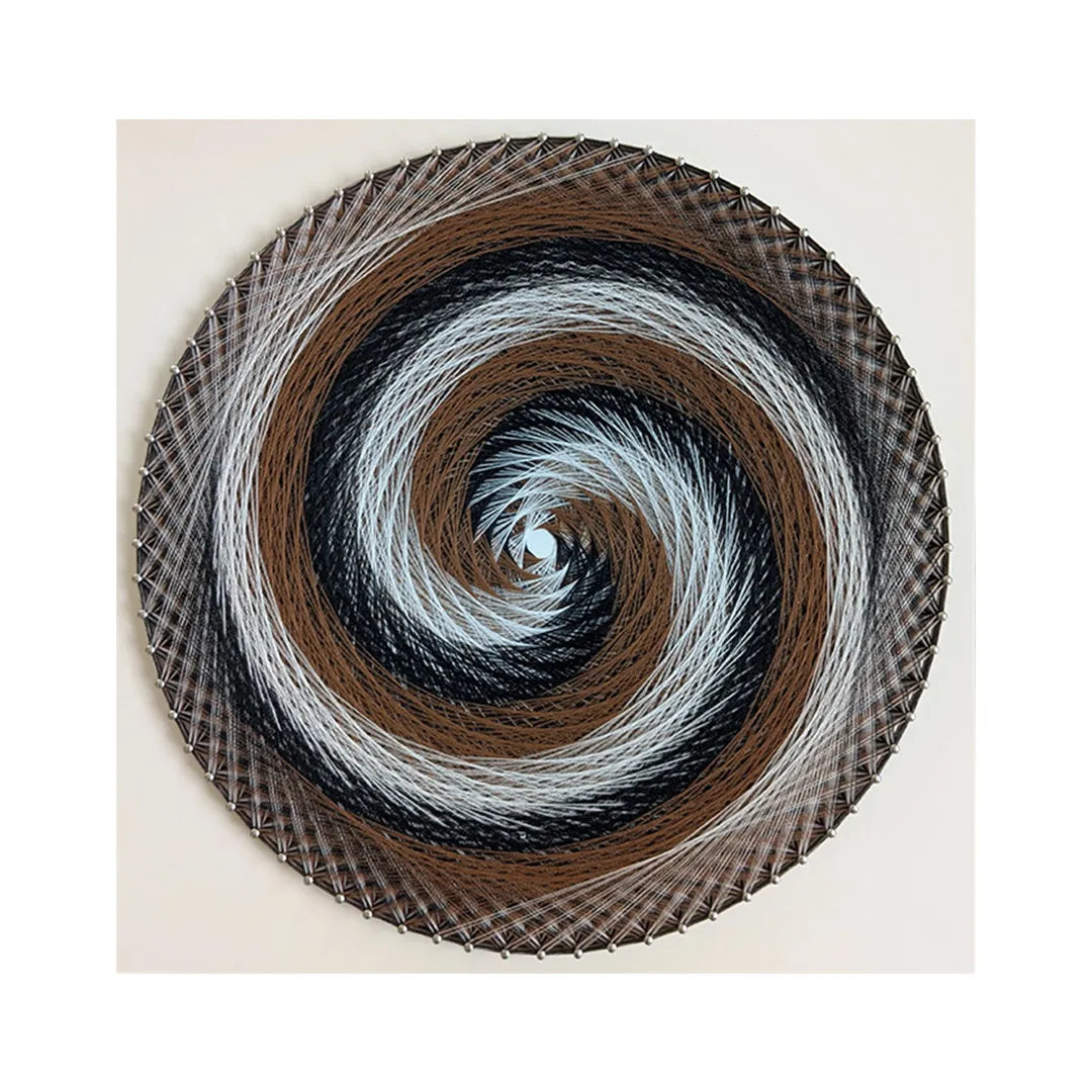 - 「うず」は、異なる色の線が重なり合いながらひとつの流れを形づくる作品です。 黒、白、茶の糸は調和しながら旋回し、静かな力強さを感じさせます。