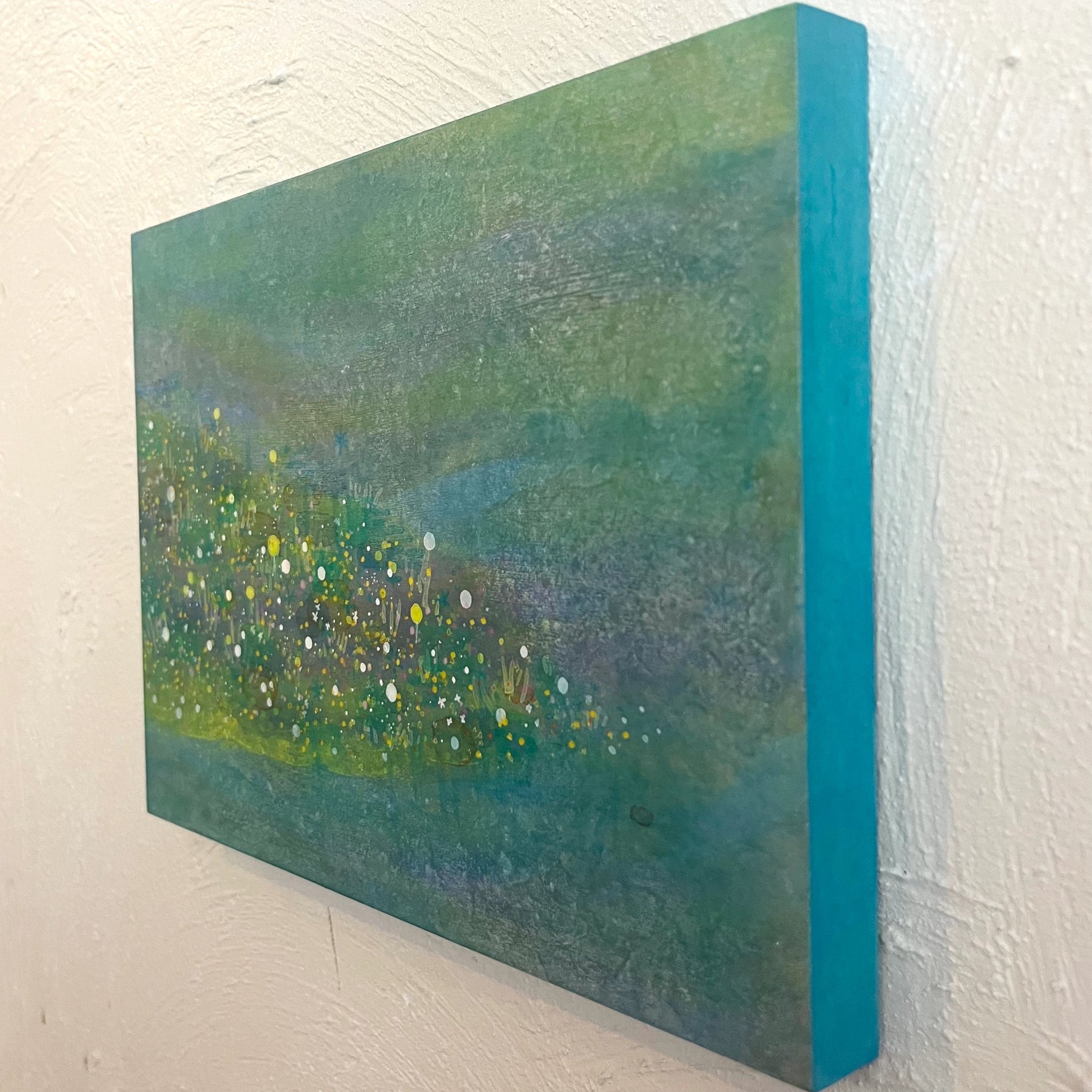 静かな緑の広がりの中に、光の粒がそっと芽吹くように散りばめられています。淡いブルーとグリーンが重なり合い、風が地表をすべる気配を残しながら、奥行きのある景色をつくり出しています。眺めるほどに穏やかなリズムが生まれ、部屋に優しい息づかいを届けてくれる一枚です。やわらかな色調が空間を包み込み、落ち着いた時間をつくり出します。