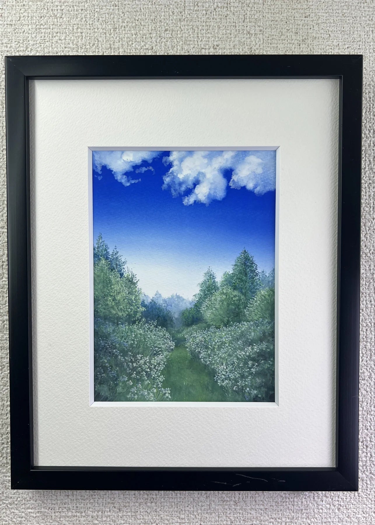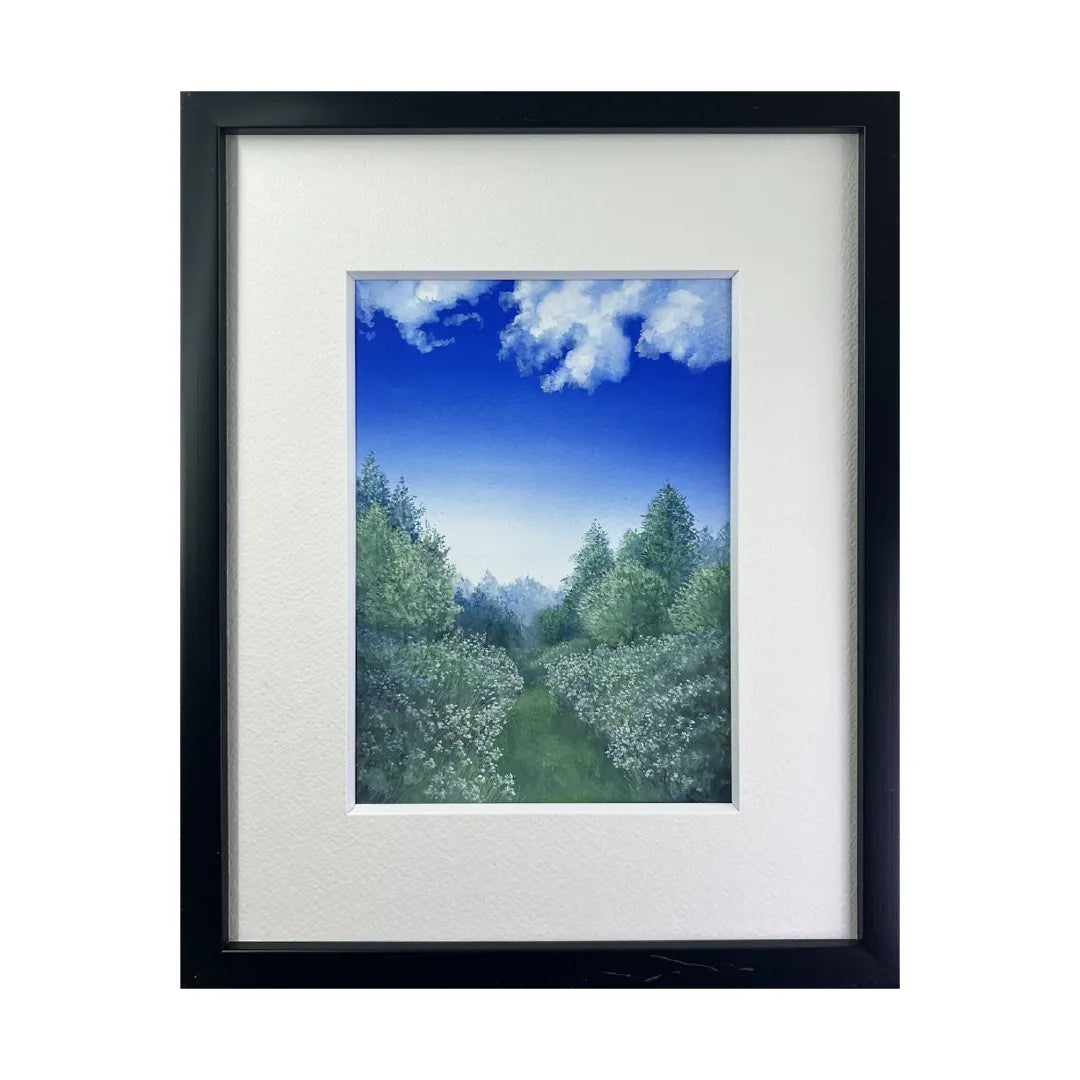 澄んだ青空の下、草花に縁取られた小道が奥へと続く風景を描いた一枚です。左右に広がる緑の濃淡と、雲の浮かぶ空の広がりが、歩みを進めるような静かな高揚感を与えます。リビングや書斎に飾ることで、空間に奥行きと爽やかな空気が生まれ、気持ちを切り替える時間が流れます。自然の気配を感じながら過ごしたい部屋にも、穏やかに寄り添う作品です。
