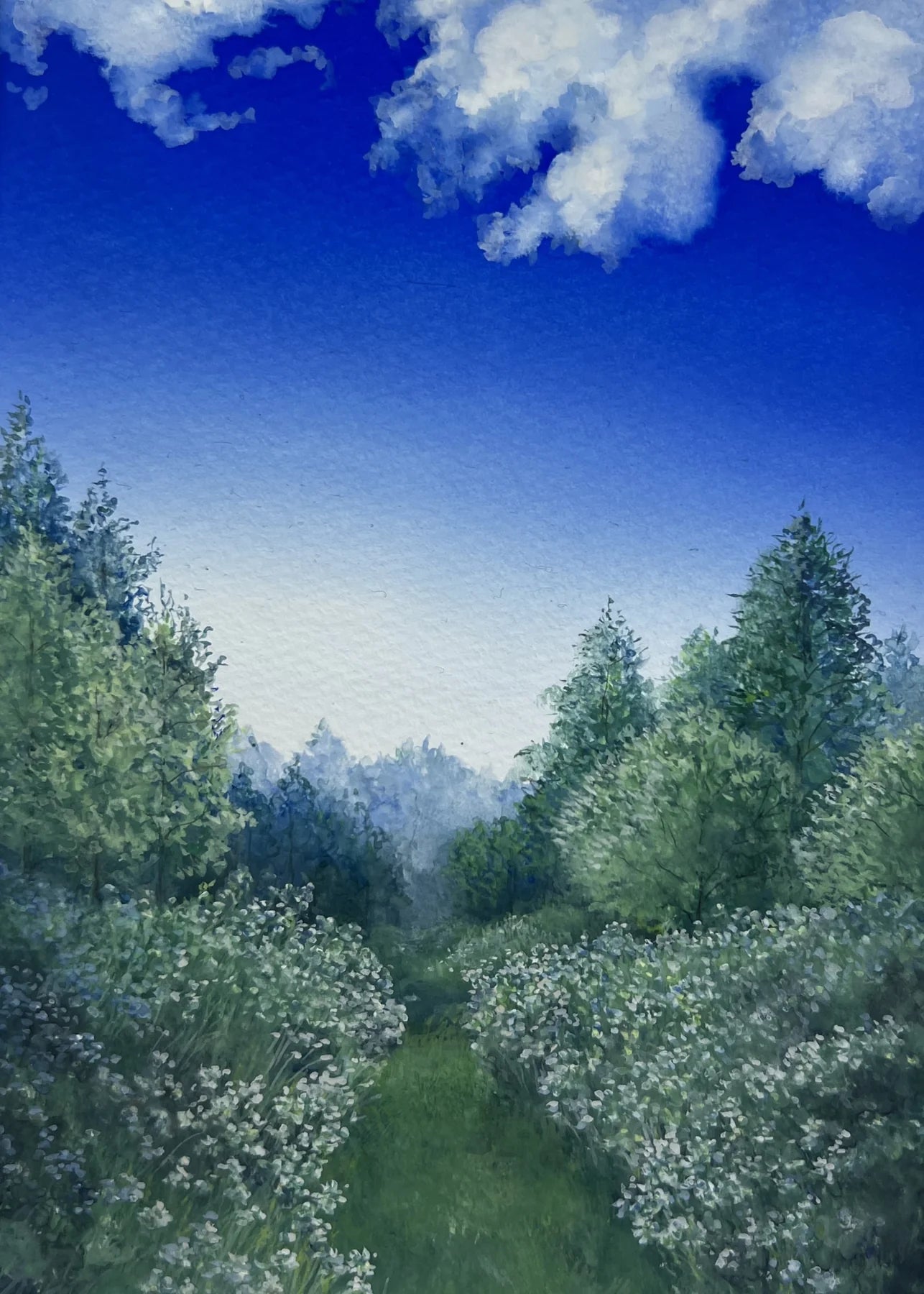 シリーズ 森(原画) 透き通るような青空の下、白い花々と柔らかな緑が静かに広がる風景。 「シリーズ 森」は、深呼吸するような澄んだ空気を感じさせ、心をゆるやかに整えてくれる作品です。 鮮やかなブルーから柔らかい光へと移り変わる空のグラデーション。 奥へ進むほどに深まっていく森の色合い。 そのすべてが、朝の静けさをそのまま閉じ込めたかのような穏やかな時間を生み出しています。 眺めるたびに心がスッと軽くなり、自然の中を歩いているような心地を感じられる一枚。 どんな空間にも柔らかい癒しを添えてくれます。