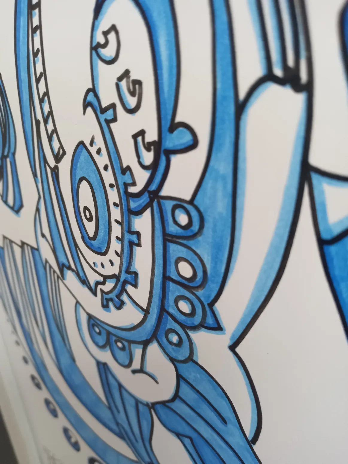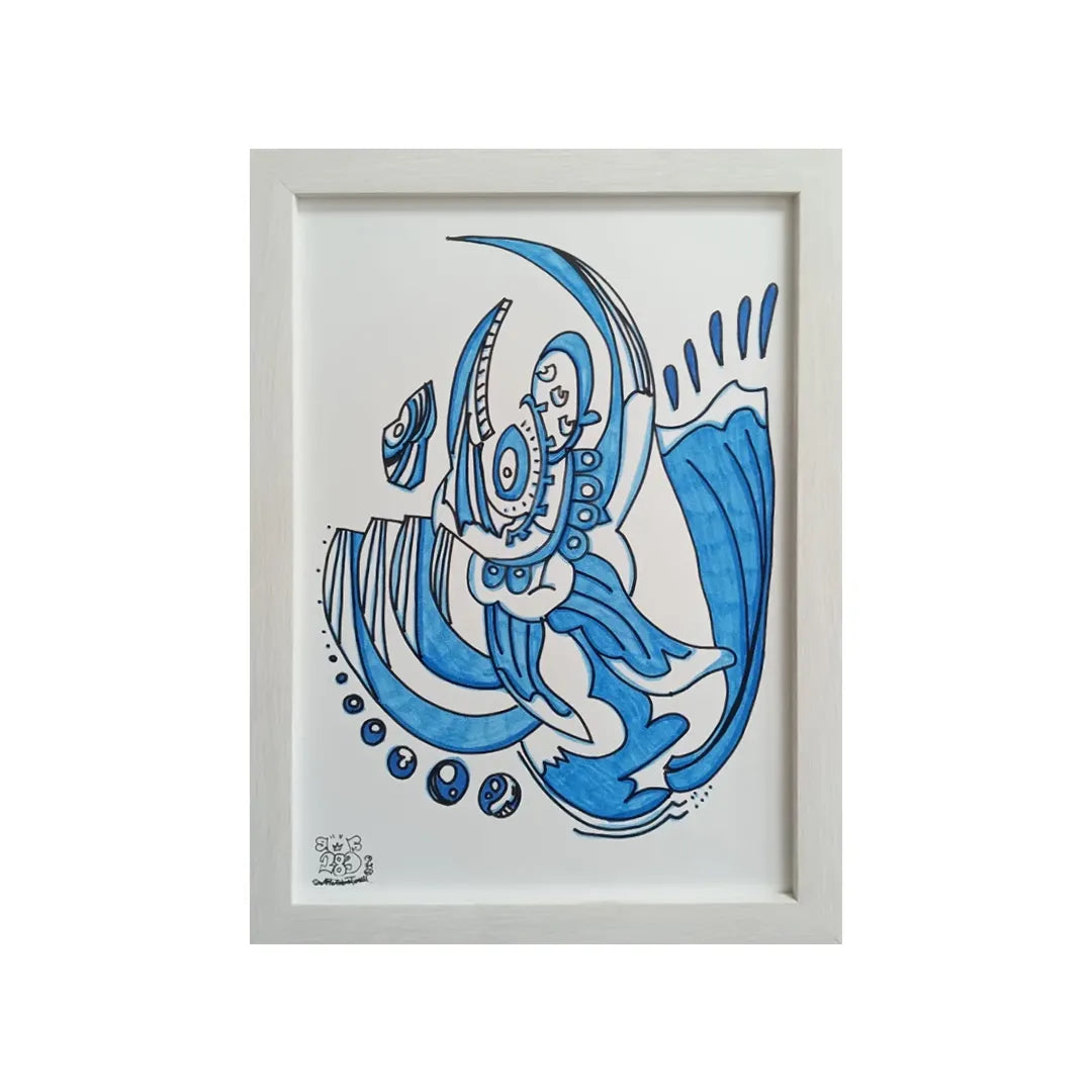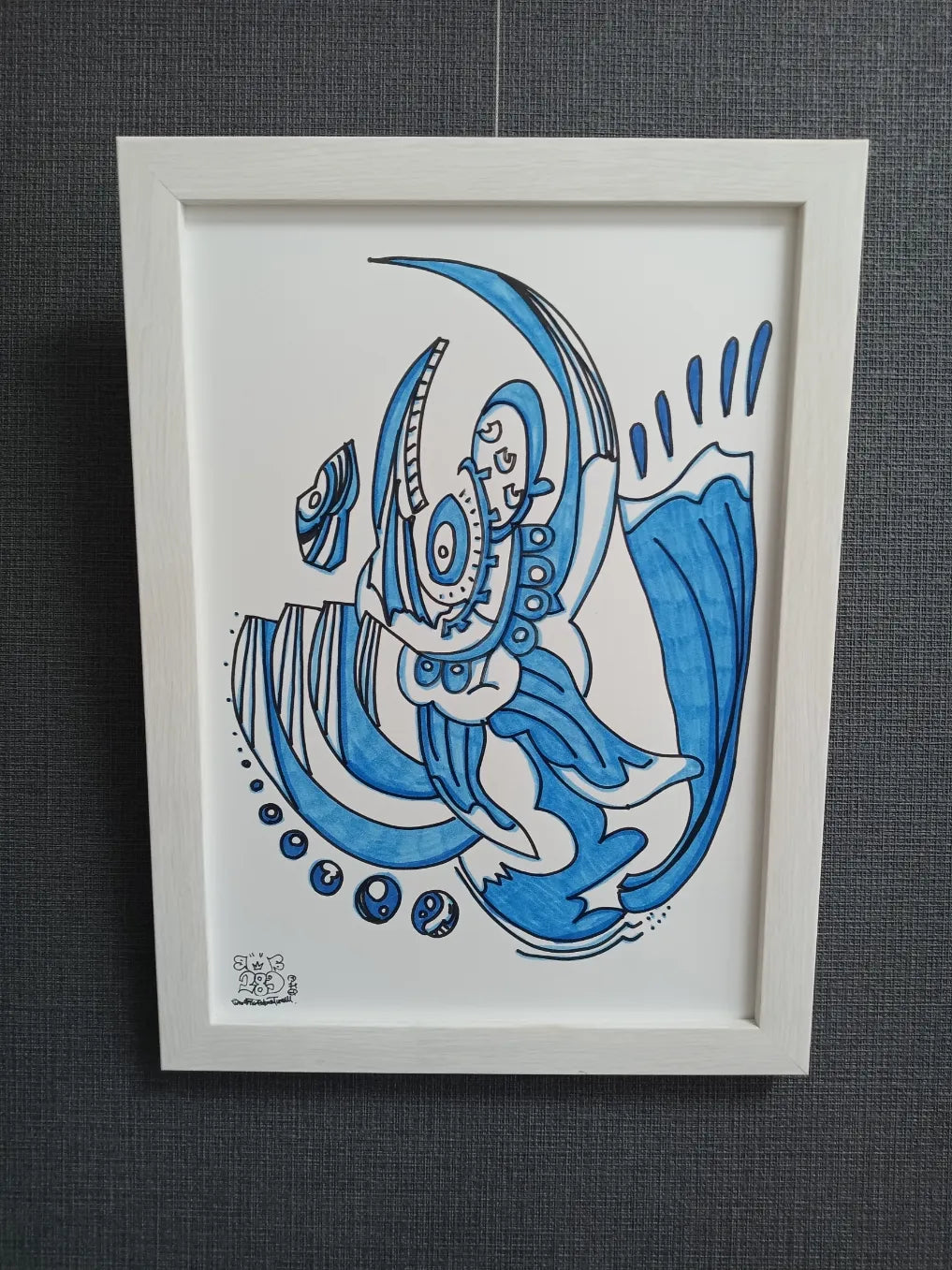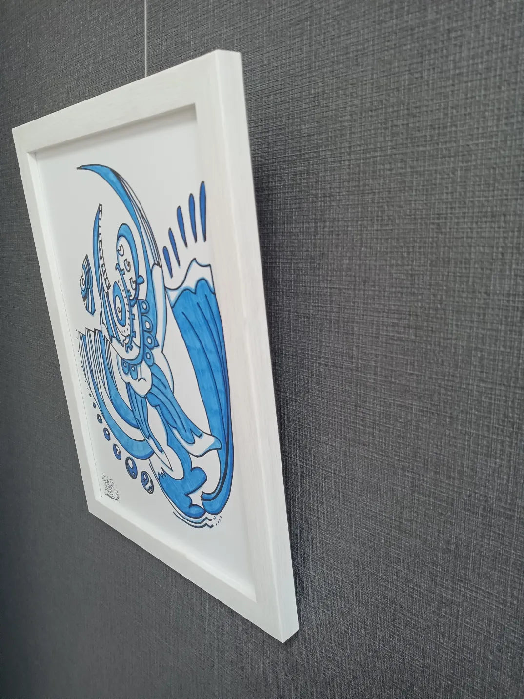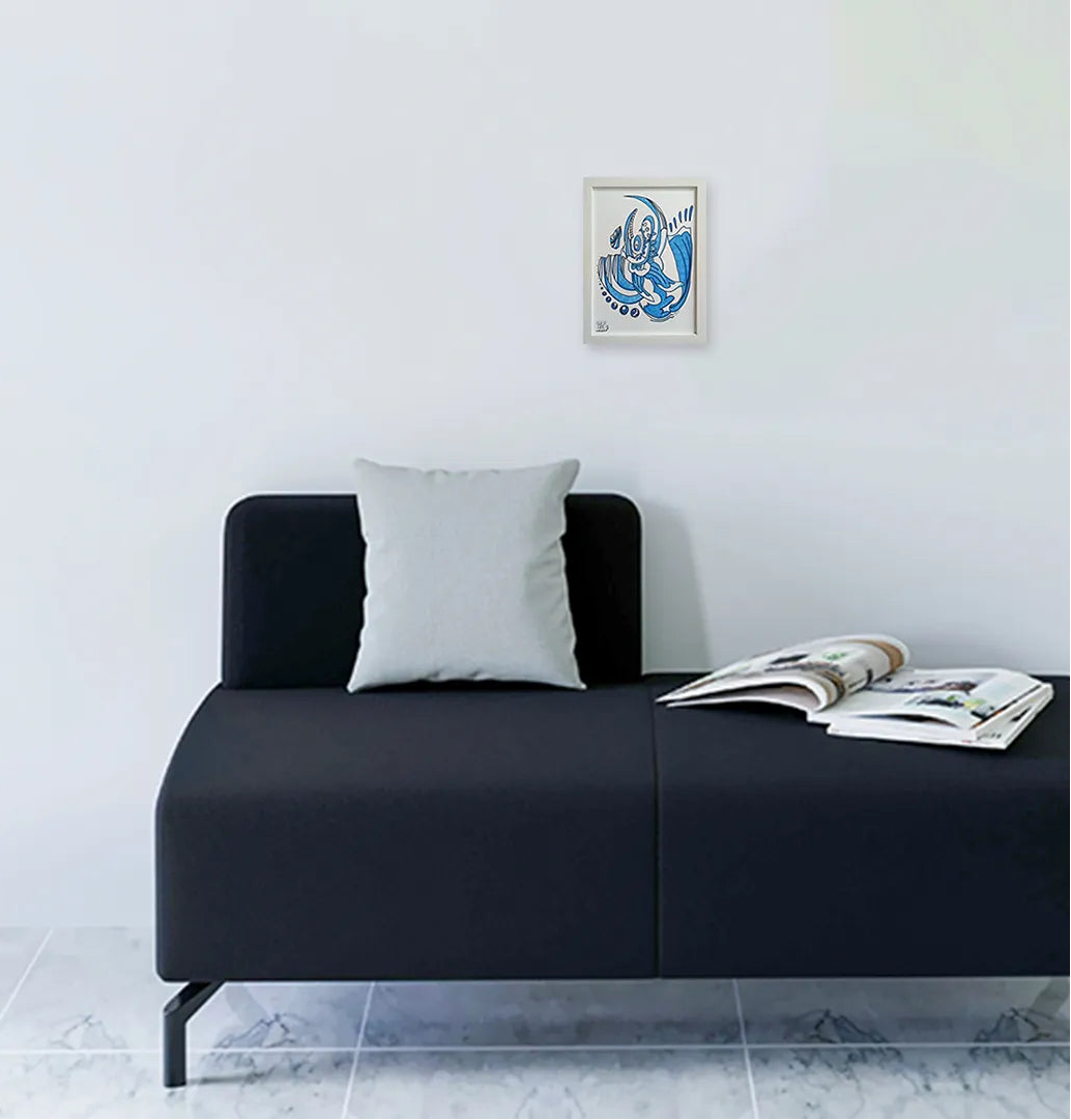 しなやかに弧を描く青の流れが、静かな躍動を感じさせます。海から立ち上る精霊のようにも、音楽に身をゆだねる舞踊にも見え、見る人の心をそっと波立たせます。壁に飾れば、室内に凛とした空気が生まれ、穏やかな集中を誘う空間へと変わります。モノトーンやブルーグレーを基調にしたインテリアと調和し、書斎やワークスペースにも心地よく寄り添います。