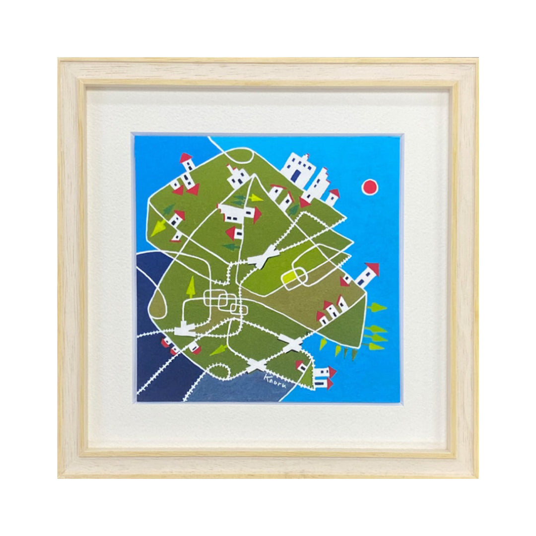 ハッキリとした色合いに、地球を連想するような緑のモチーフ。そこに可愛らしい家が並んでいます。のどかな風景が印象的です。