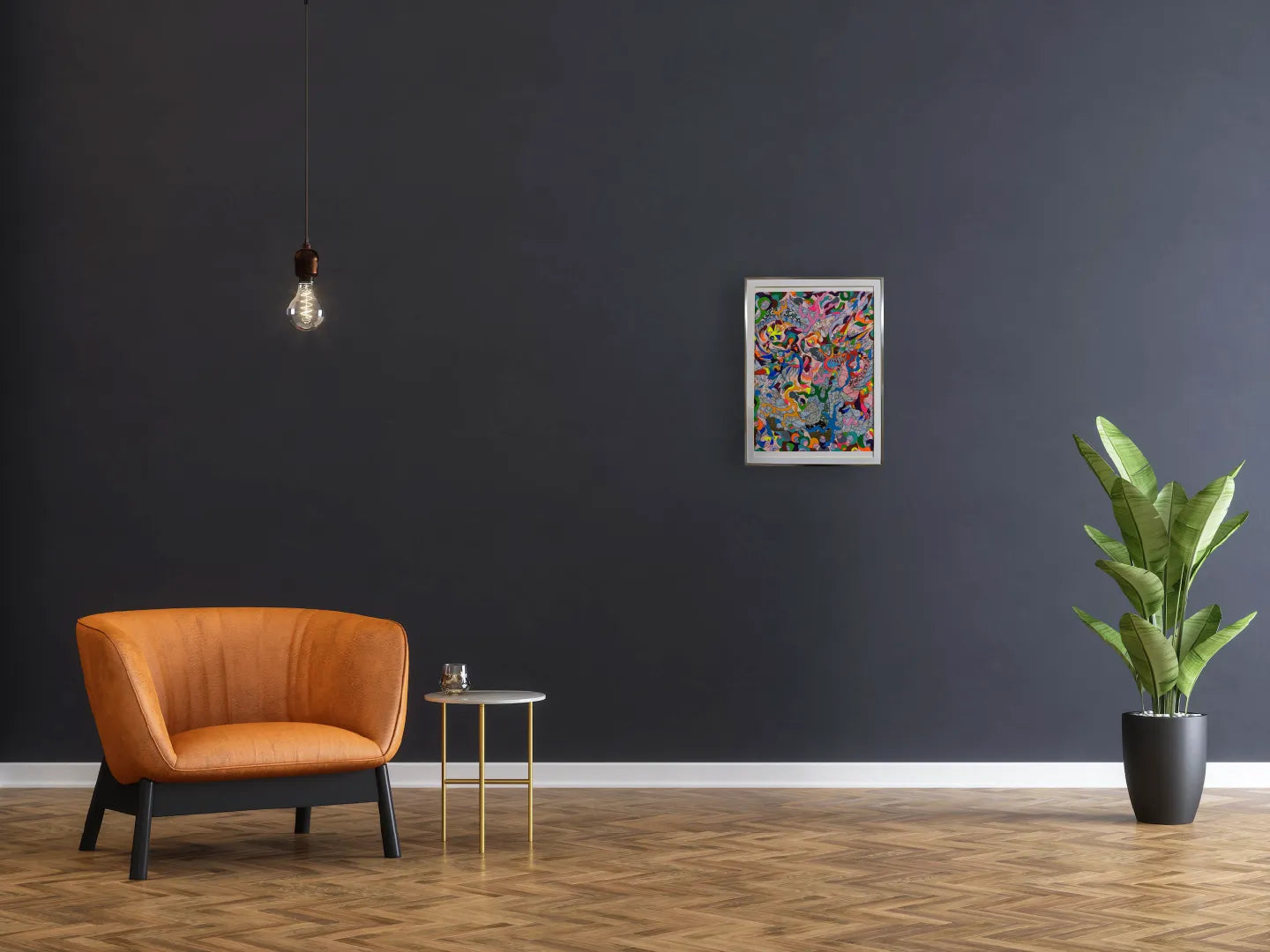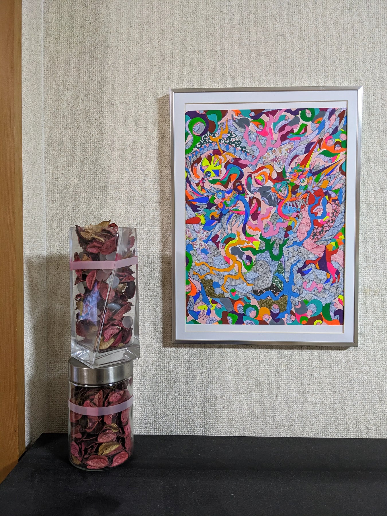 無数の色彩と線が絡み合い、有機的なうねりとなって画面全体に広がる作品です。一見すると奔放に見える構成の中に、緻密なリズムと重なりが潜み、視線は自然と奥へ奥へと導かれます。鮮やかな色と落ち着いた色調が交差することで、感情の揺れや思考の流れを映し出すような奥行きが生まれています。飾ることで空間に強いエネルギーと動きが加わり、日常の中に刺激と発見をもたらす一枚です。