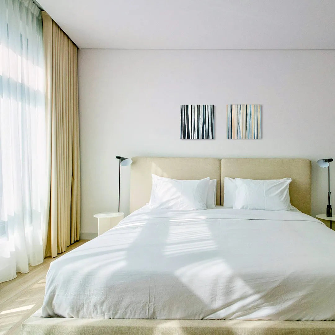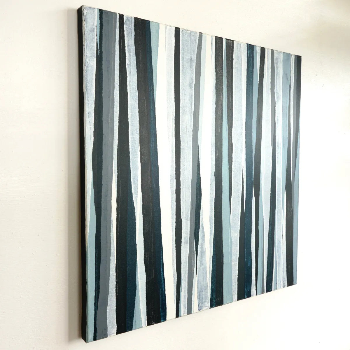 二枚のパネルに、深い藍や洗練された碧、温かなベージュが重なり、穏やかな海辺や、光を浴びる水面の移ろいを想起させます。異なる色彩が奏でる垂直の線は、眺めるほどに思考を澄み渡らせ、心に瑞々しい知性を届けてくれるでしょう。この象徴的な一作を飾ることで、壁面に洗練された奥行きが生まれ、空間を知的な感性で刷新します。書斎や応接間に、シンプルな調度品と設えるのが最適です。