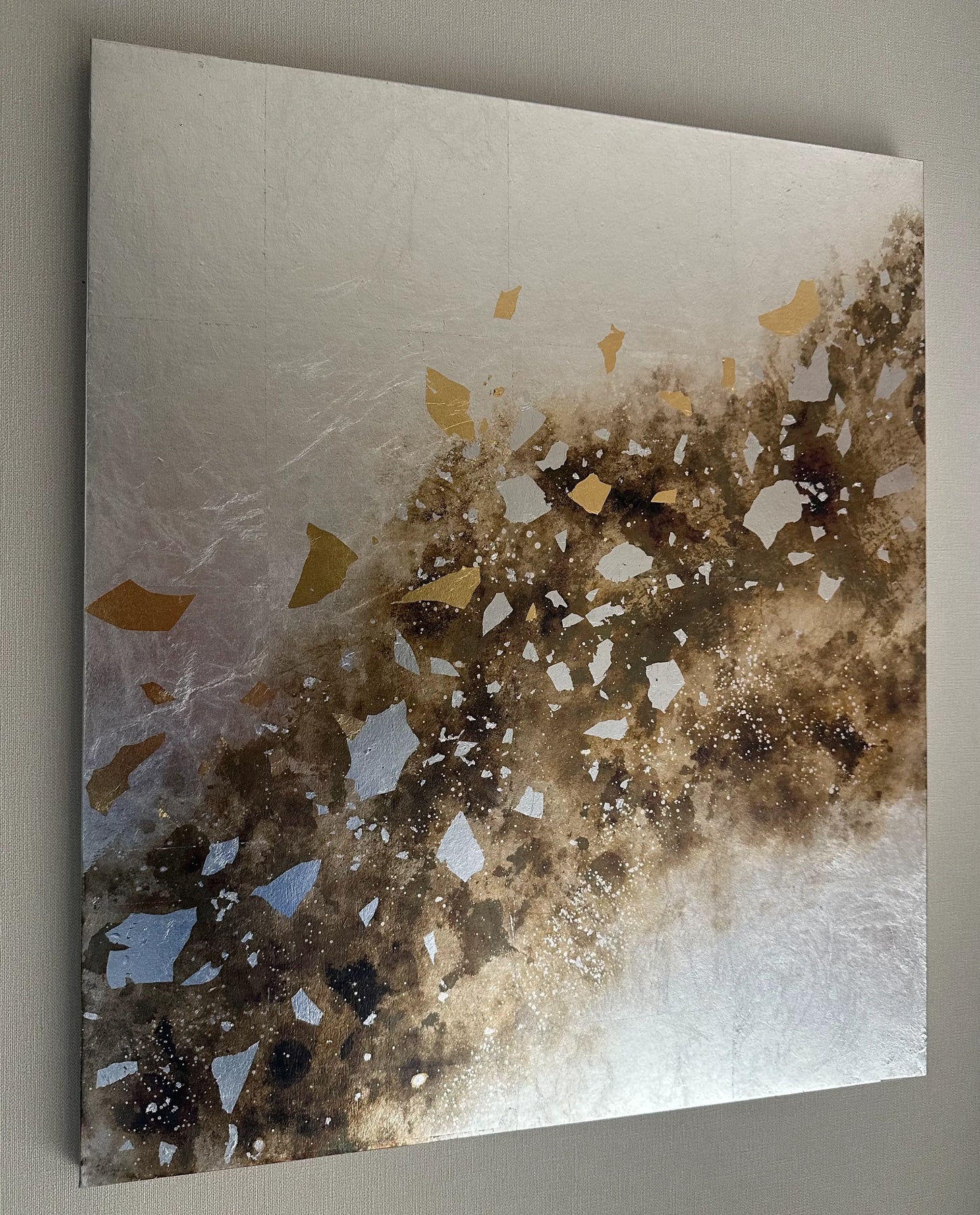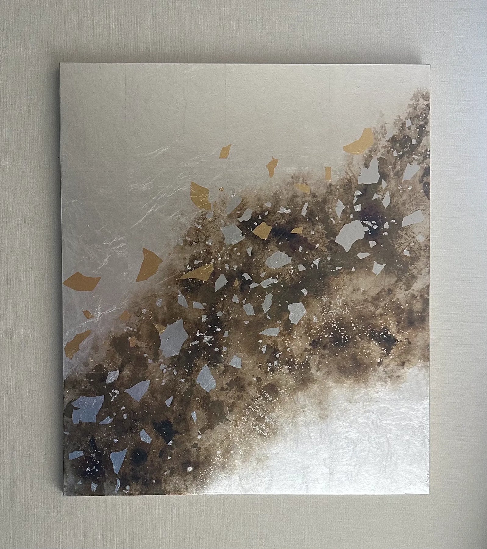 銀箔の静謐な地に、金や銀の破片が風に舞うように散りばめられ、大地の胎動や星々の瞬きを感じさせる崇高な情景を描いています。箔の輝きと深い褐色の対比は、眺めるほどに心を凛とした平穏で満たし、日々の暮らしに高潔な潤いを届けてくれるでしょう。この気品ある一作を飾ることで、壁面に瑞々しい奥行きが宿り、空間全体を格調高い感性で刷新します。寝室や応接間に、落ち着いた調度品と設えるのが最適です。