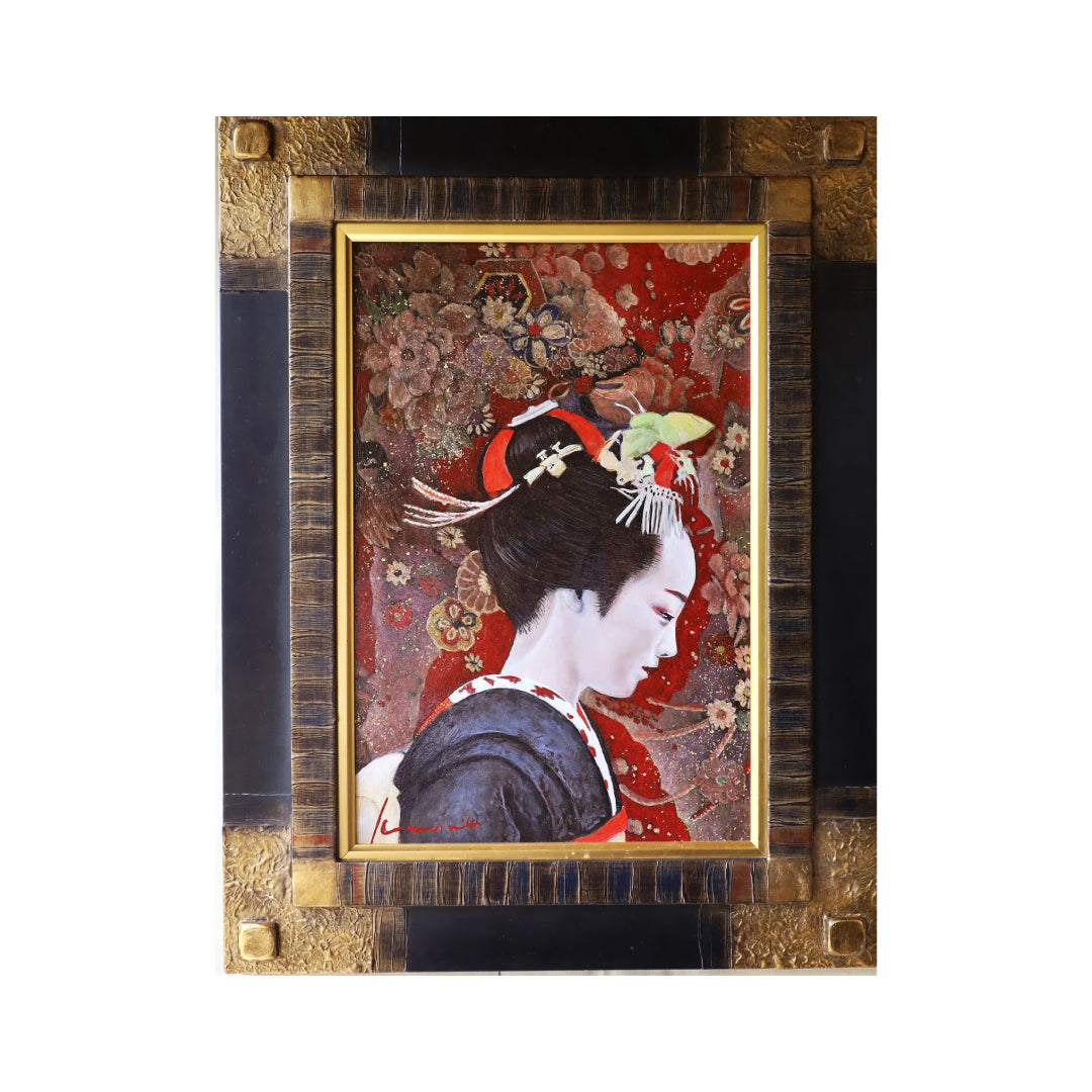 花街に憧れ、舞妓となったばかりの少女を描いた作品です。喜びと不安、そして緊張が入り混じる複雑な表情が見る人の心を惹きつけます。これから花街で生きていく少女の、希望に満ちた未来を感じさせる作品です。リビングや玄関に飾ると、初々しさと希望に満ちた空間を演出してくれるでしょう。和モダンなインテリアや和風小物と合わせると、より一層趣のある空間になります。