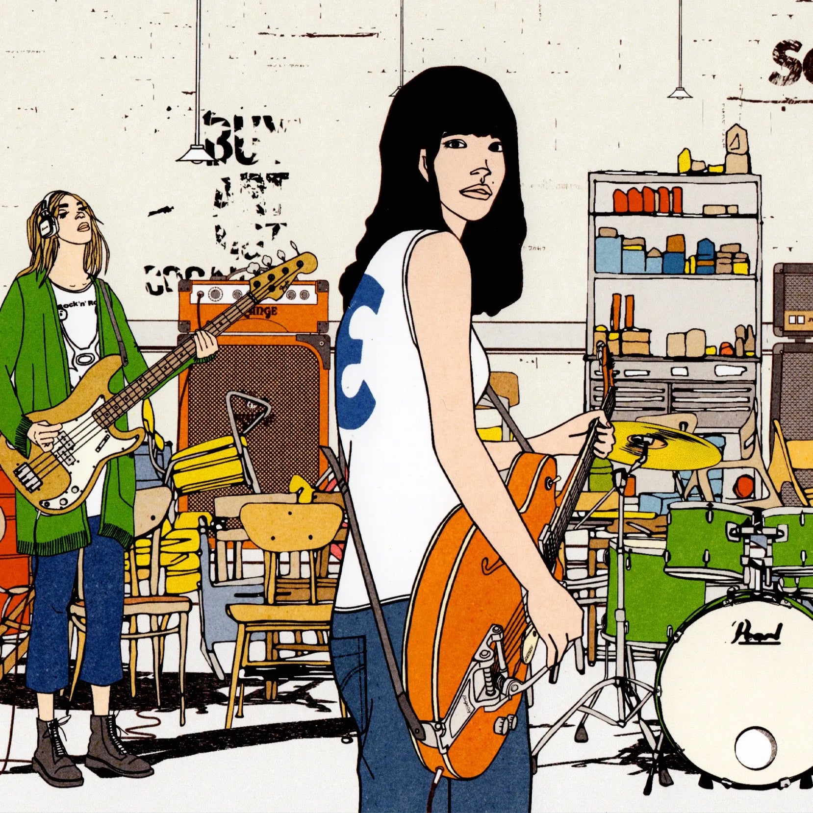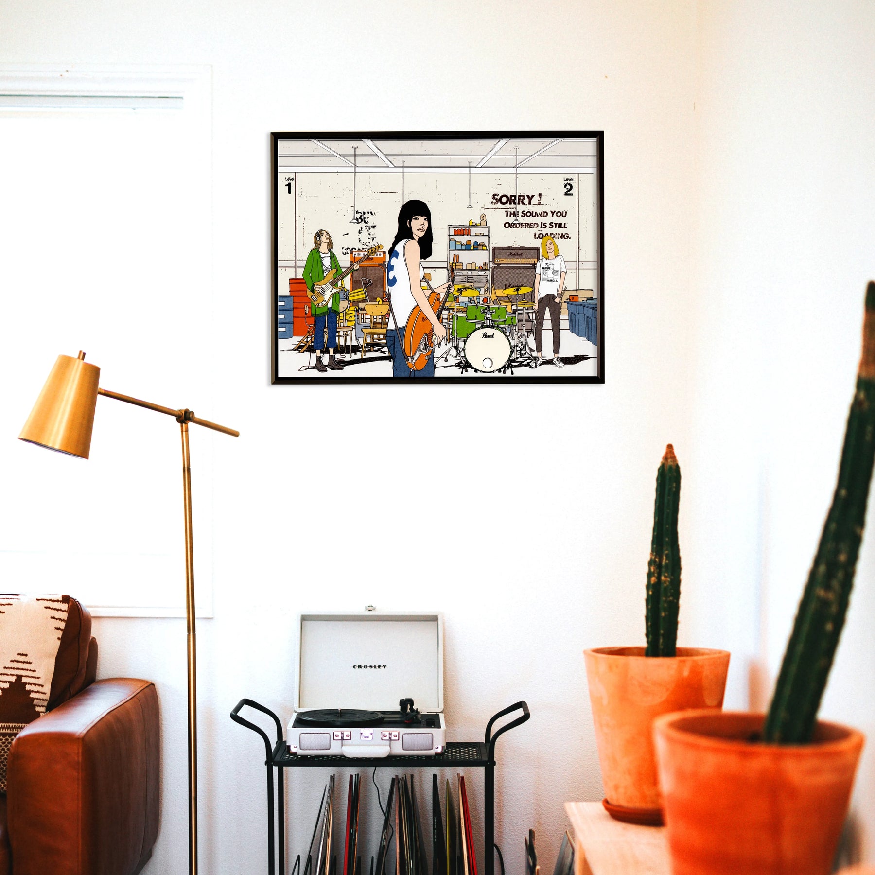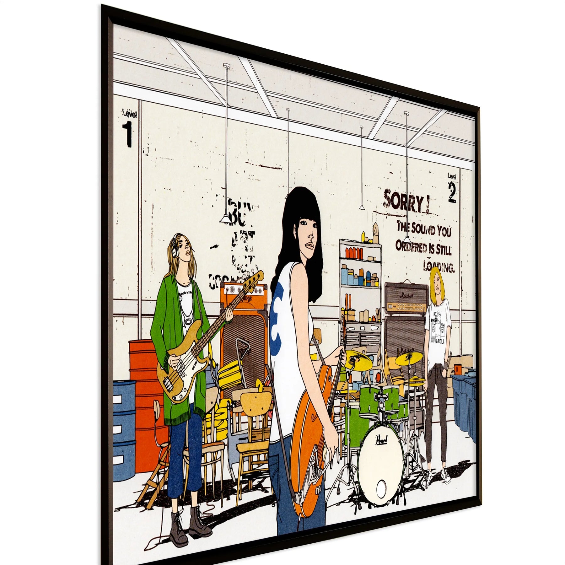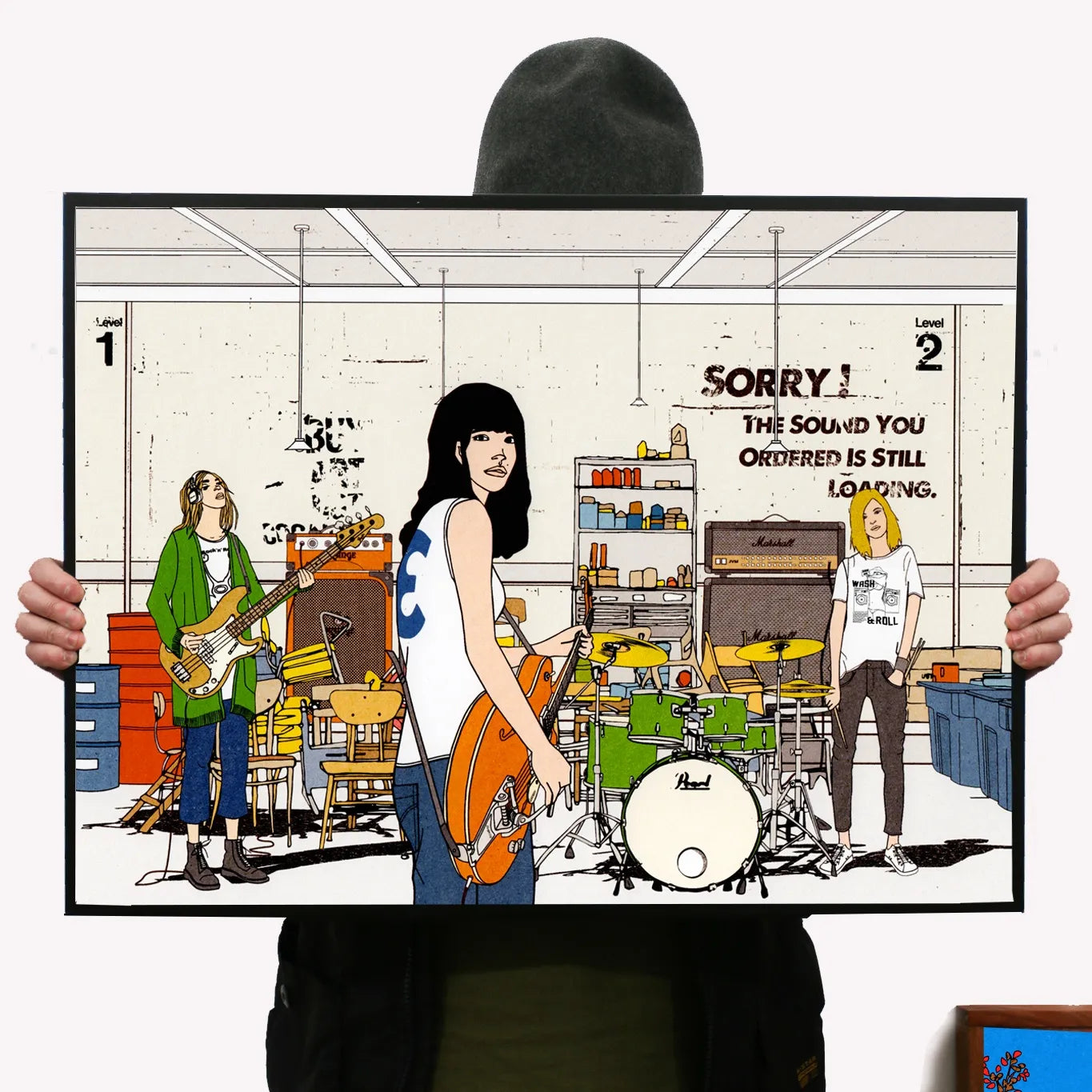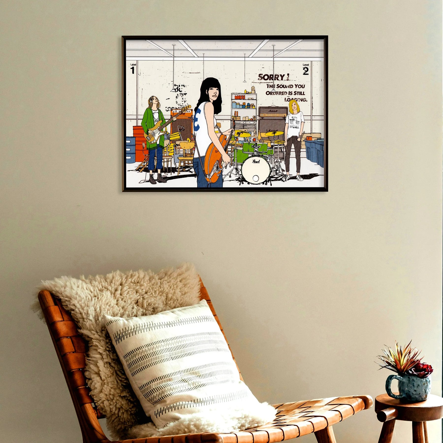 無機質な空間に立つ三人の姿が、始まり直前の高揚を運びます。線の強さと色の対比が、空気を震わせる予感を描き、視線は自然と中央へ集まります。壁に迎え入れると緊張感が程よいアクセントとなり、部屋の温度が少し上がります。音楽好きのリビングや作業机のある部屋、インダストリアルな家具とも心地よく響き合います。