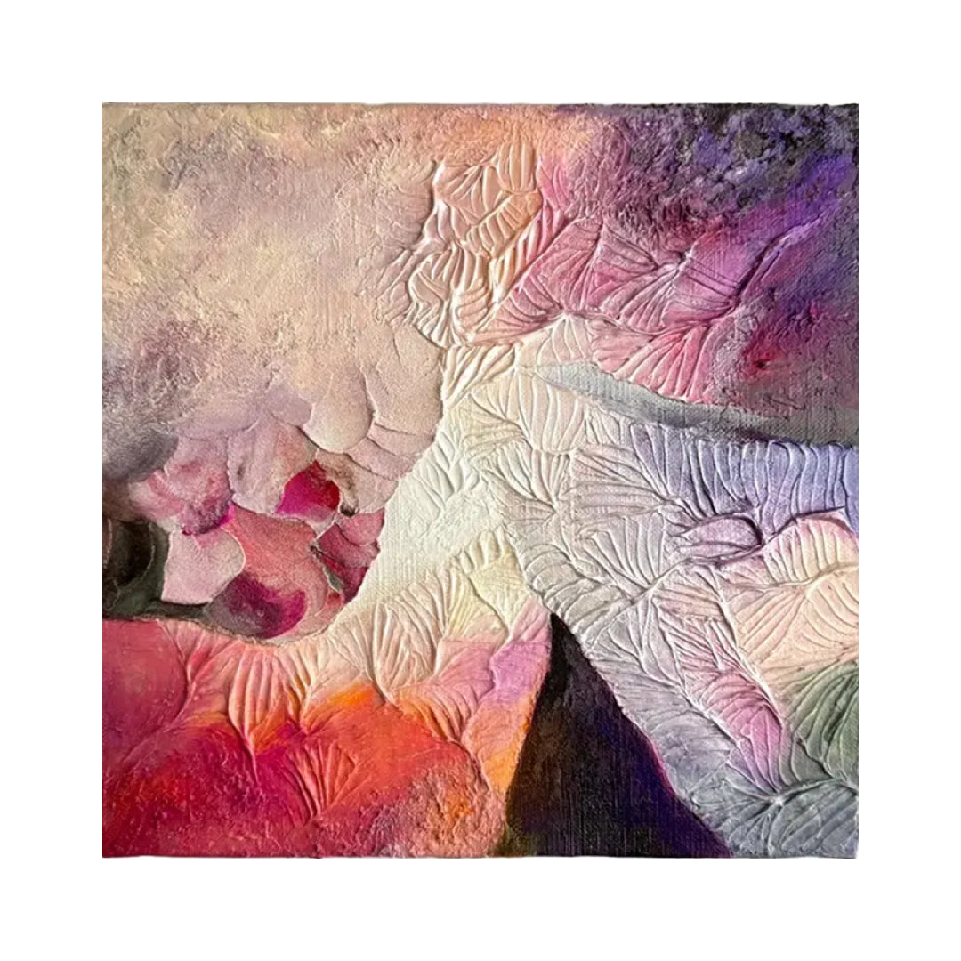 花びらのような質感が重なり合い、桃色から紫、淡い金へと移ろう色彩が、そっと光を包み込んでいます。触れたくなるほど立体的な陰影が、心の奥に穏やかな余韻を残します。壁にかけると、室内の空気がやわらかく溶け合い、光の角度によって異なる表情を見せてくれます。木の家具やリネンのファブリックと調和し、リビングや寝室に静かなぬくもりを添えます。