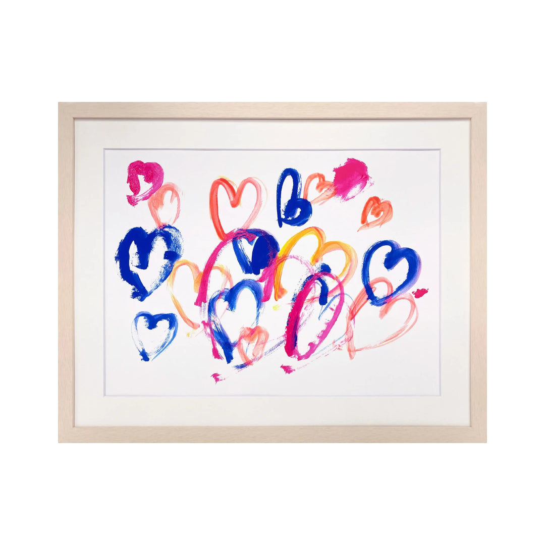 鮮やかなハートが躍る、ポップで遊び心あふれる一枚。ピンク、ブルー、オレンジなど多彩な色彩が軽やかに重なり合い、空間を明るく彩ります。リビングや子ども部屋に飾れば、楽しく心温まる雰囲気に。