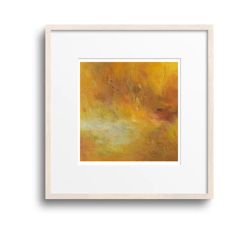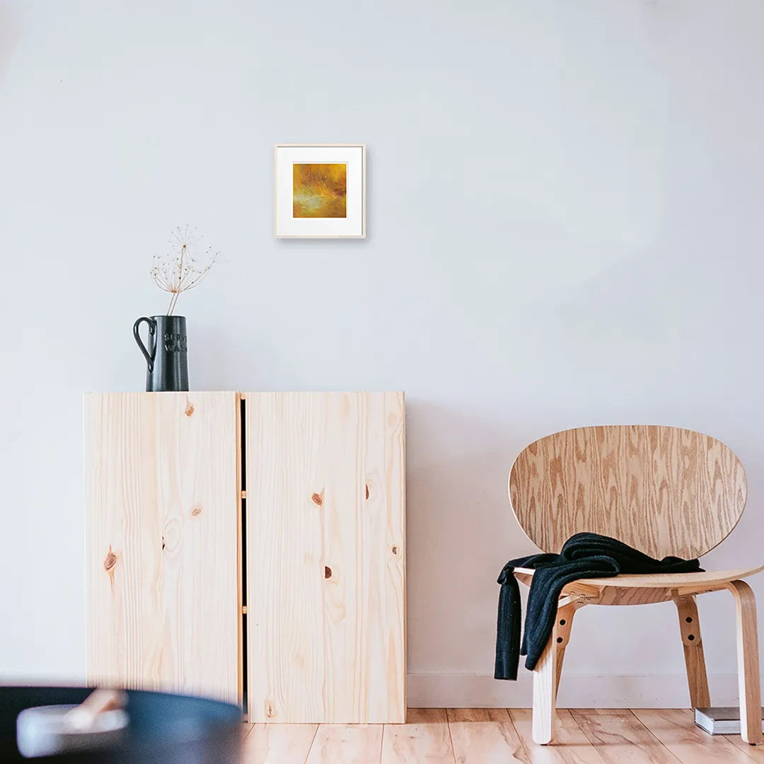 橙から金へと溶け合う色彩が、穏やかな陽光に包まれた午後を思わせます。筆致の中に微かな揺らぎがあり、眺めていると心の奥にぬくもりが灯るようです。壁にかけると空間全体がやわらかく明るさを増し、自然光と響き合いながら穏やかな時間を運びます。リビングやベッドサイドなど、くつろぎの場所にそっと彩りを添えてくれます。