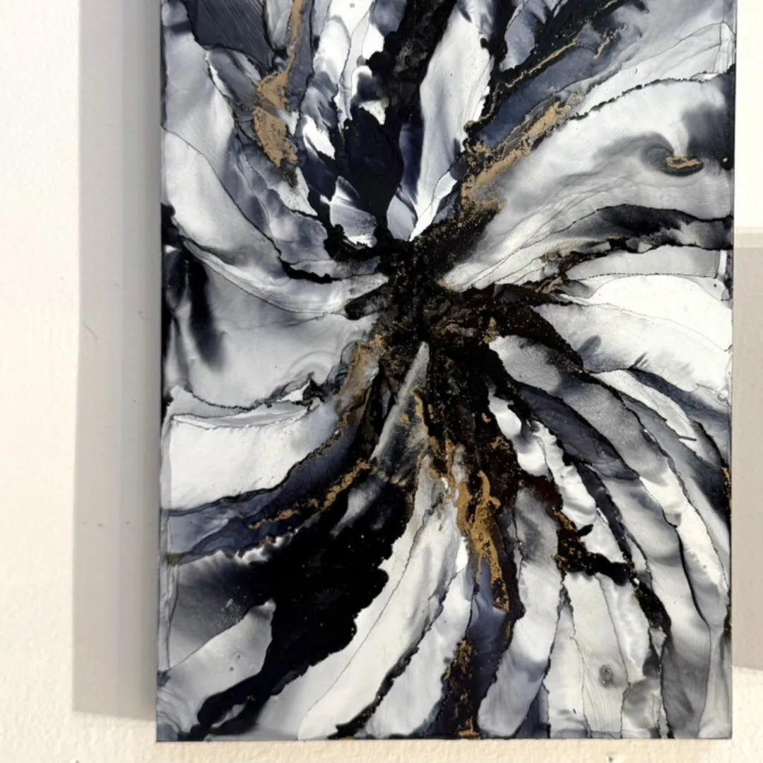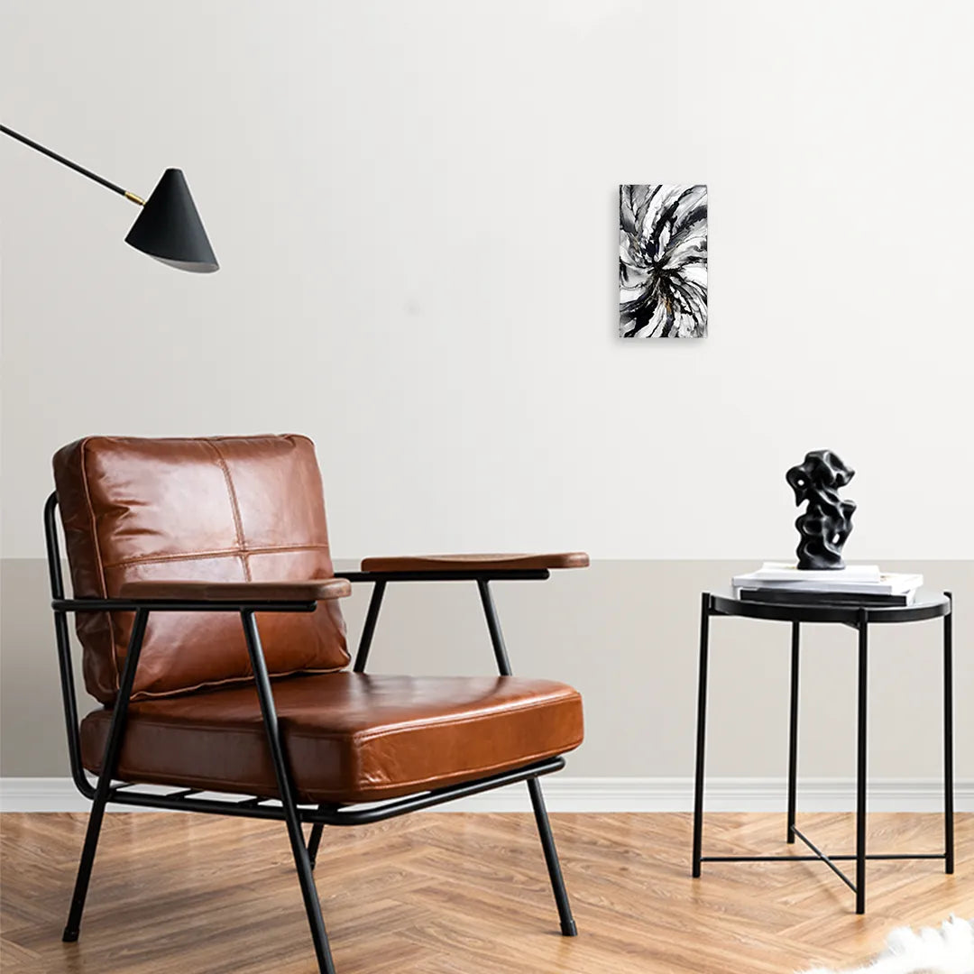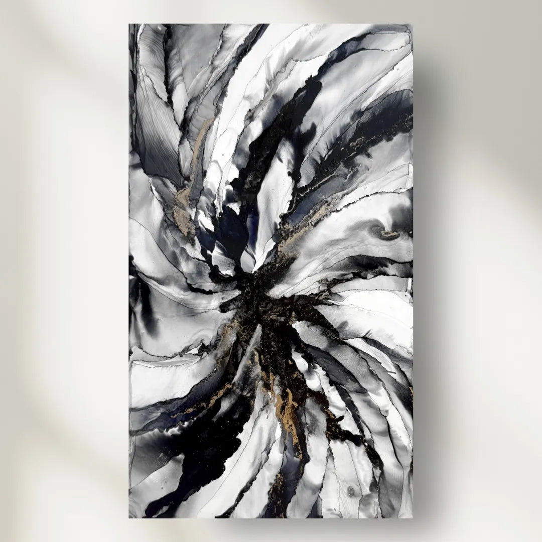 白と黒が渦のように交わり、内側から放たれるエネルギーが画面全体に脈打つようです。艶やかな質感と深みのある陰影が、金属の輝きにも似た静かな強さをまとい、見る人の感覚を研ぎ澄ませます。壁に掛けると、空間が凛と引き締まり、時間の流れが静かに整うようです。モダンなリビングや落ち着いた書斎の一角で、その存在感が静かに際立ちます。