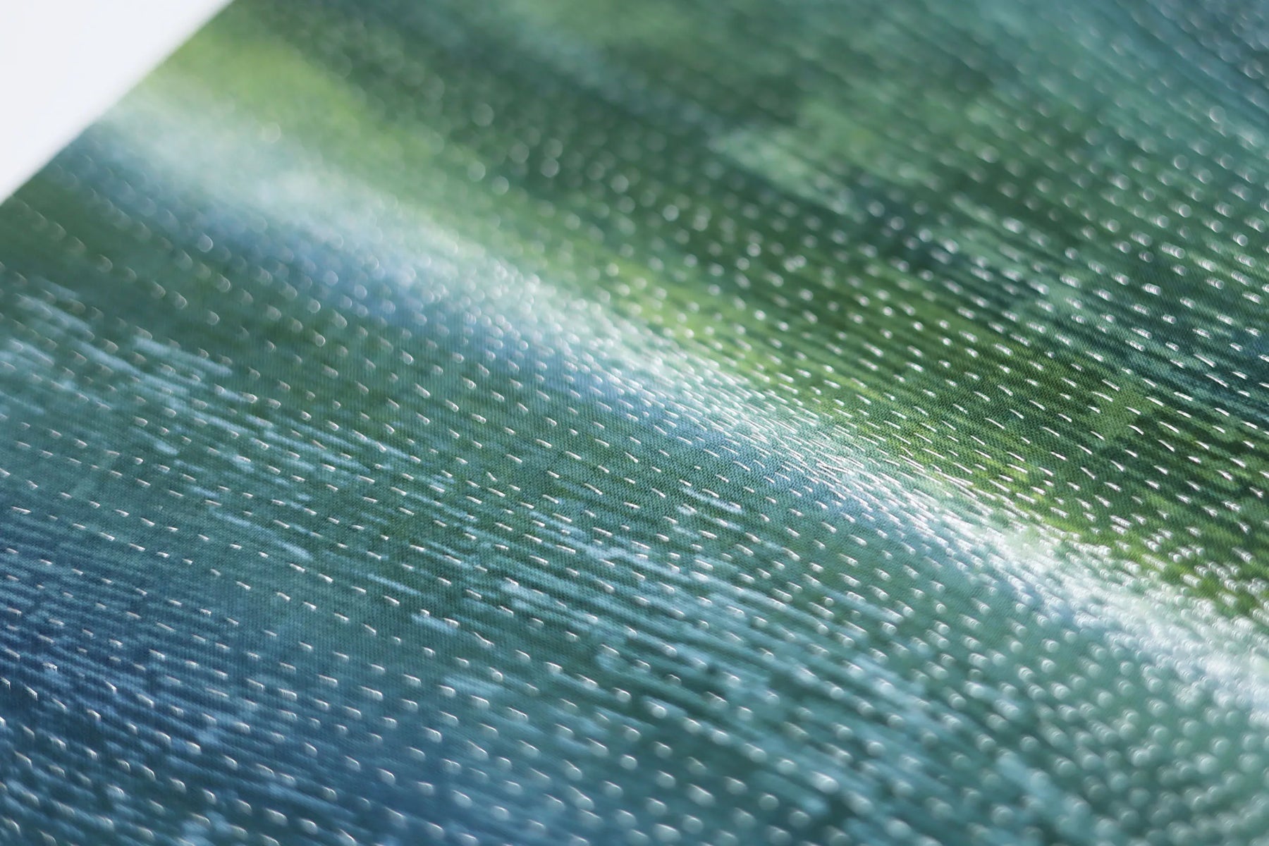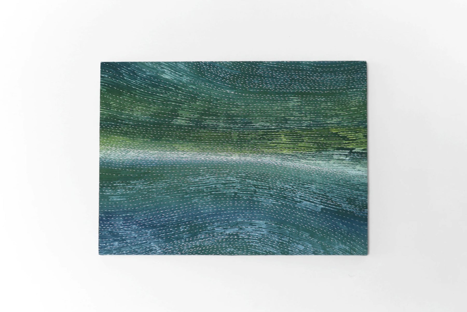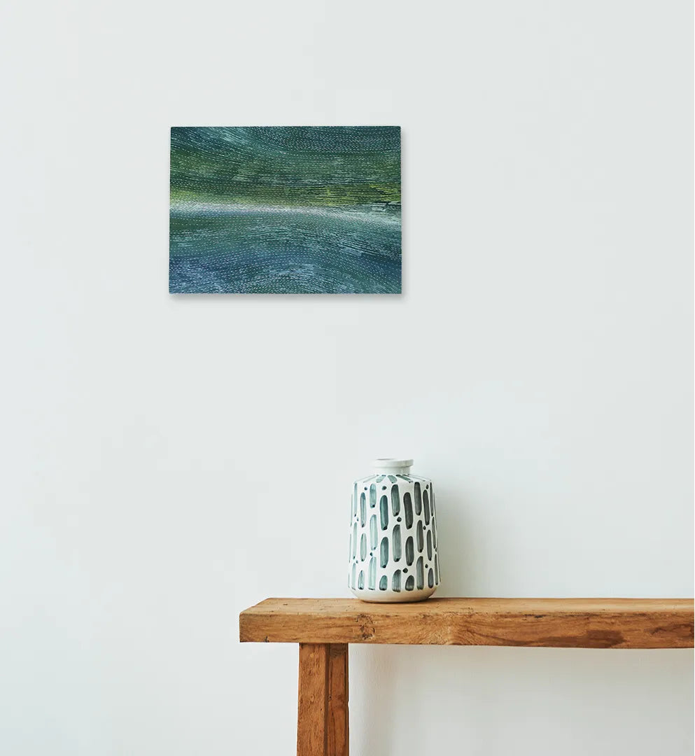 深い碧と淡い緑が交わり、風に揺れる水面のような律動が広がります。細やかな線が流れを描き、視線を静かに導くその表情は、穏やかな呼吸を感じさせます。壁にかけると、空間に澄んだ透明感が生まれ、時間の流れまでもやわらかく変えてくれます。木の温もりを感じるリビングや、心を整える書斎にも心地よく溶け込みます。