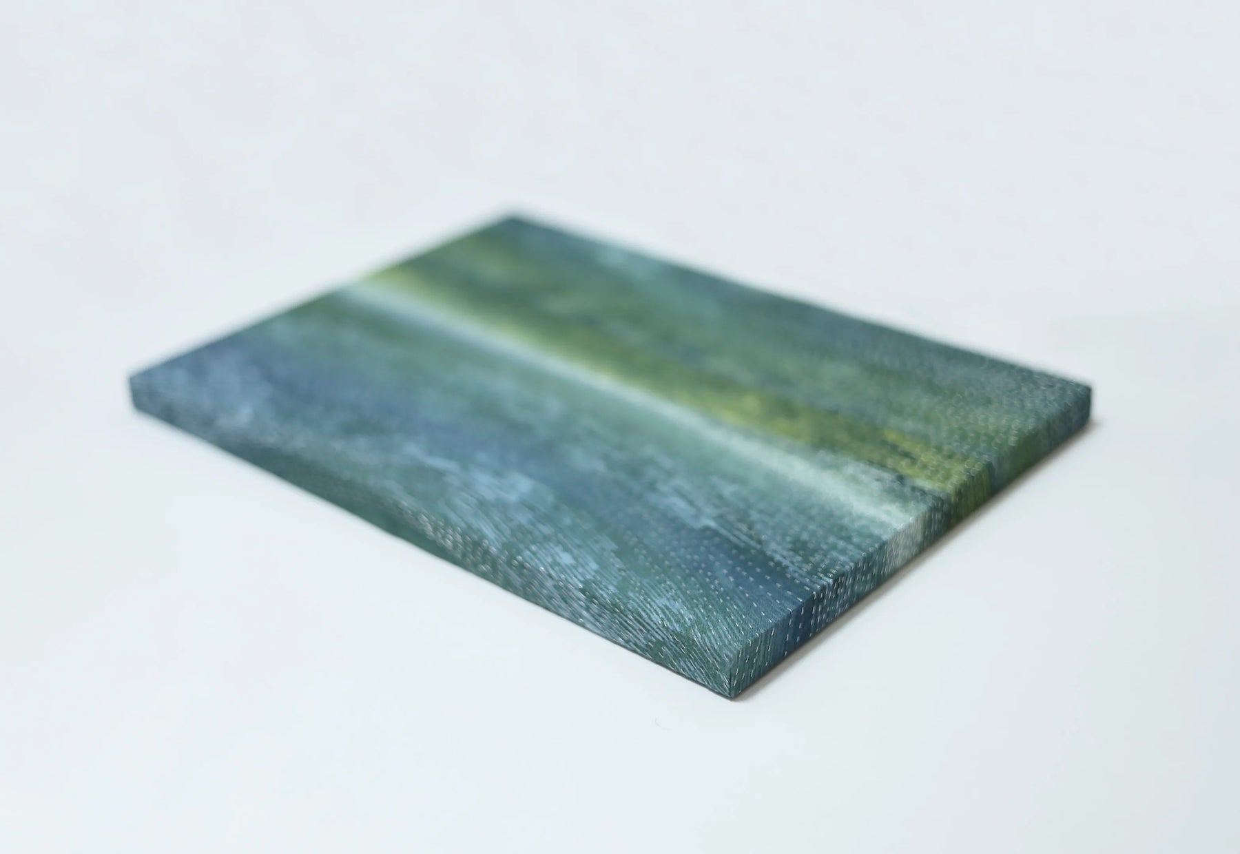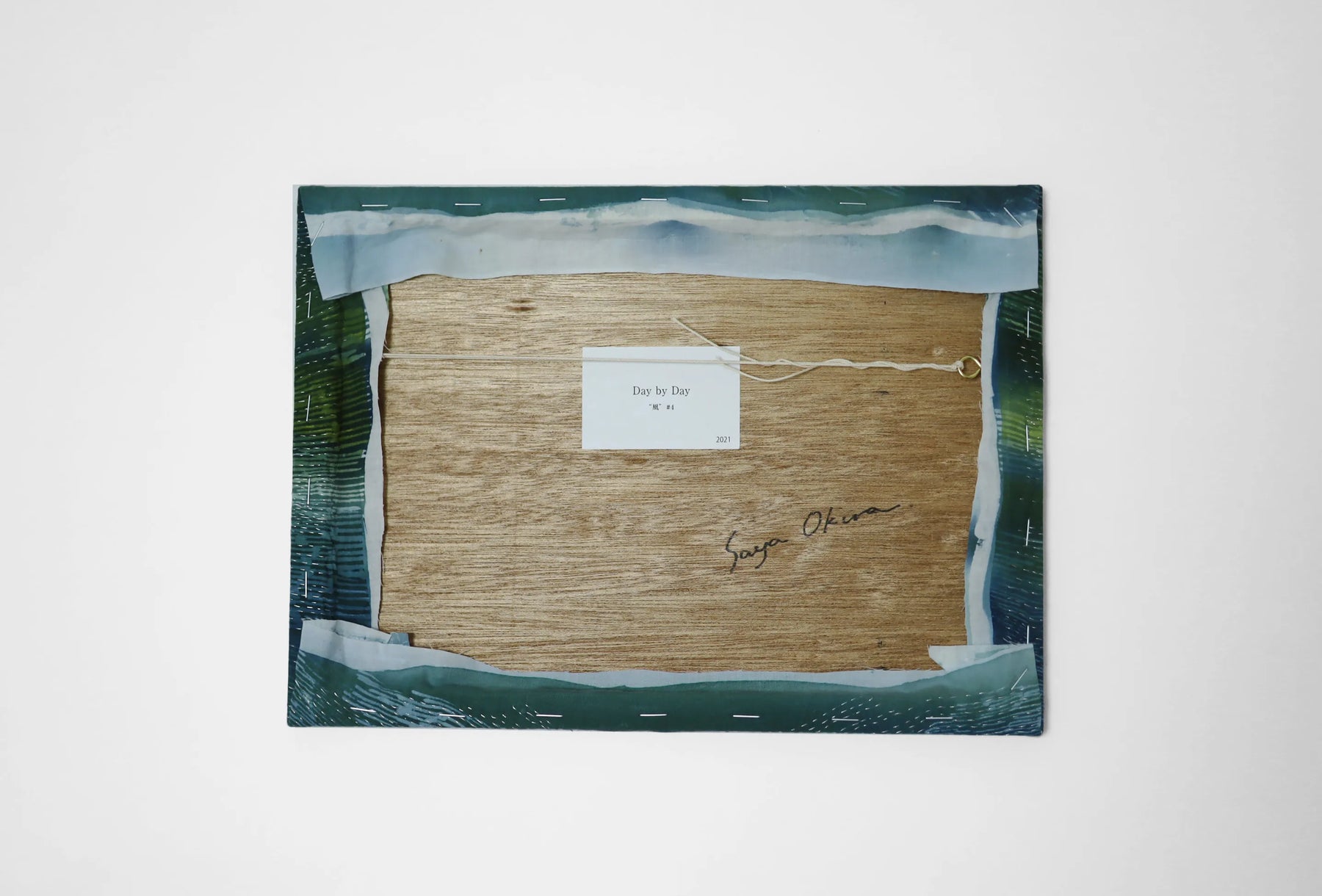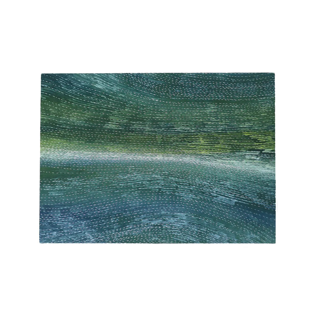 深い碧と淡い緑が交わり、風に揺れる水面のような律動が広がります。細やかな線が流れを描き、視線を静かに導くその表情は、穏やかな呼吸を感じさせます。壁にかけると、空間に澄んだ透明感が生まれ、時間の流れまでもやわらかく変えてくれます。木の温もりを感じるリビングや、心を整える書斎にも心地よく溶け込みます。