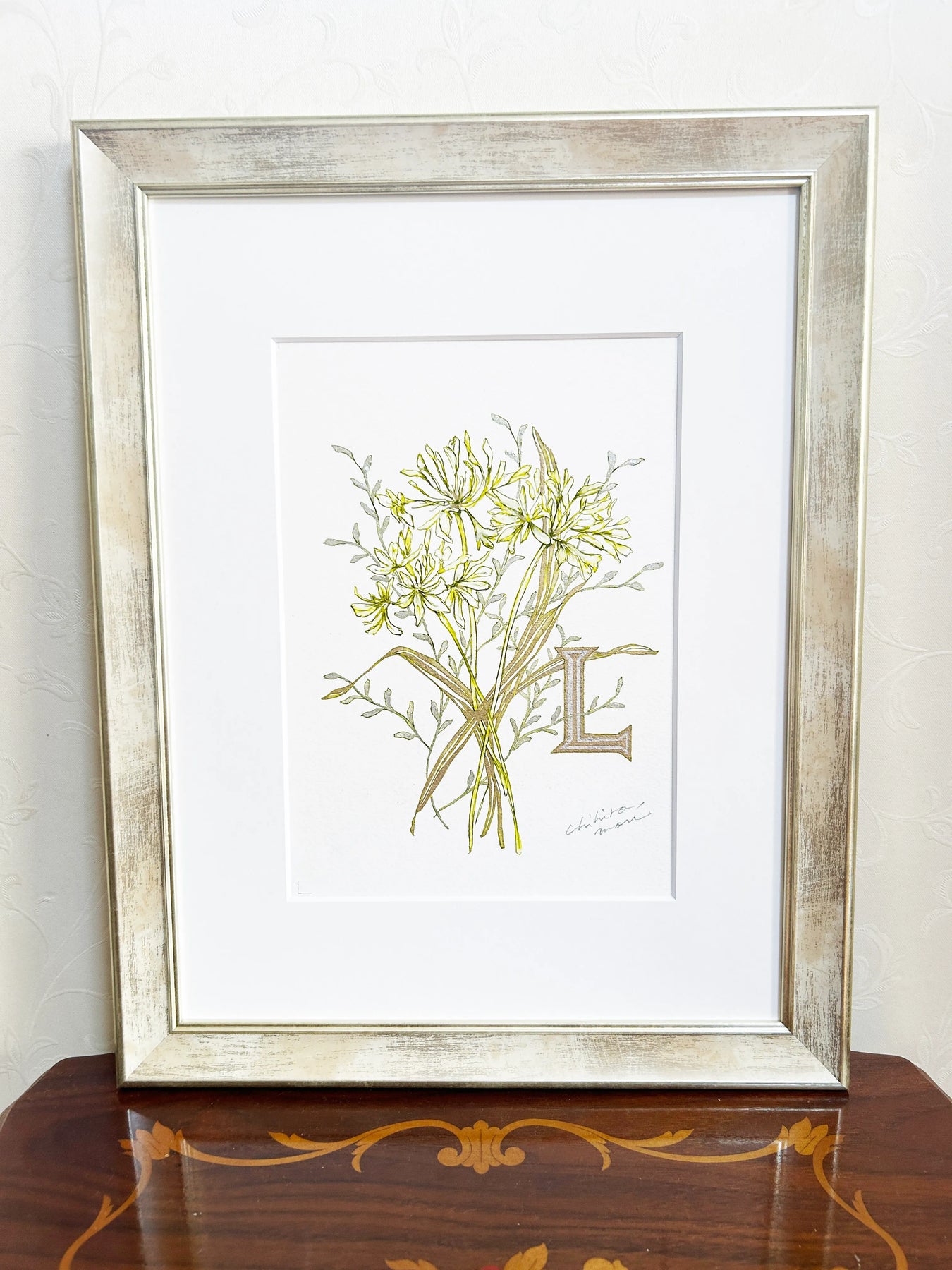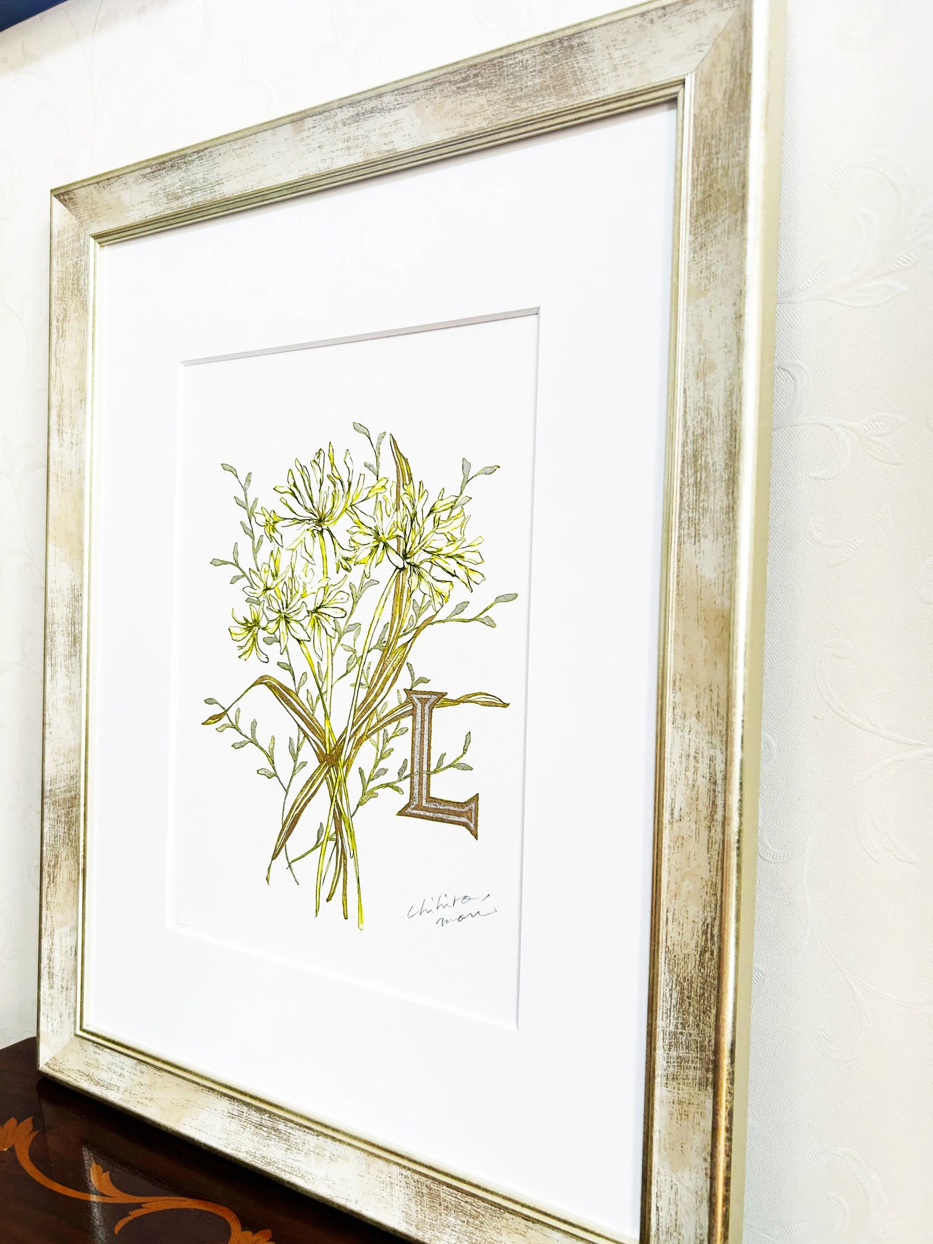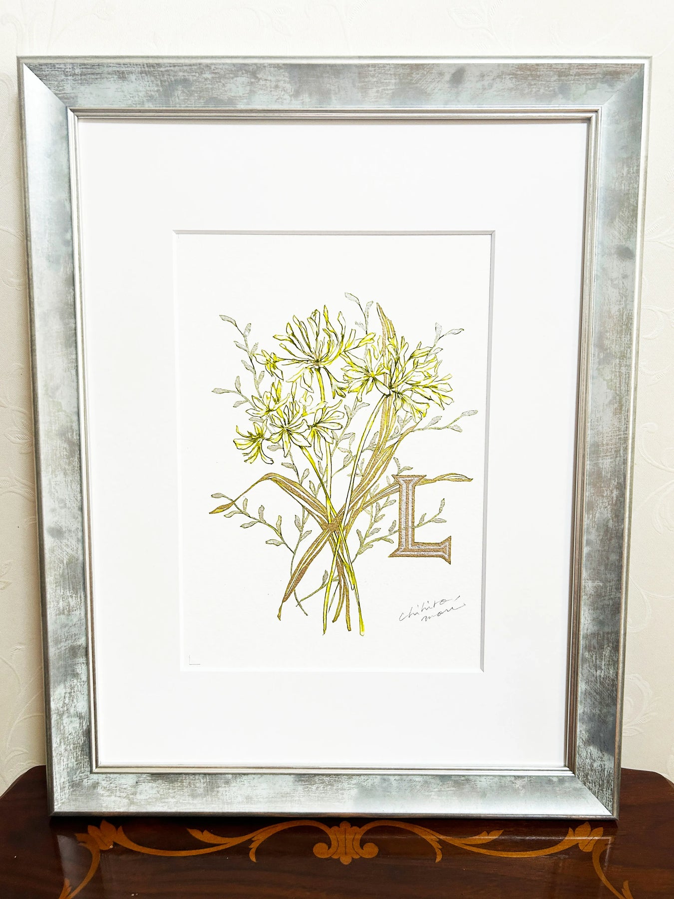 *こちらの作品は3タイプの額からお好きな額をお選びください。 *また、お好きな絵柄とお好きなアルファベット文字を入れることも可能です。 (御納品は発注から2週間後になります) FP‐Line はペンにインクを付け描いています。ペンから流れ落ちるインクの線は、時に軽やかに、時に偶発的にインクが滞留する線がとても魅力的です。 そんな線はどことなく私たちの日常にも似ています。軽やかに過ごせる日、時として立ち止る日、そんな日々の積み重ねがそれぞれの人生となり、軌跡となってゆく。 そんな線で描いた「アバカンサス」。アバカンサスの花言葉「誠実な愛Sincere love」の「L」を入れました。この作品が皆様の心にそっと寄り添い、作品を目にする度、心が軽やかになり、「誠実な愛」を感じていただければ幸いに存じます。 細かく入れた金箔、銀箔の光沢感も楽しんでいただければ幸いです。