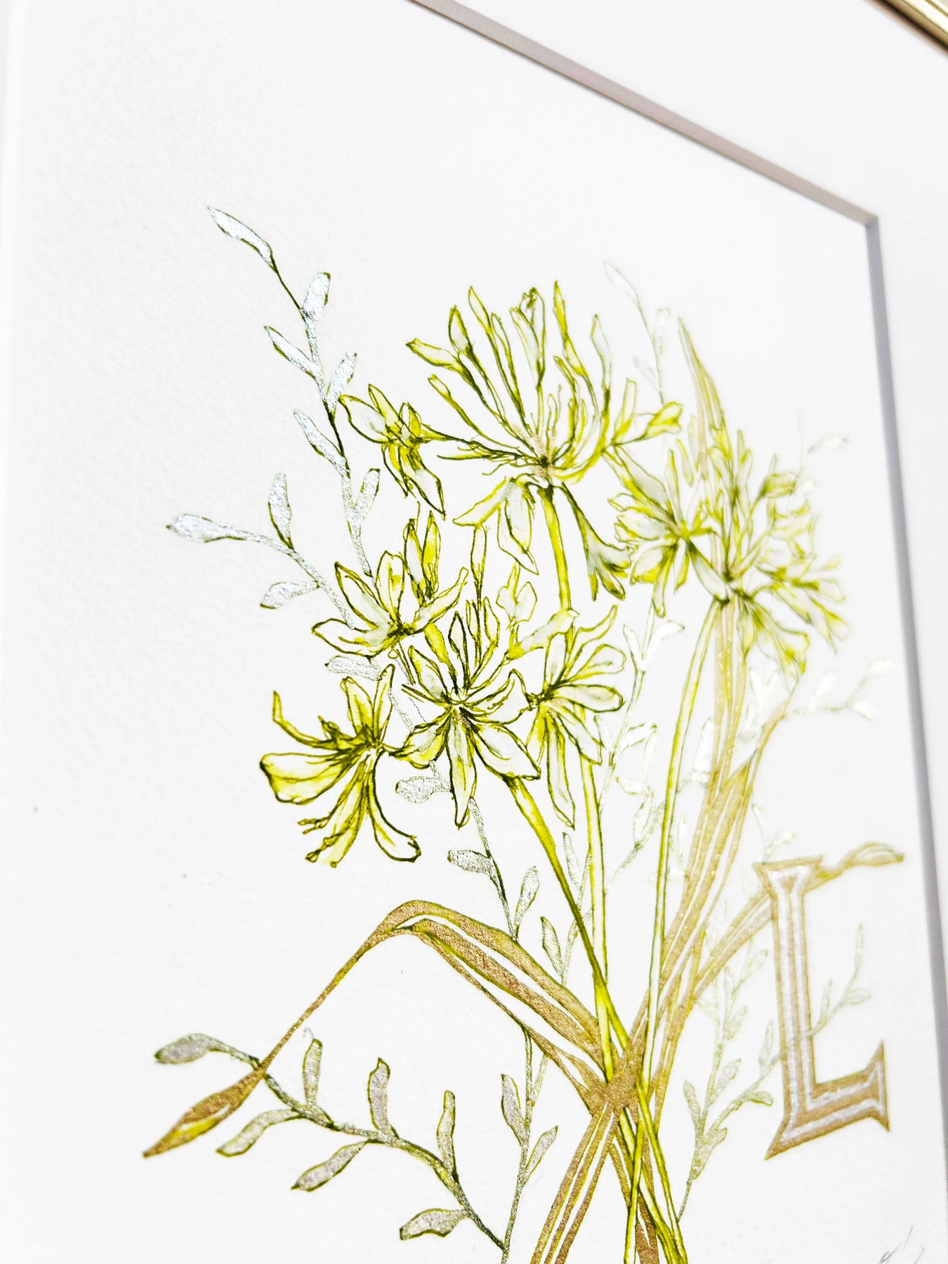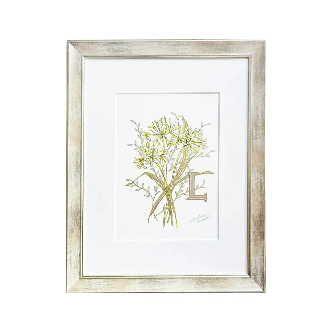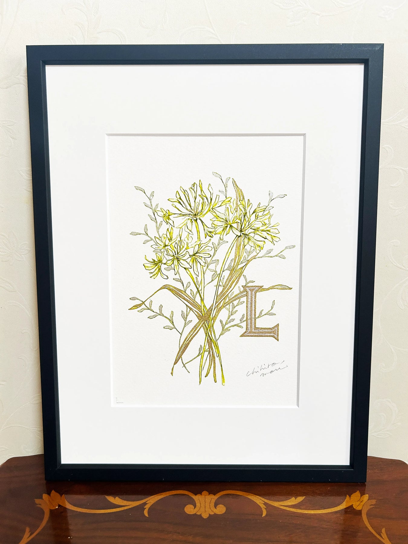 *こちらの作品は3タイプの額からお好きな額をお選びください。 *また、お好きな絵柄とお好きなアルファベット文字を入れることも可能です。 (御納品は発注から2週間後になります) FP‐Line はペンにインクを付け描いています。ペンから流れ落ちるインクの線は、時に軽やかに、時に偶発的にインクが滞留する線がとても魅力的です。 そんな線はどことなく私たちの日常にも似ています。軽やかに過ごせる日、時として立ち止る日、そんな日々の積み重ねがそれぞれの人生となり、軌跡となってゆく。 そんな線で描いた「アバカンサス」。アバカンサスの花言葉「誠実な愛Sincere love」の「L」を入れました。この作品が皆様の心にそっと寄り添い、作品を目にする度、心が軽やかになり、「誠実な愛」を感じていただければ幸いに存じます。 細かく入れた金箔、銀箔の光沢感も楽しんでいただければ幸いです。