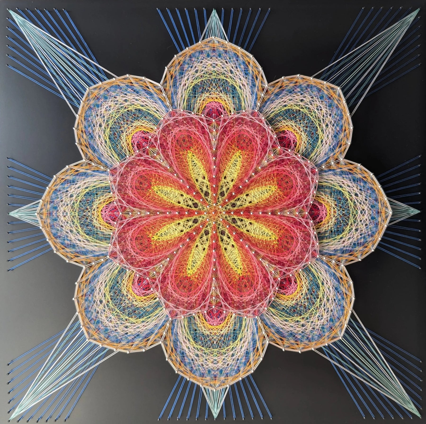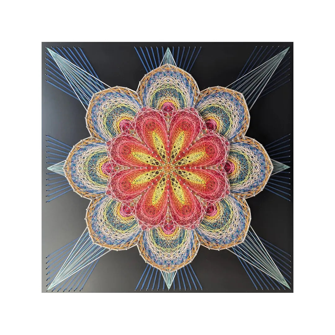 黒の背景に、色糸が重なり合い、花弁のような形を精緻に描きます。赤と黄の核は脈打つ心臓を思わせ、外周へ伸びる線は光の矢のように広がります。飾ることで視線が自然と集まり、空間に高揚と均衡が同時に生まれます。エントランスやダイニングに迎えると、モダンな照明や木質の家具とも鮮やかに響き合います。