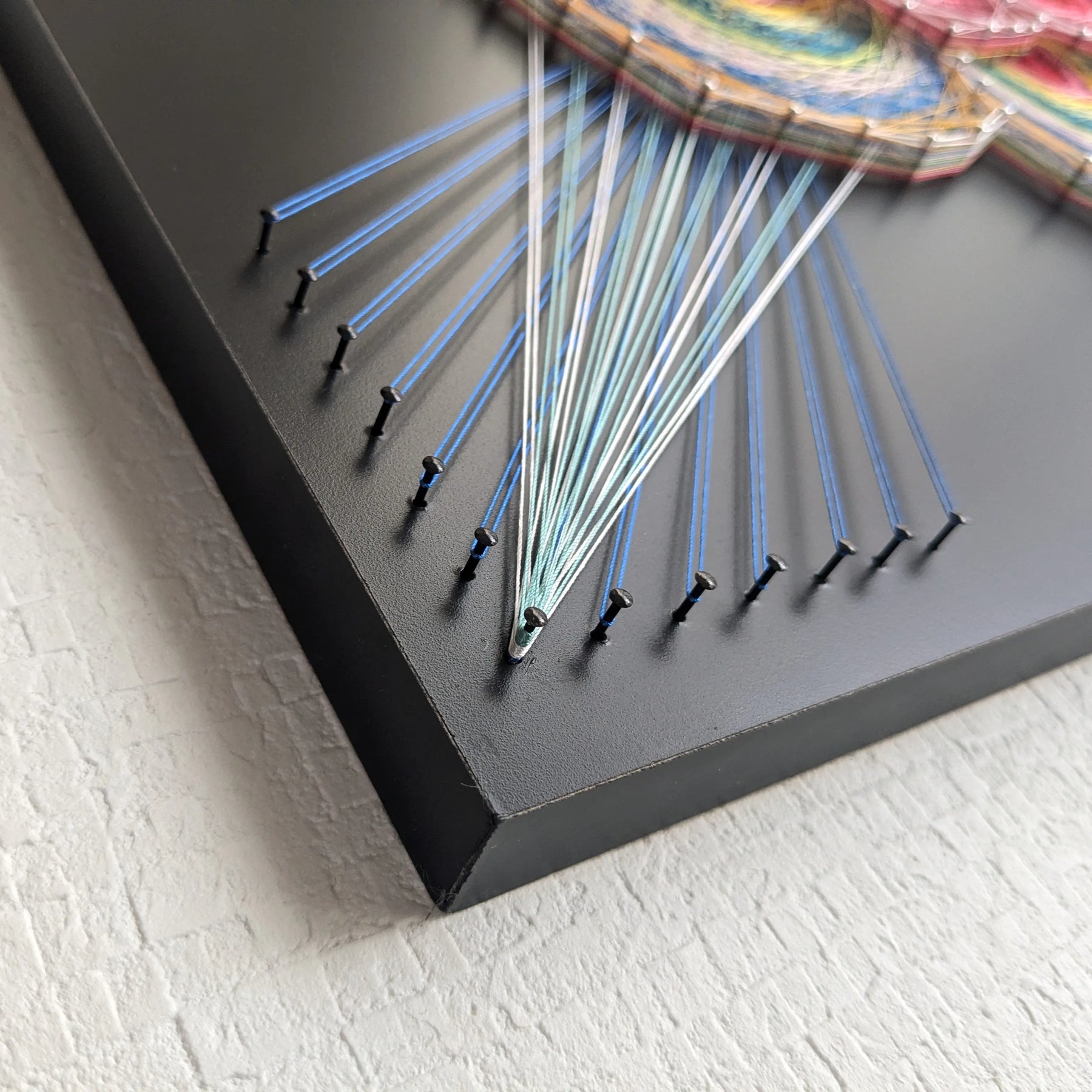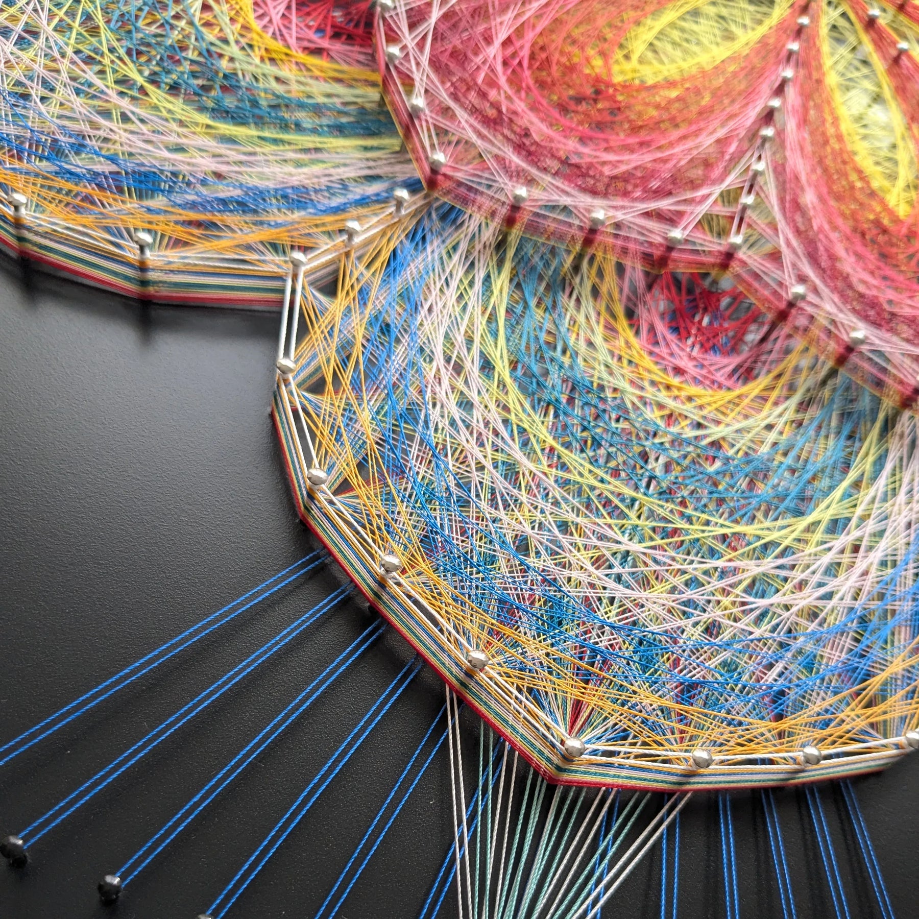 色鮮やかな糸が花のように重なり、空間いっぱいに広がる作品です。中心から放たれるリズムある輝きは、心を軽やかに揺らし、見る人に前向きなエネルギーと明るさを届けてくれます。
