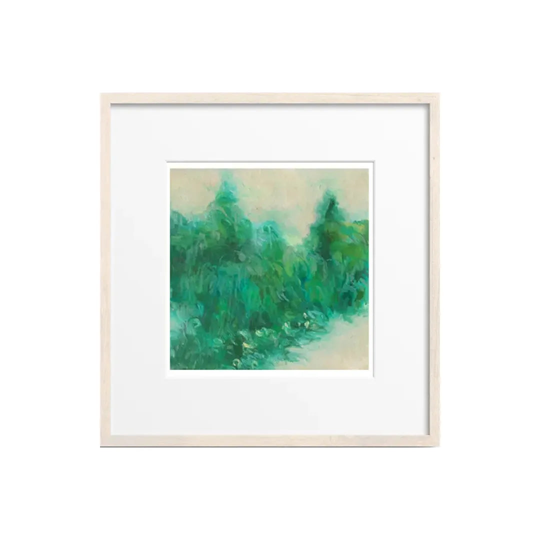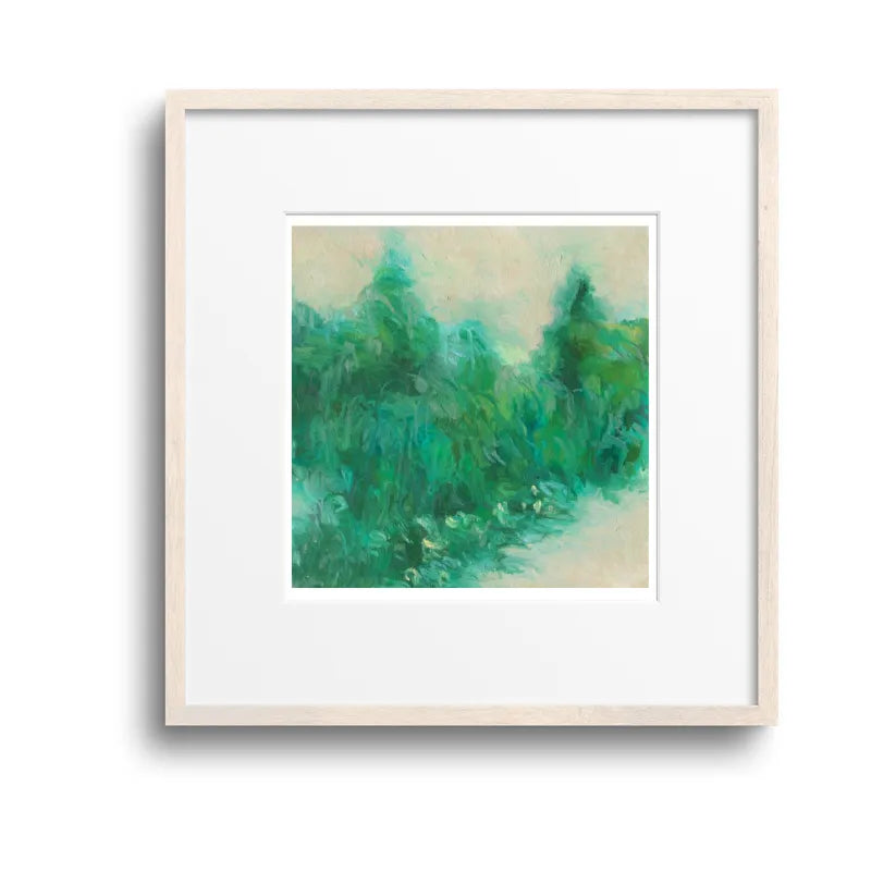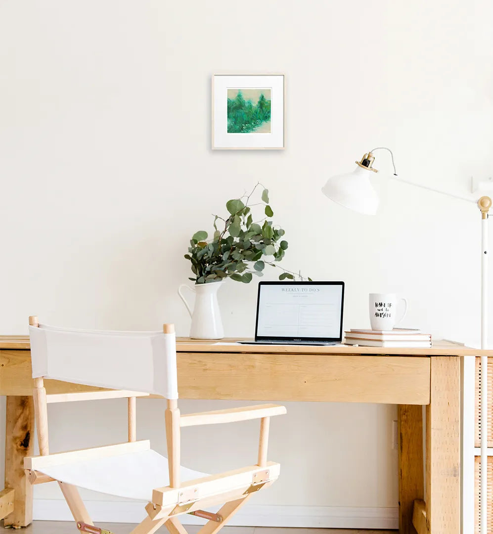 深い翠がゆるやかに重なり合い、遠くに霞む空の明るさが静かに溶け込んでいます。まるで風の通り道を描いたように、心の奥に涼やかな余韻を残します。壁に飾ると、空間に柔らかな透明感が生まれ、呼吸を整えるような穏やかさが満ちていきます。木の質感を生かしたリビングや、落ち着いた書斎にも心地よく溶け込み、日常に静かな潤いを添えます。