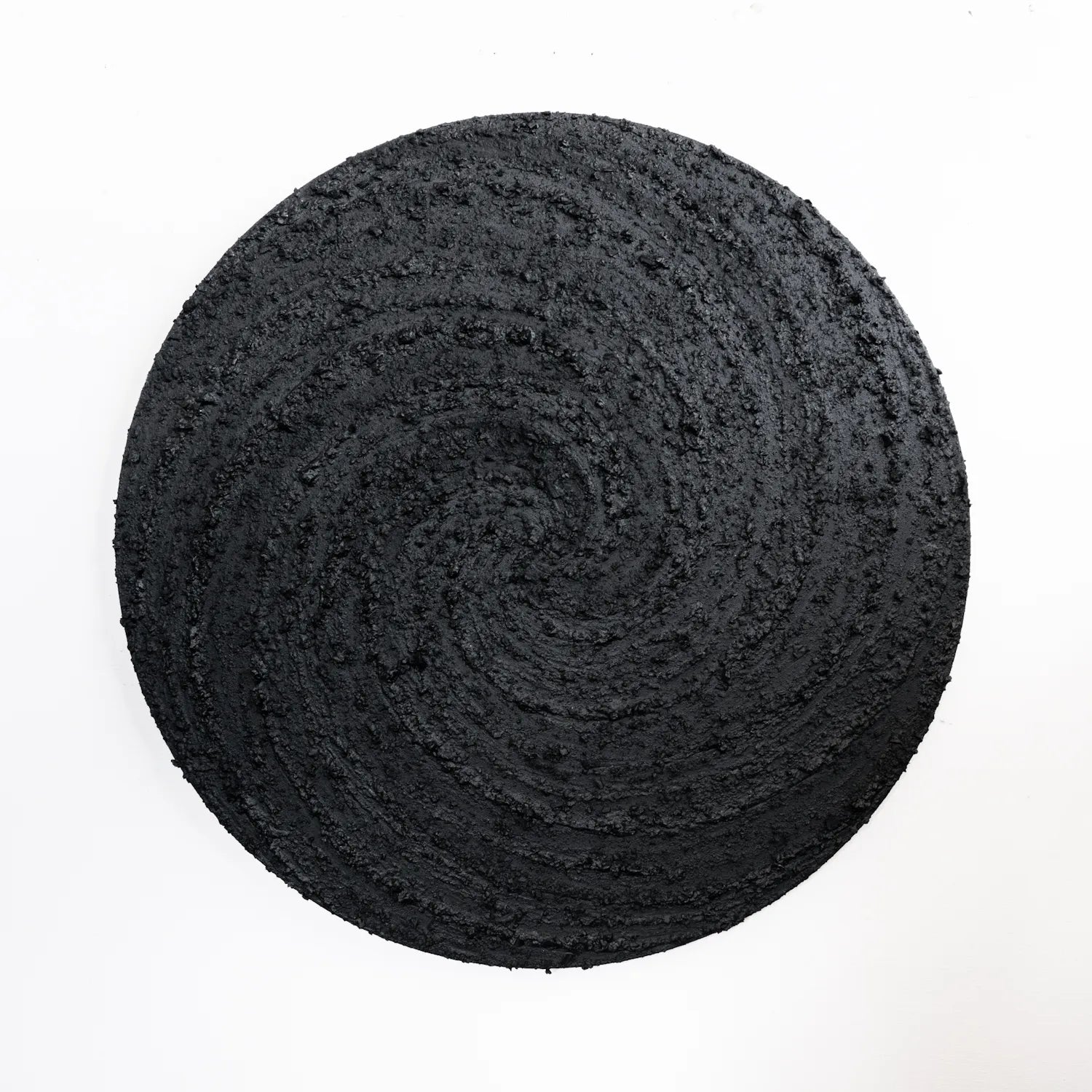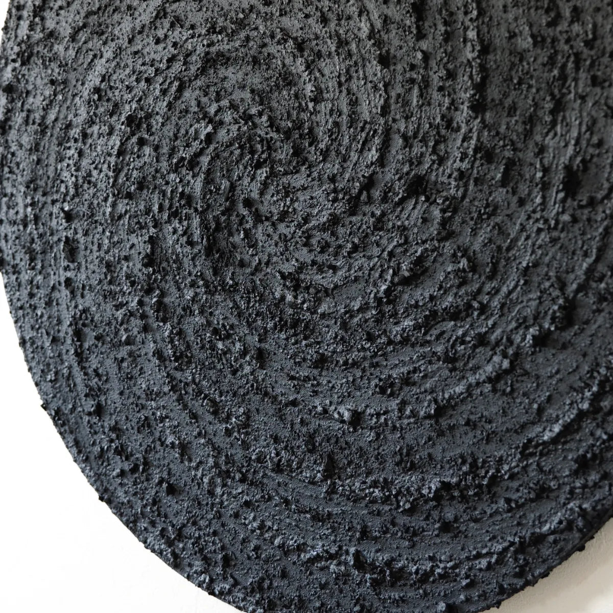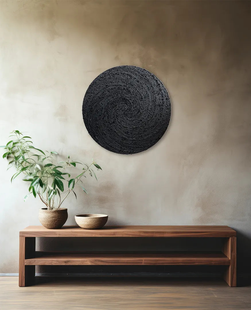 深い黒が円の中で静かにうねり、見つめるほどに吸い込まれるような奥行きを感じます。ざらついた質感が光を柔らかく捉え、静かな波動となって心に響きます。壁に掛けると、空間に凛とした緊張感と穏やかな力が共存し、時間の流れを緩やかに変えてくれます。モダンなリビングや落ち着いたギャラリースペースにも自然に溶け込み、空気そのものに深みを添えます。