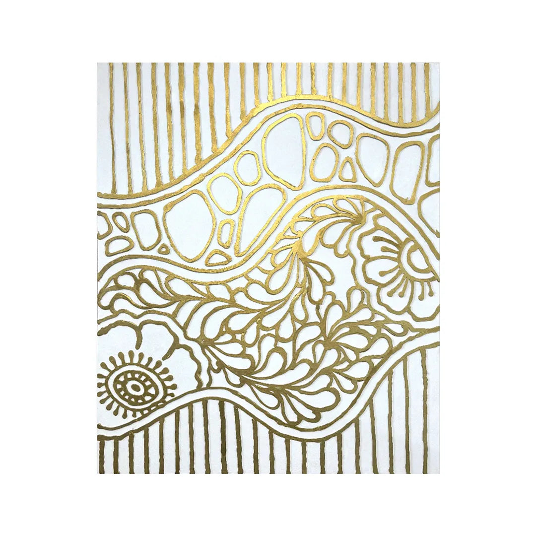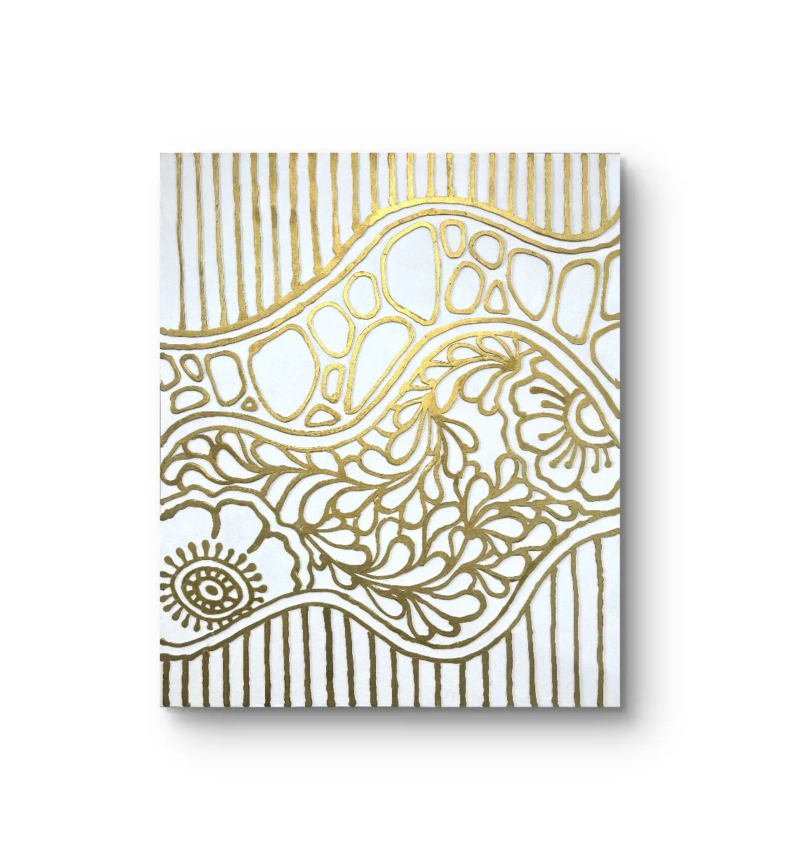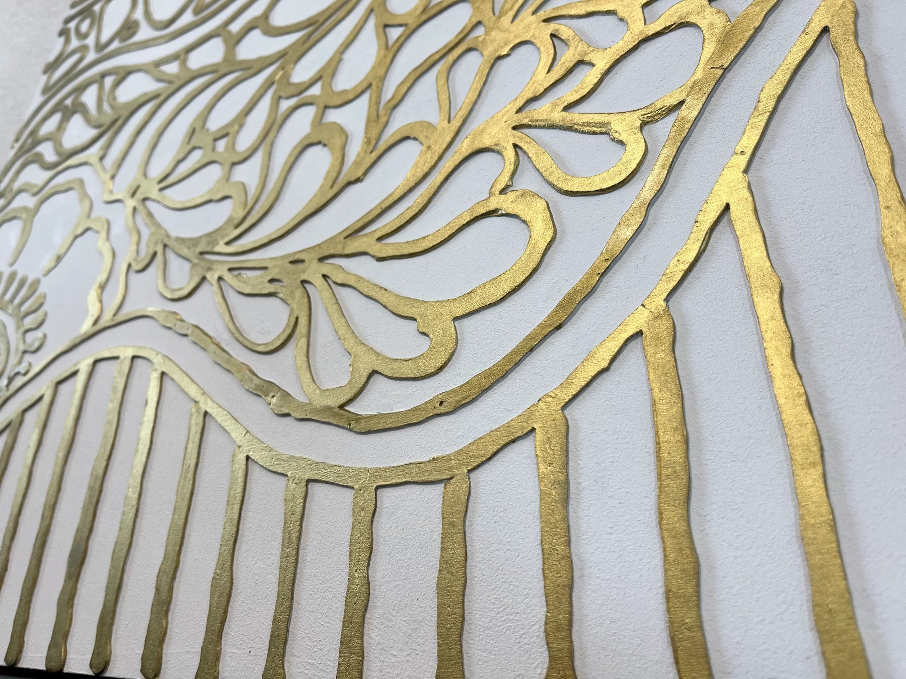 金の線が流れるように巡り、植物や光のゆらぎを思わせます。滑らかな曲線が静かなリズムを奏で、見るたびに心の中に温かな輝きを残します。壁にかけると、空間がふわりと明るさを増し、穏やかな気配が広がります。白を基調としたリビングやナチュラルな木の家具とよく溶け合い、日常に上品な煌めきを添えます。