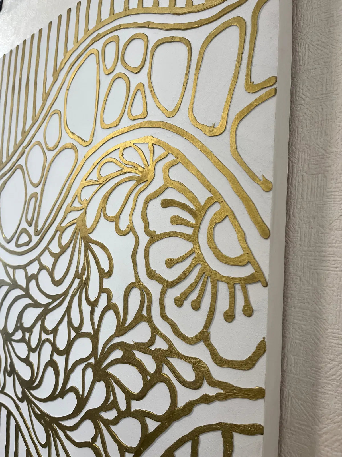 厚みのある落ち着いたゴールドデザイン 真鍮板を切り取って貼り付けたかのような重厚感を意識して。 美しさと力強さを融合しました。 ※作品工程 ペーストでデザイン後削り色を塗布。 ※光の加減により暗く映る箇所がありますが、均一なゴールドカラーになります。 ※金具・釣り紐は装着済みです。即飾ることができます。 ※裏面サインあり、作品証明書も別途あります。 ※モニター環境により若干色味が違う場合がございます。ご了承くださいませ。 ※作品詳細/木製パネル アルコールインク アクリル 珪藻土 モデリングペースト 保護スプレー エディション/原画1点,重量/1.8kg