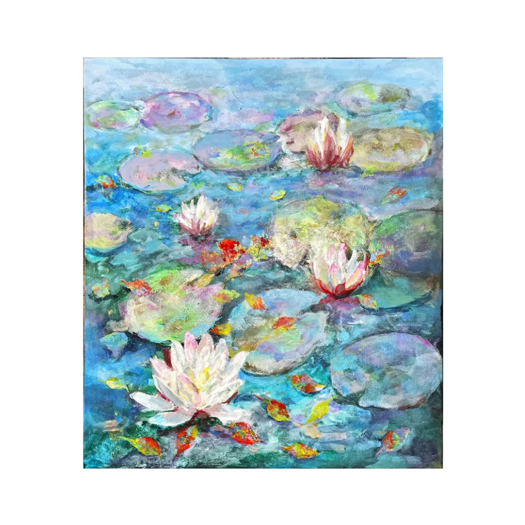 - 画家になろうと思ったきっかけは、ゴッホ、そしてモネでした。 中学生の頃に目にした画集にあった、セザンヌの 「モネはただひとつの目でしかない、ただなんという目だ」 という言葉は、今も心に残っています。 この《睡蓮》では、形を描くことよりも、光や色が静かに移ろう「見ている時間」そのものを大切にしました。 水面に浮かぶ花や葉は、輪郭を曖昧にし、色がにじみ合い、溶け合うように描いています。 画面を眺めていると、視線が自然と定まらず、思考がゆるみ、呼吸が深くなる。 そんな瞑想的な静けさや、心がそっとほどける癒しの時間を感じてもらえたらと思います。 日常の中で、ふと立ち止まりたいとき。 この絵が、静かに寄り添う水面のような存在になれば幸いです。