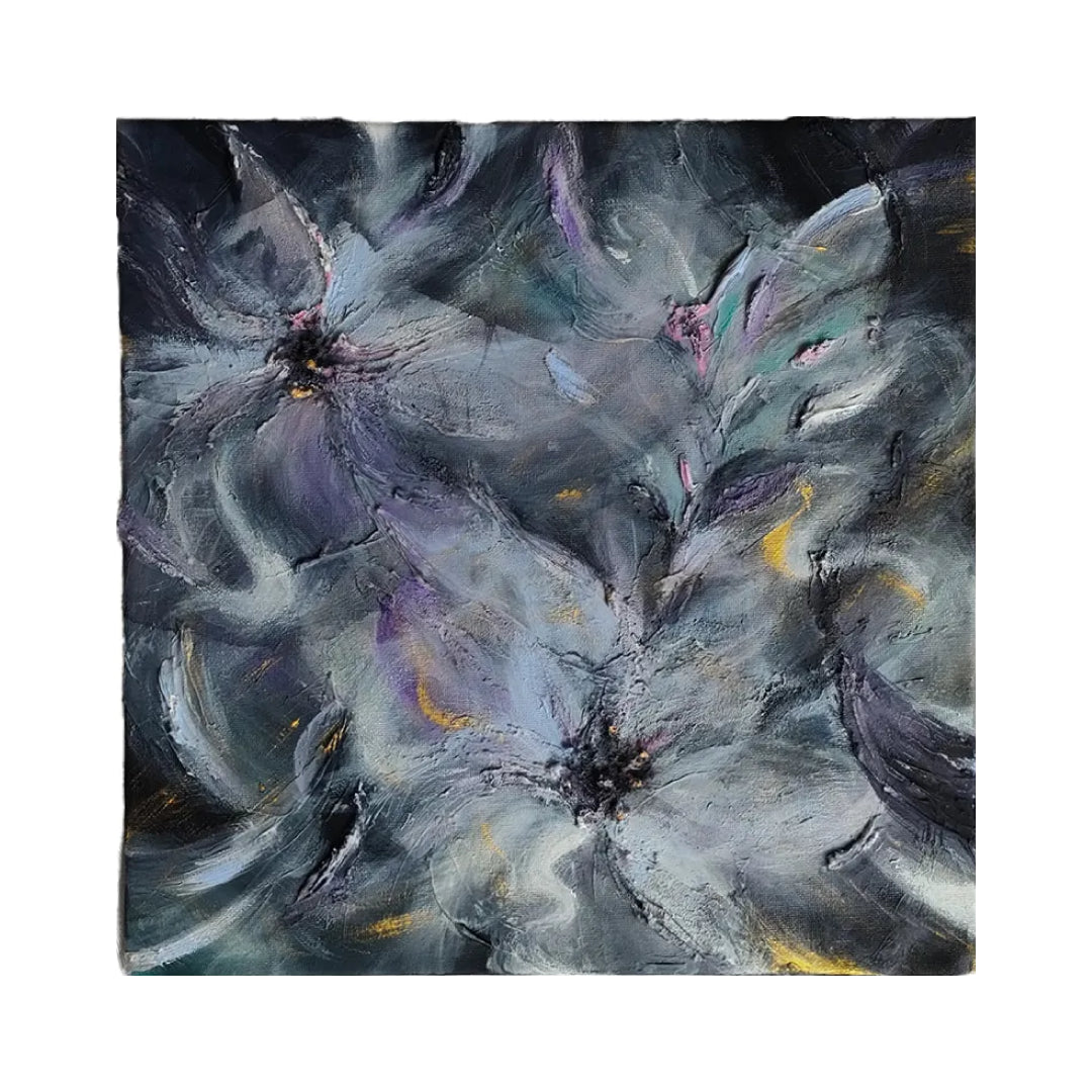 重なり合う濃色の筆致が、夜気に漂う花の気配を思わせ、紫や青の揺れが内側の感情を静かに呼び覚まします。ところどころに差す微かな光が、奥行きのある呼吸を画面に残します。壁に迎えることで、空間に落ち着いた緊張感が生まれ、思考の輪郭が自然と整います。書斎や寝室、無機質な家具を配したモダンな室内にも、深みのある表情として溶け込みます。