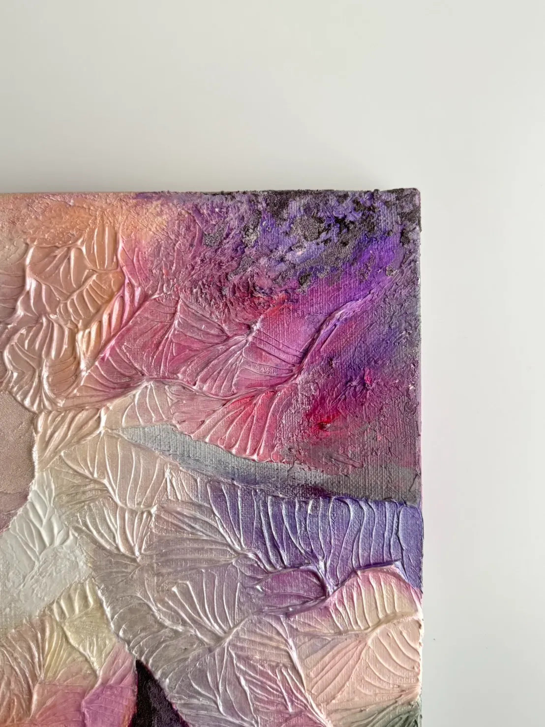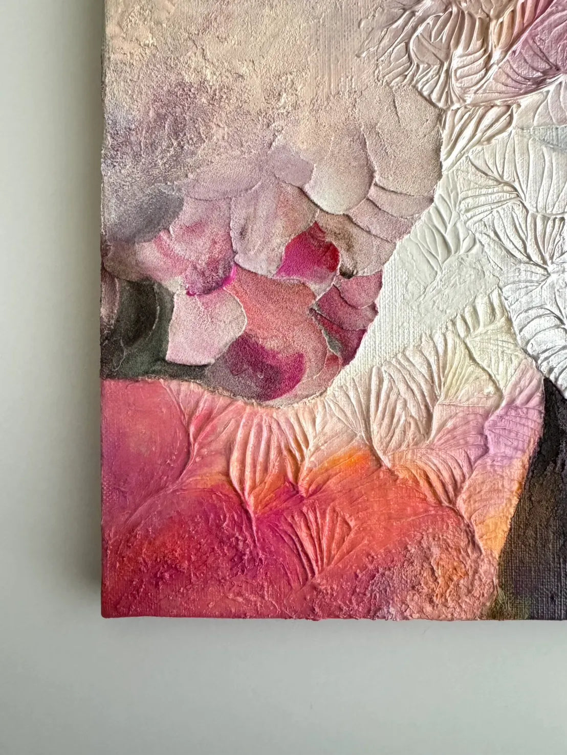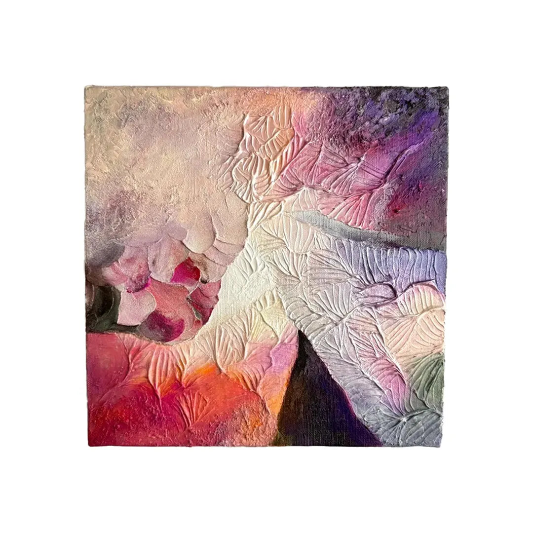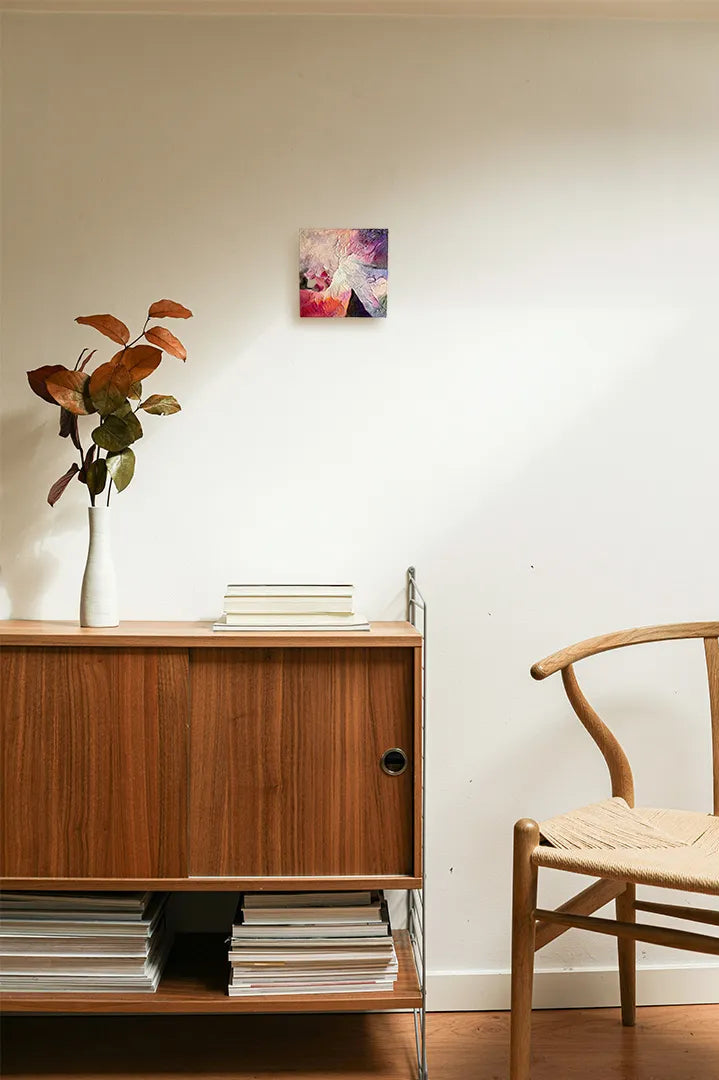 花びらのような質感が重なり合い、桃色から紫、淡い金へと移ろう色彩が、そっと光を包み込んでいます。触れたくなるほど立体的な陰影が、心の奥に穏やかな余韻を残します。壁にかけると、室内の空気がやわらかく溶け合い、光の角度によって異なる表情を見せてくれます。木の家具やリネンのファブリックと調和し、リビングや寝室に静かなぬくもりを添えます。