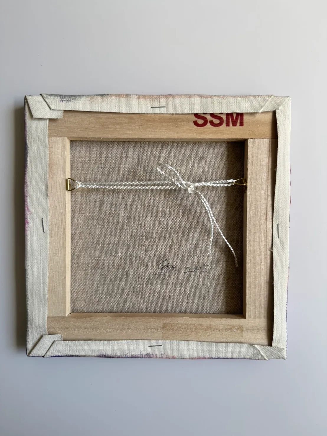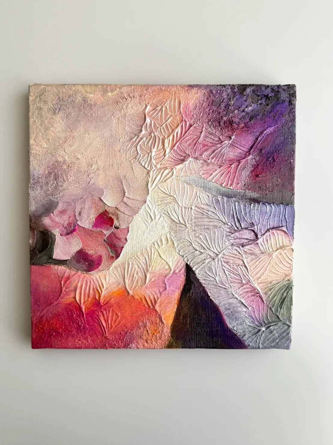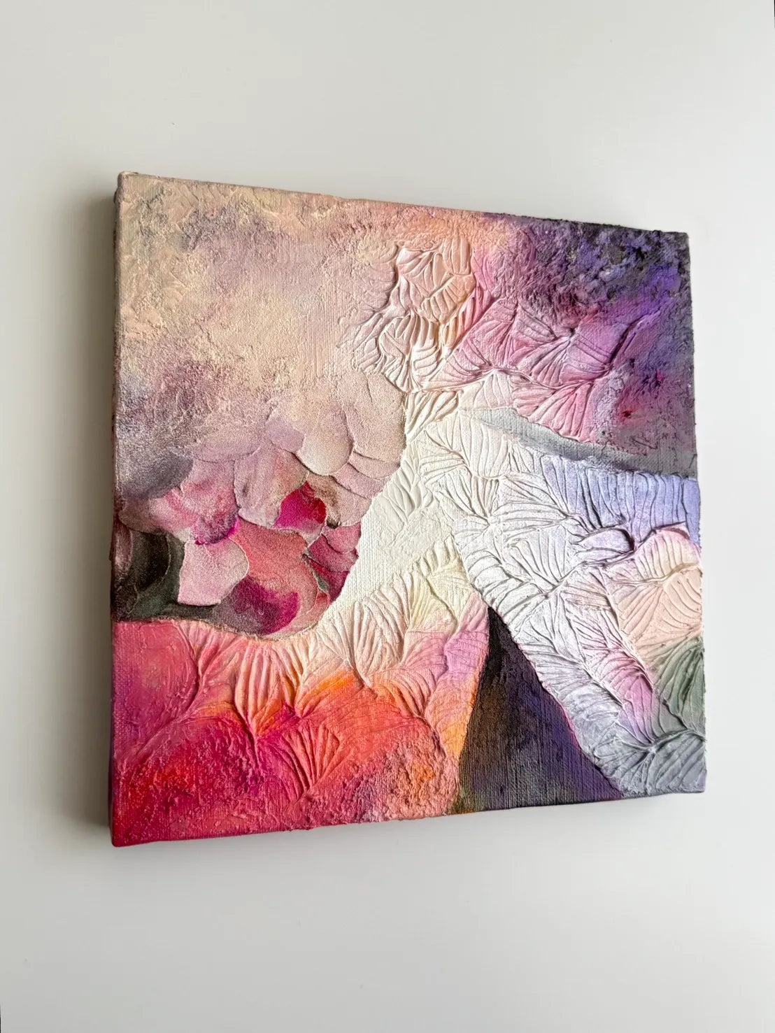 花びらのような質感が重なり合い、桃色から紫、淡い金へと移ろう色彩が、そっと光を包み込んでいます。触れたくなるほど立体的な陰影が、心の奥に穏やかな余韻を残します。壁にかけると、室内の空気がやわらかく溶け合い、光の角度によって異なる表情を見せてくれます。木の家具やリネンのファブリックと調和し、リビングや寝室に静かなぬくもりを添えます。