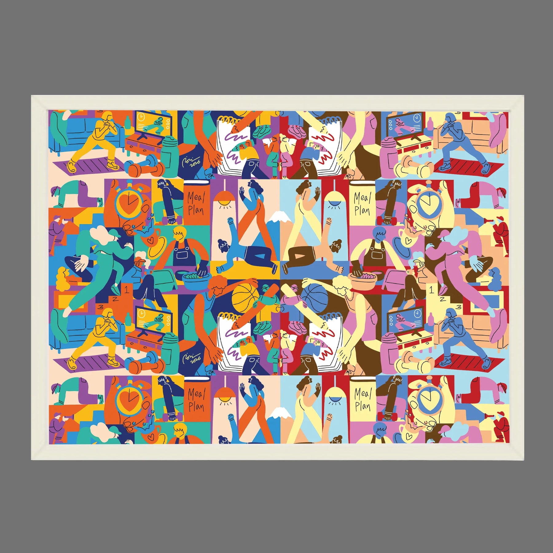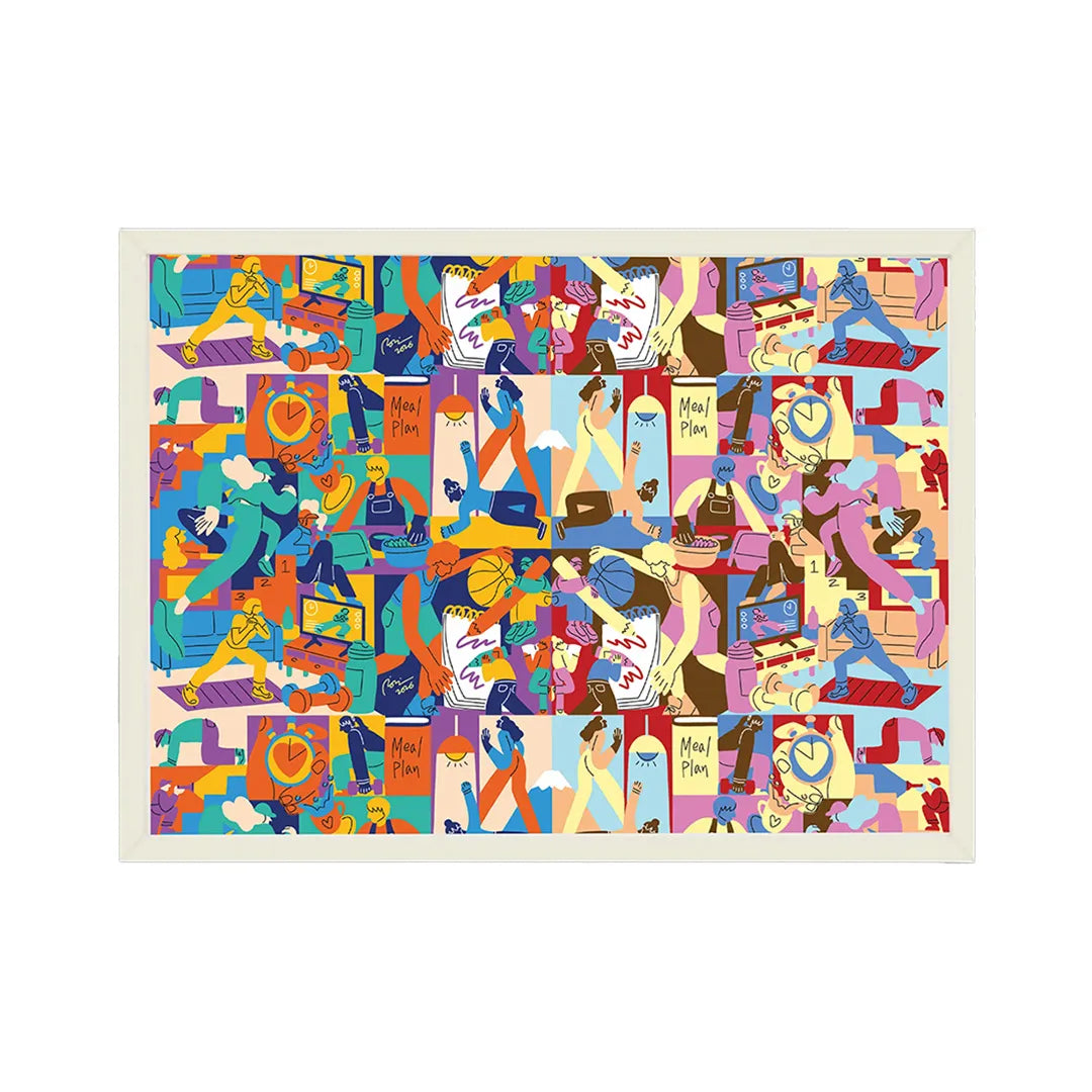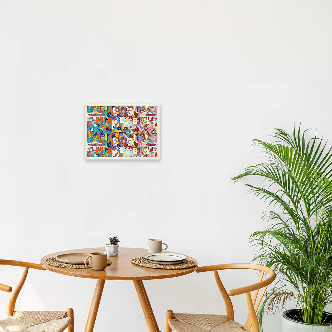 一人ひとりの大切な日常が、鮮やかなパレットの上で重なり合い、活気あふれる一枚の地図を描き出しているようです。料理を作る手元や運動に励むシルエットが、リズムを刻むように配置され、日々の何気ない瞬間が宝石のように輝く物語であることを伝えてくれます。この作品を壁に添えるだけで、空間にポジティブな活気が満ち、住まう人の心を前向きなエネルギーで整えてくれるでしょう。ダイニングや家族が集う廊下に、明るい色調の木製フレームで飾るのも素敵です。