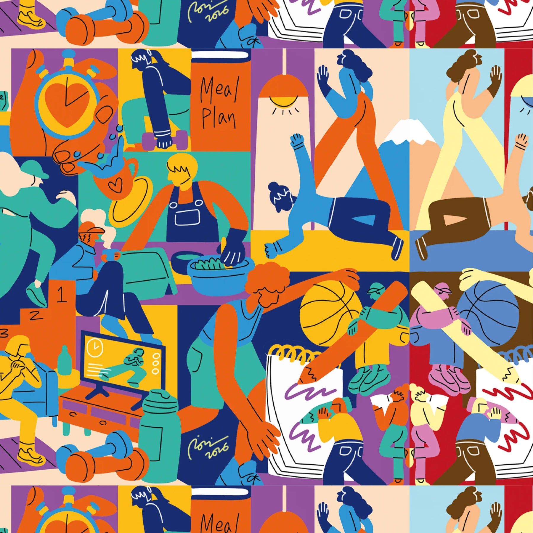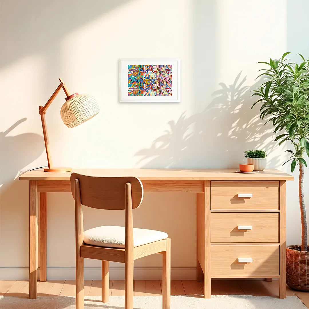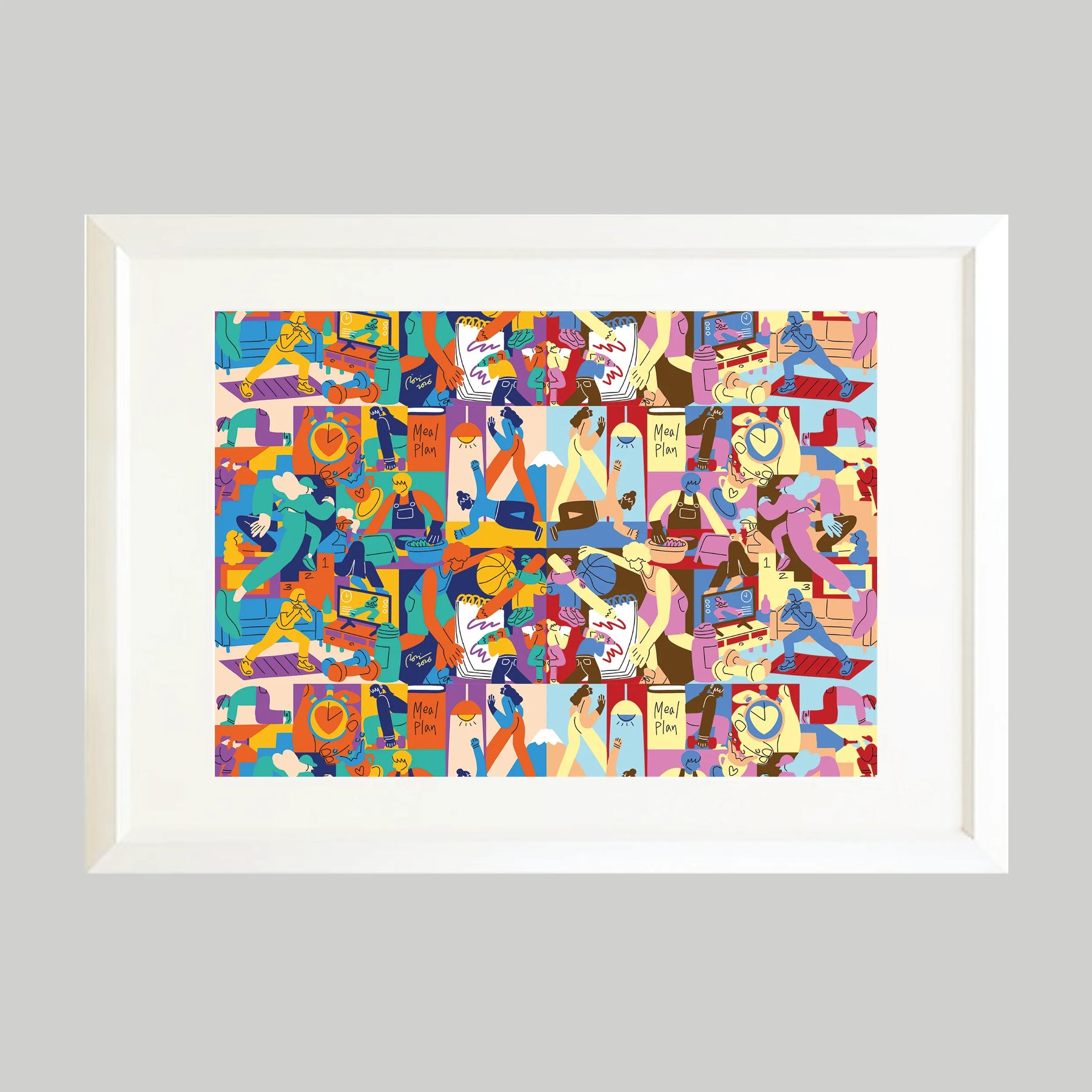 料理や運動、仕事に励む人々の姿が、パズルのように隙間なく描かれ、日々の営みが持つ力強いエネルギーを感じさせます。ポップな色彩と軽快な線画の重なりは、何気ない生活の一コマ一コマが、実はかけがえのない輝きに満ちていることを教えてくれるでしょう。この作品を一点飾ることで、お部屋に賑やかな活気が生まれ、空間全体が前向きな多幸感に包まれます。