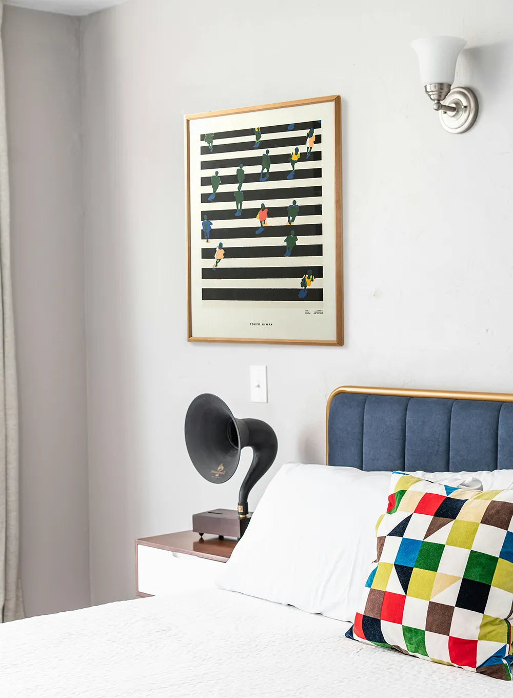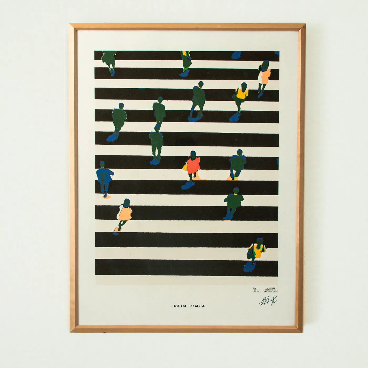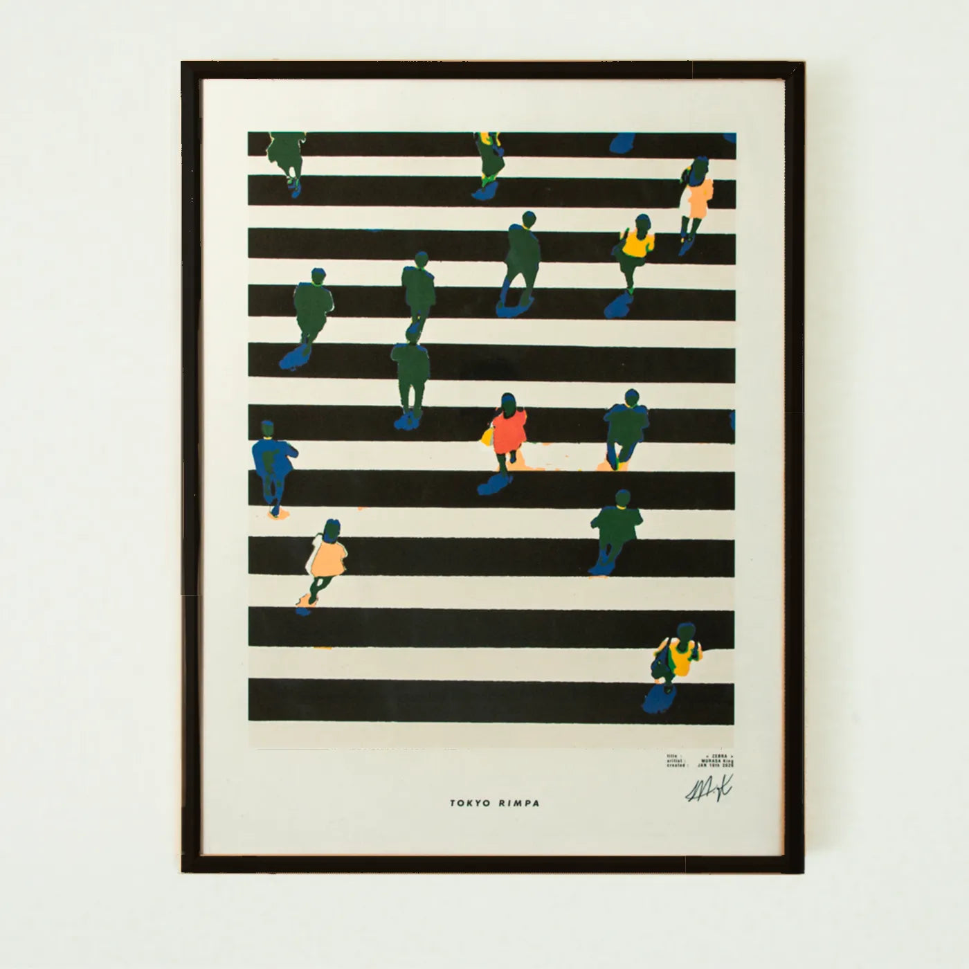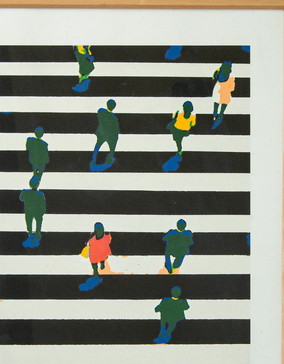 規則正しく並ぶモノトーンの横断歩道と、その上を軽やかに行き交う人々が、現代的な都市の活気を見事に描き出しています。記号化されたシルエットと鮮やかな色彩の対比は、何気ない日常の一コマを、まるで映画のワンシーンのようにドラマチックに映し出すでしょう。この作品を飾ることで、お部屋に都会的で洗練されたテンポが生まれ、空間全体がモダンで開放的な印象へと刷新されます。リビングやのベッドルームに、シンプルな家具と合わせて設えるのが最適です。