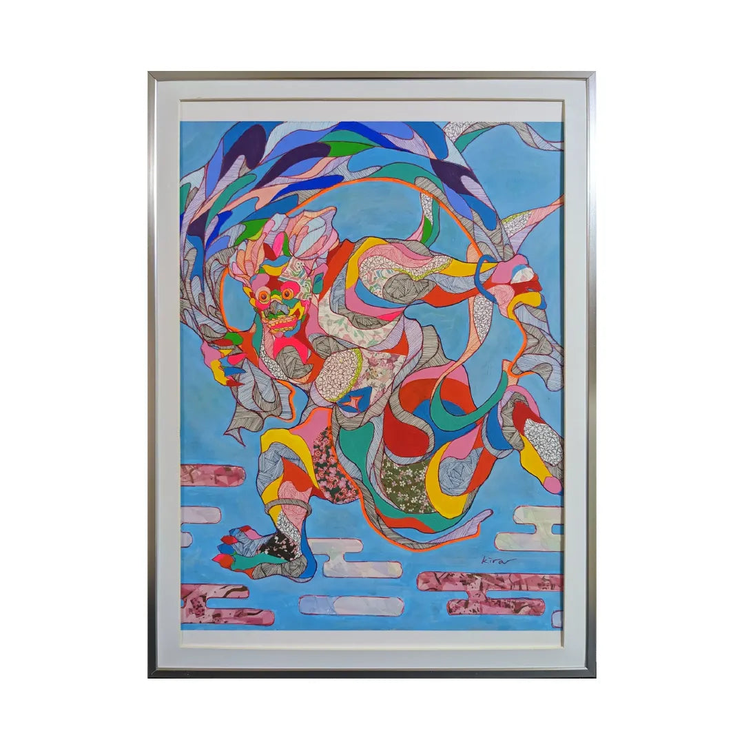澄み渡るブルーを背景に、圧倒的なエネルギーをまとった姿が画面いっぱいに躍動する作品です。複雑に絡み合う色帯は動きの軌跡のように広がり、力強さの中に軽やかなリズムを生み出しています。細部まで描き込まれたパターンが奥行きをつくり、見る角度によって印象が変わる多層的な表情を楽しめます。飾るだけで空間が一気に鮮やぎ、ポップでありながら威厳のある存在感を放つ一枚です。