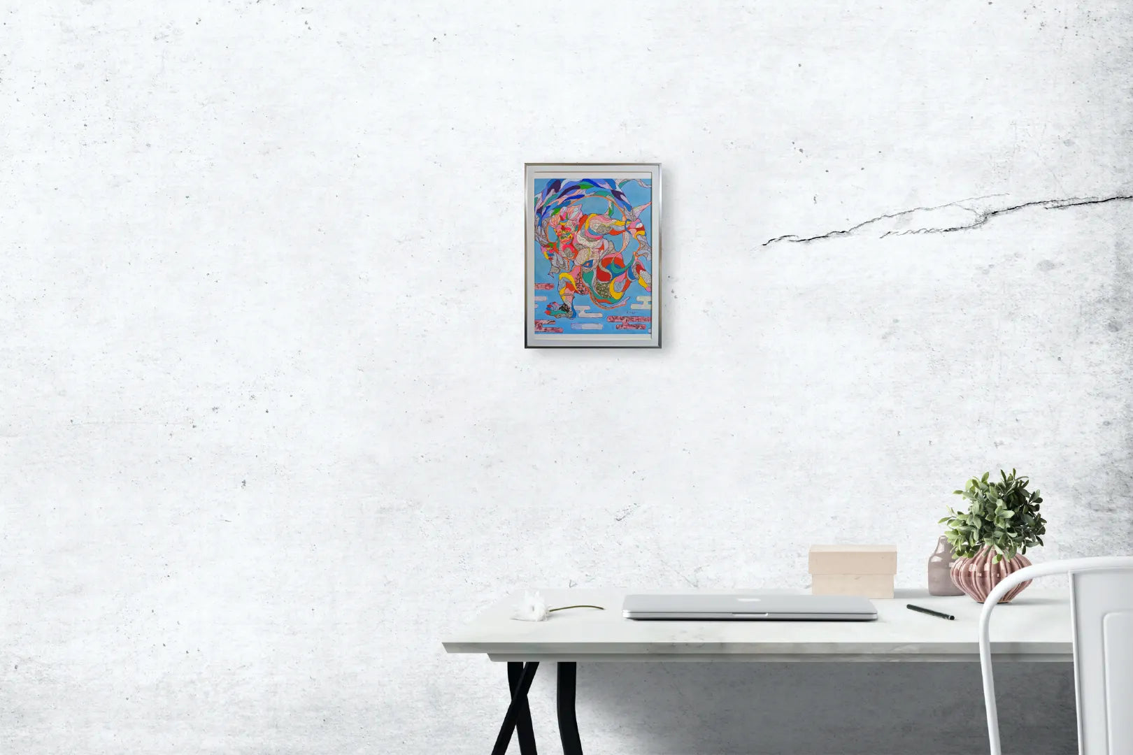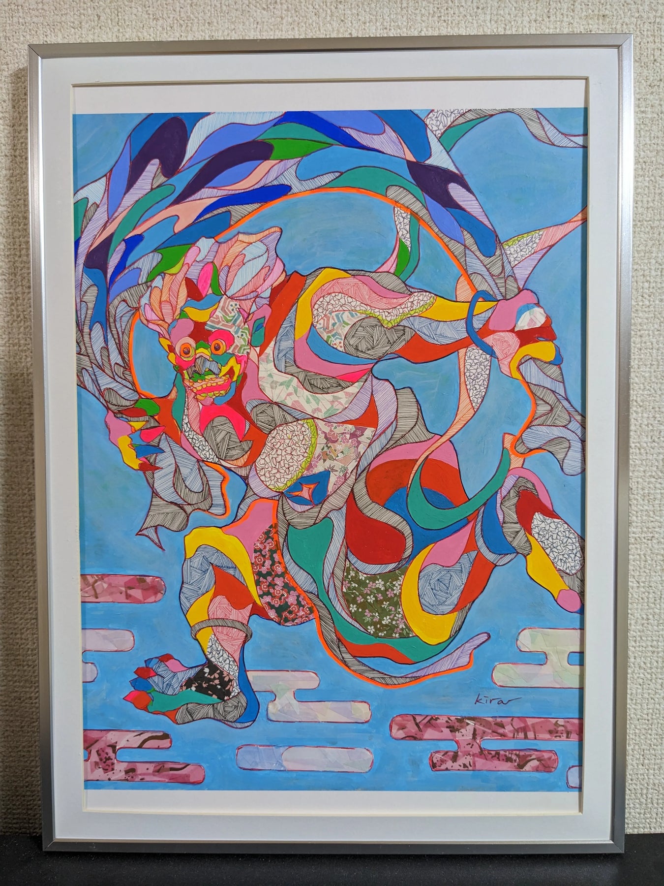 カラフルに描かれた「風神」は、自然の力強さと美しさを表現した作品です。この風神は、多彩な色使いで見る空間に彩りを加えること思います。 ボールペン、コラージュで立体感をアクリルで感情を表現しています。 アルミ製の額も付いていますので、そのまま部屋に飾ることができます。透明性の高いアクリル板とマット付きです。 絵のサイズはA 3、オリジナル原画1点ものです。