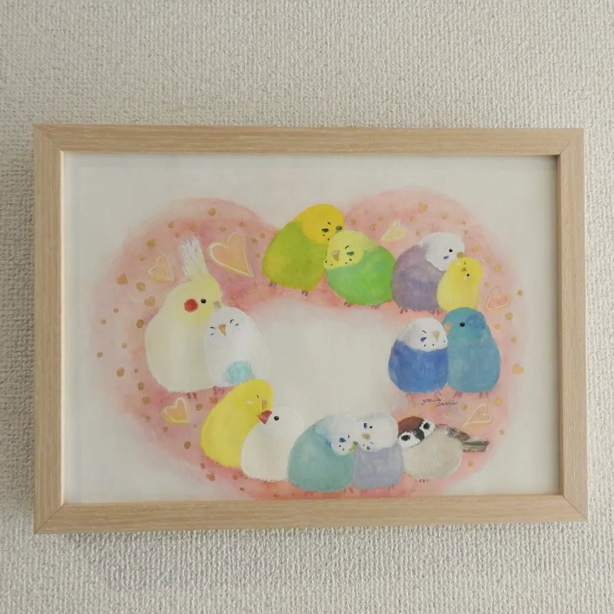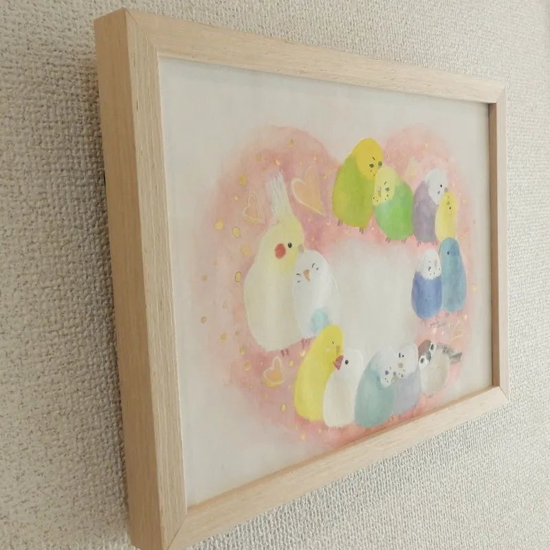 寄り添い合う色とりどりの小鳥たちが、ハート型の柔らかな色彩の中で穏やかな輪を描いています。ふんわりとした筆致で描かれた愛らしい姿は、眺めているだけで心がじわじわと解けていくような、至福の充足感を与えてくれるでしょう。この作品を一点壁に添えることで、お部屋に陽光のような温かみが広がり、家族の絆を象徴するような優しい空気感へと包み込んでくれます。リビングや玄関の棚に、淡い色調の木製インテリアと合わせるのが最適です。