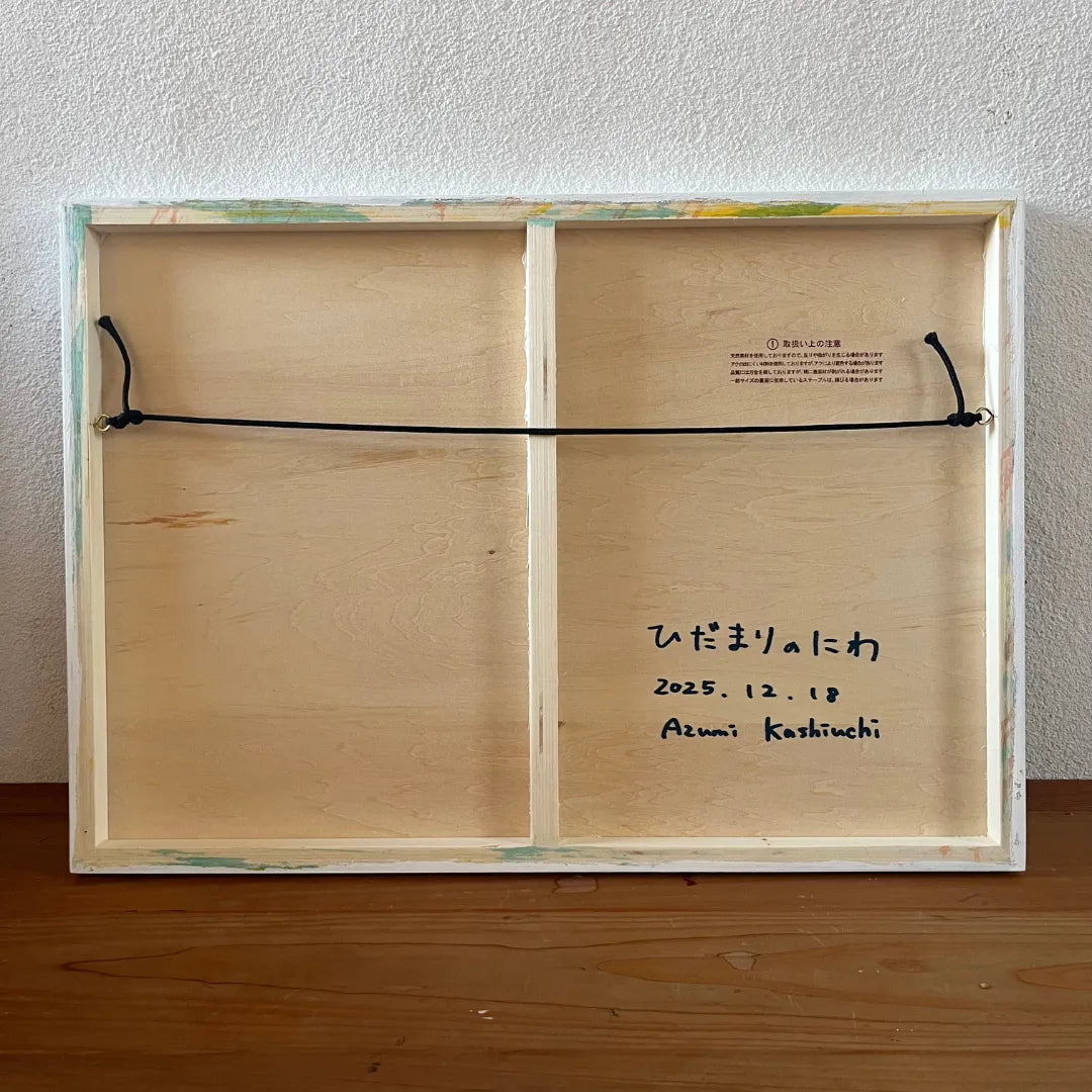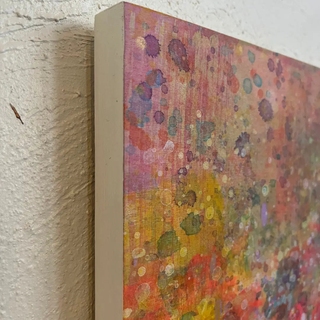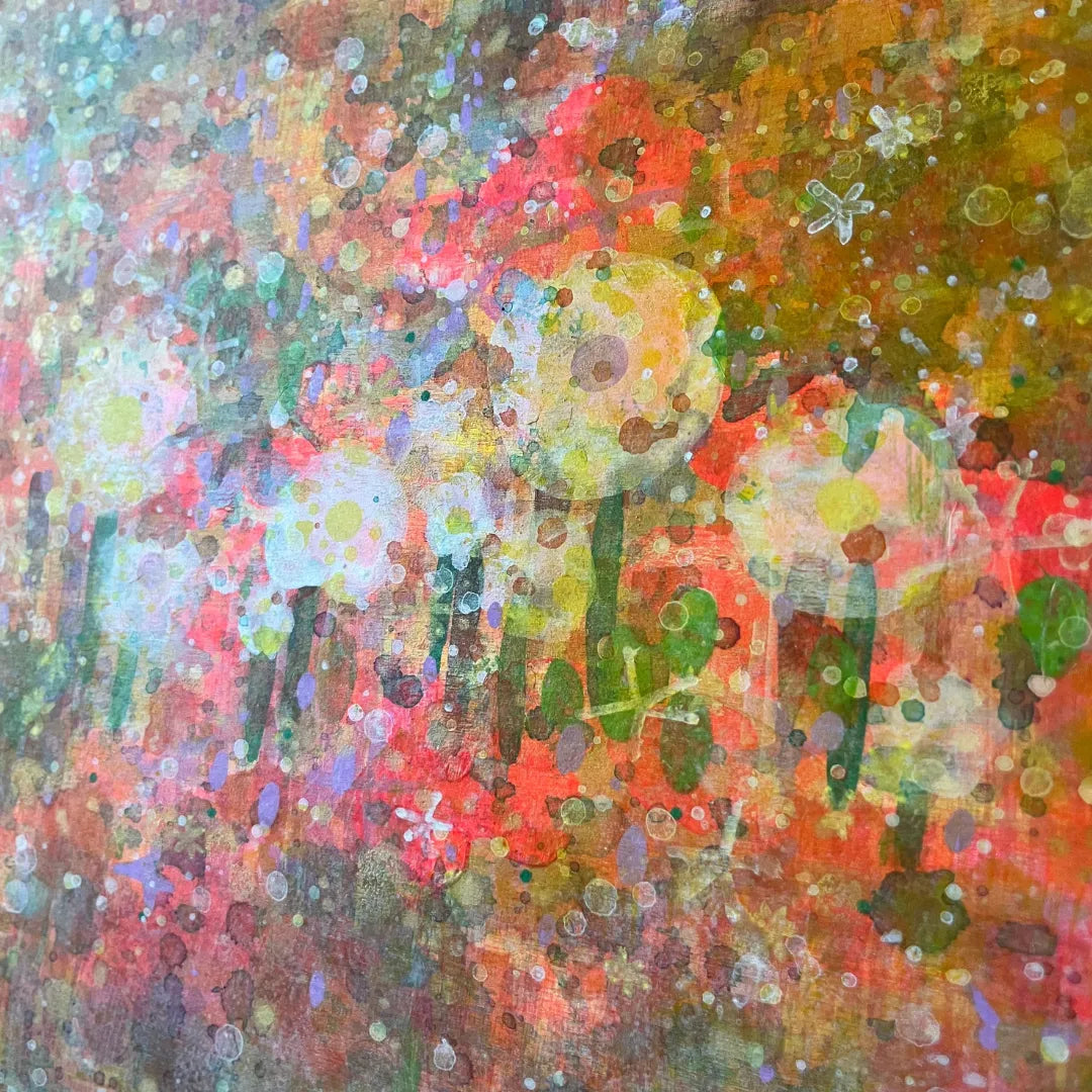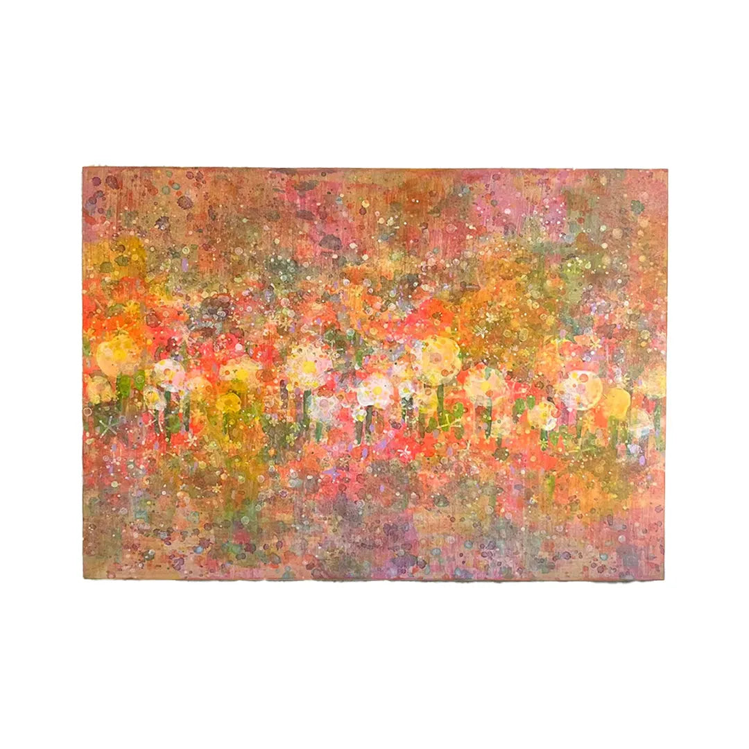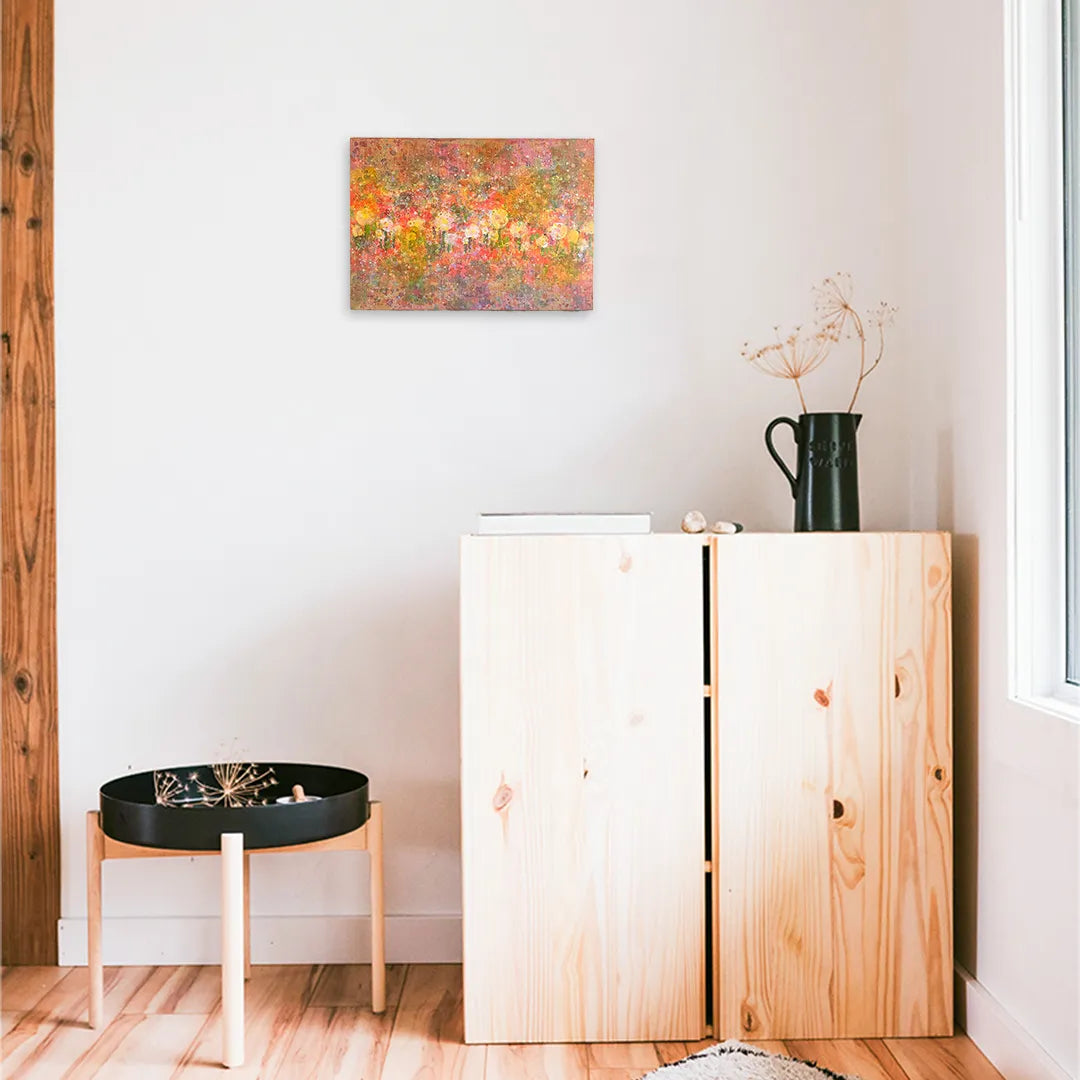無数の色彩が重なり合い、暖かな光に包まれたお花畑が画面いっぱいに呼吸しているようです。飛び散る絵具の飛沫は、生命が放つ輝きのようで、眺めるほどに春の微風に誘われるような心地よい多幸感をもたらしてくれます。この作品を一点飾ることで、お部屋の中にぱっと明るい灯がともり、空間全体が華やかで前向きなエネルギーに満たされるでしょう。リビングや子供部屋に、ナチュラルな木製家具とも調和します。