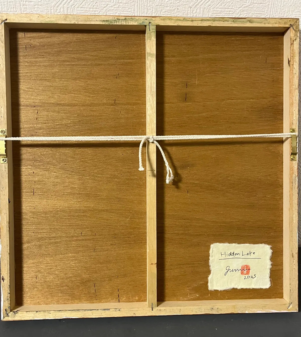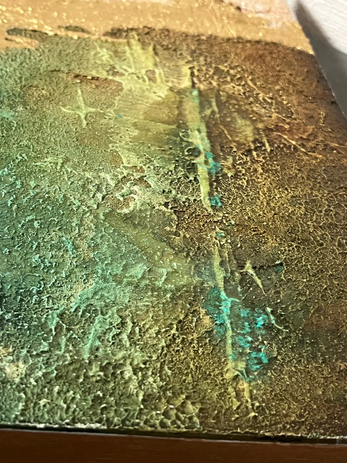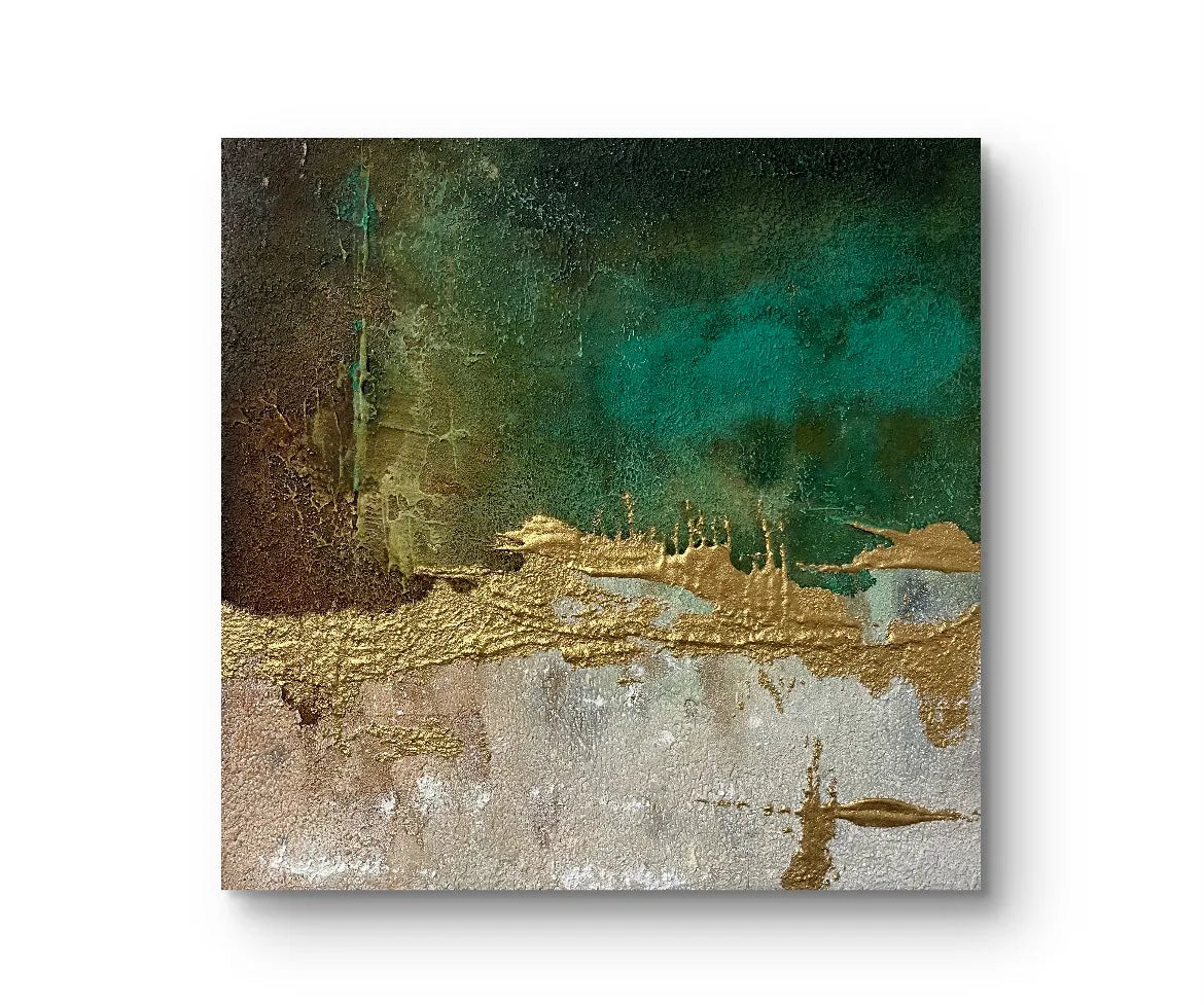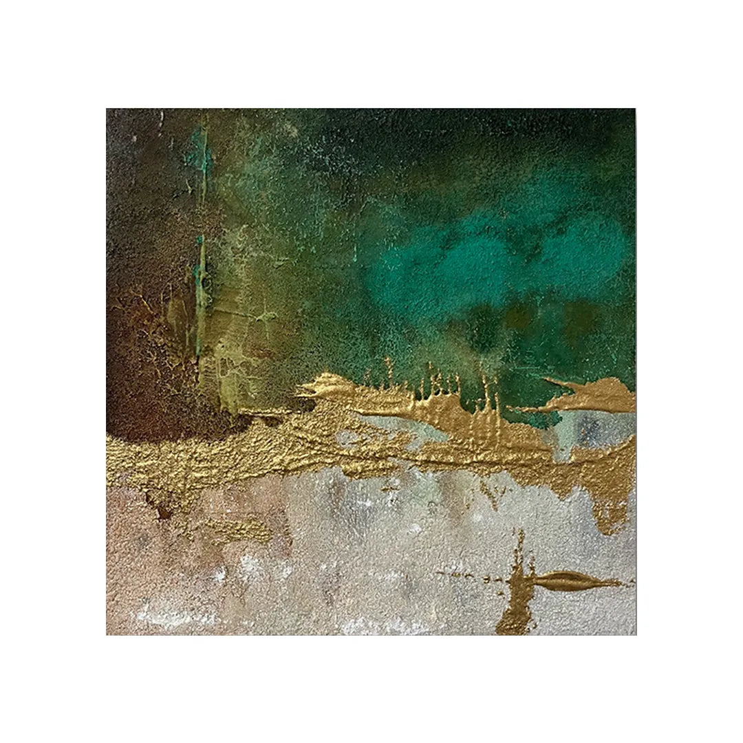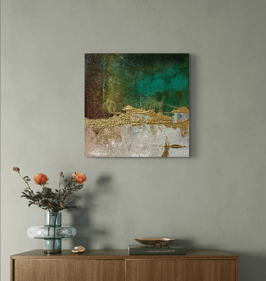 深い森のような緑が静かに広がり、そこに金の光が滲むように流れています。厚みのある質感は、時間の層を抱えた地表のようで、見るたびに異なる表情を見せます。壁にかけると、空間に穏やかな重なりが生まれ、心の奥に静かな呼吸をもたらします。落ち着いた照明のもと、リビングや書斎の一角に置くと、上品な陰影が調和します。