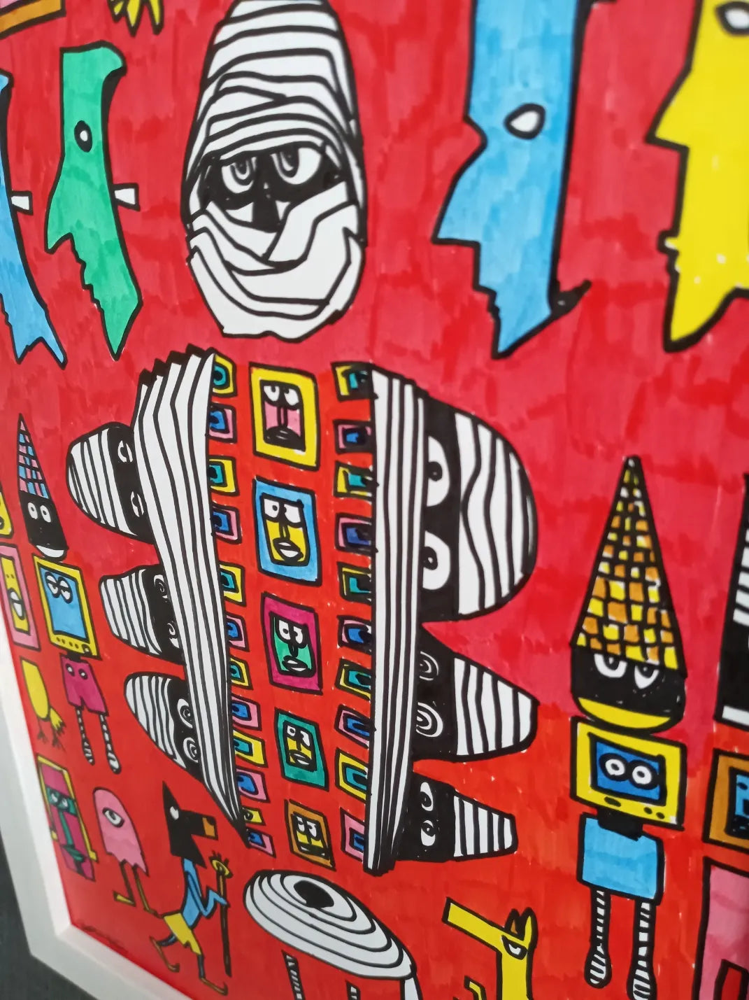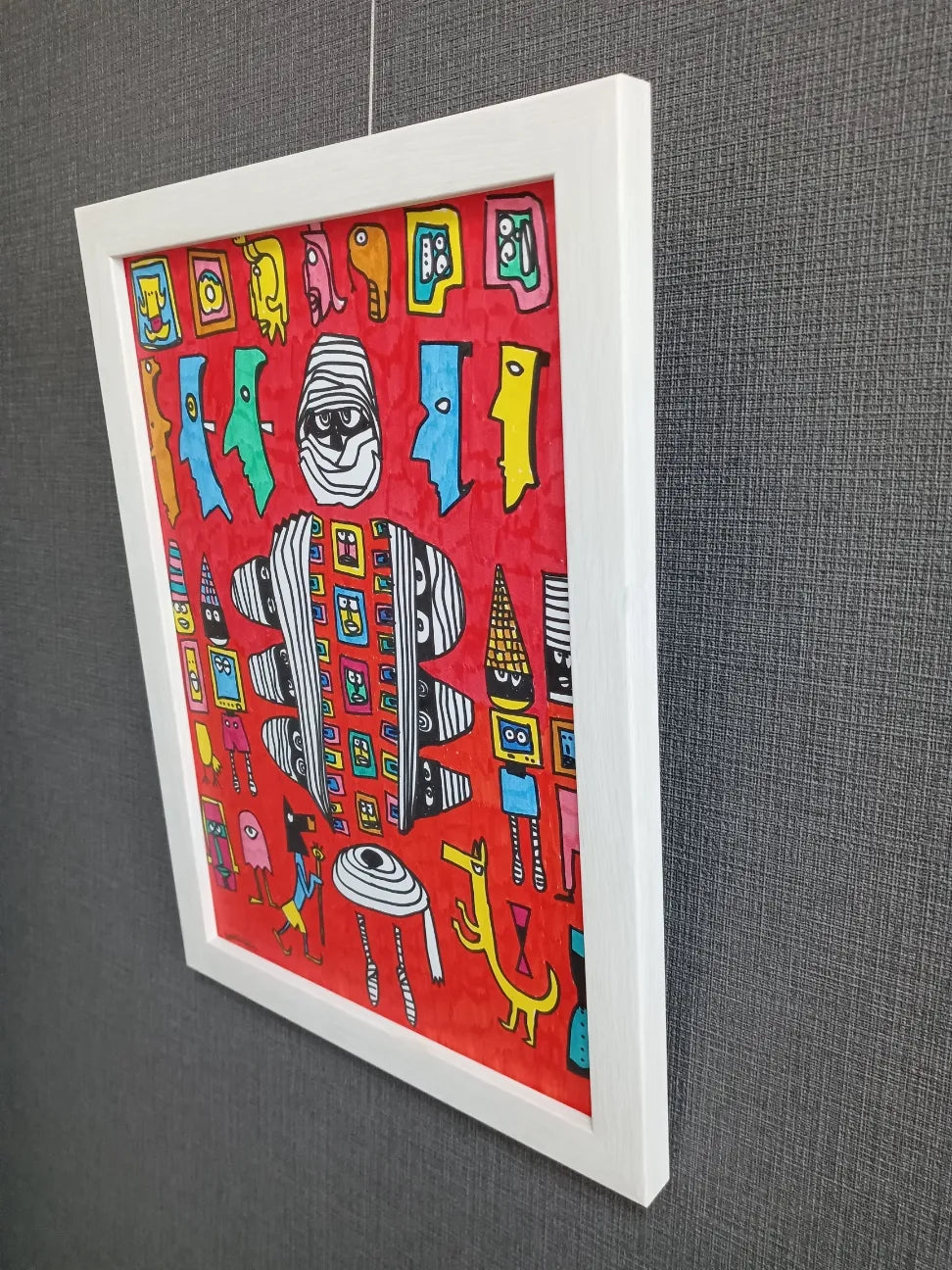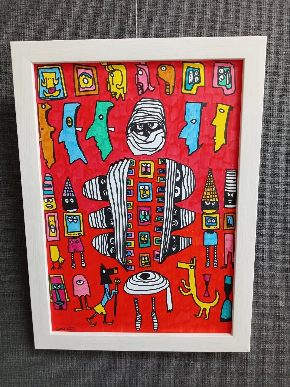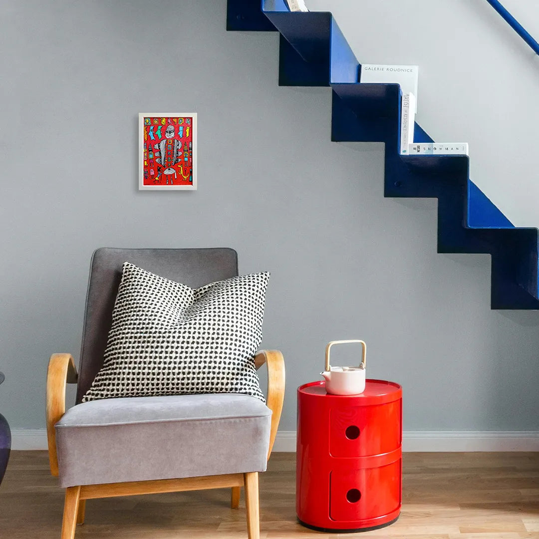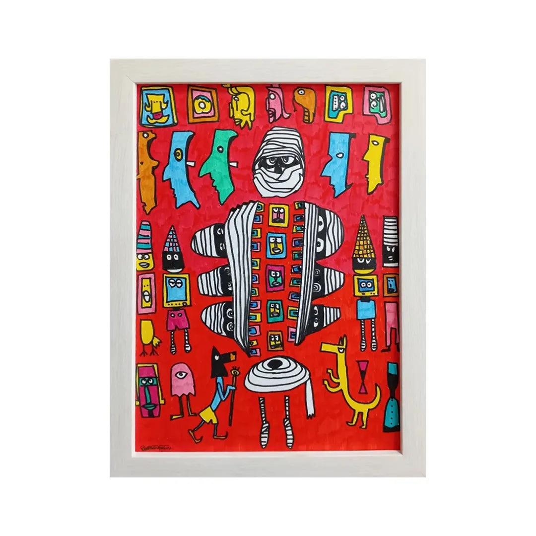 無数の目と語らぬ顔が、まるで物語の断片のようにこちらを見つめます。騒がしさの中に不思議な静けさが宿り、記号のような人物たちが感情の余白を埋めていきます。飾ることで、日常にふと異国の夢を滑り込ませるような時間が生まれます。リビングの一角やアート好きの書斎にも、ポップな家具と好相性で調和します。