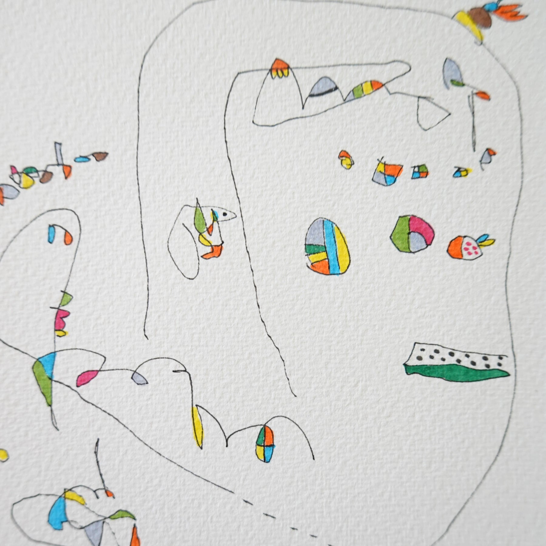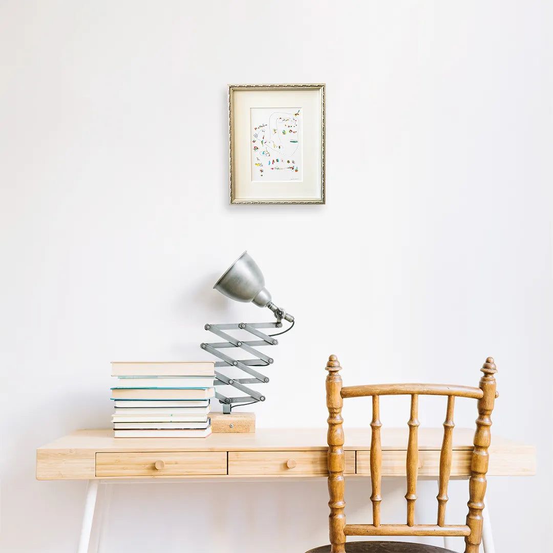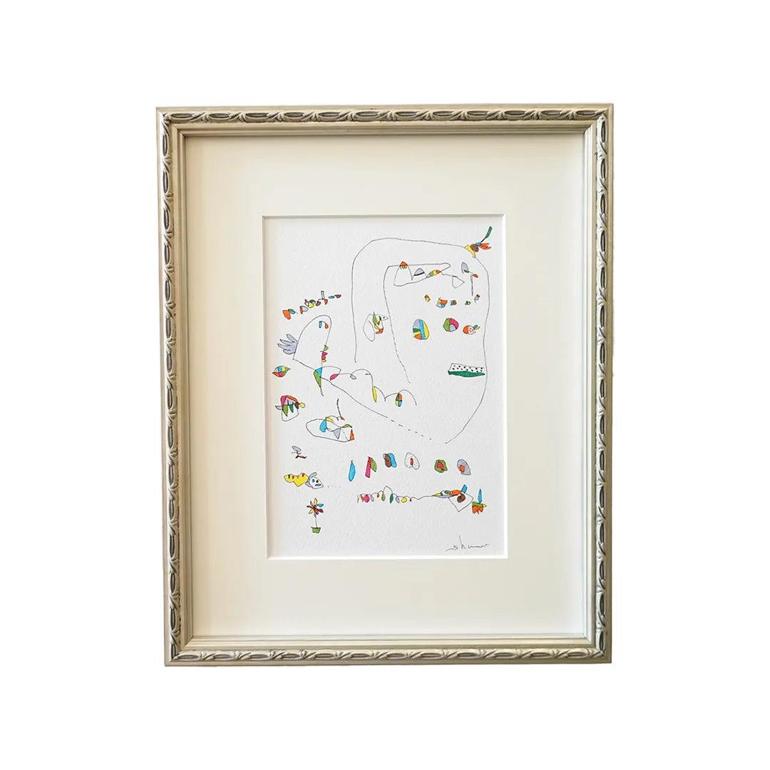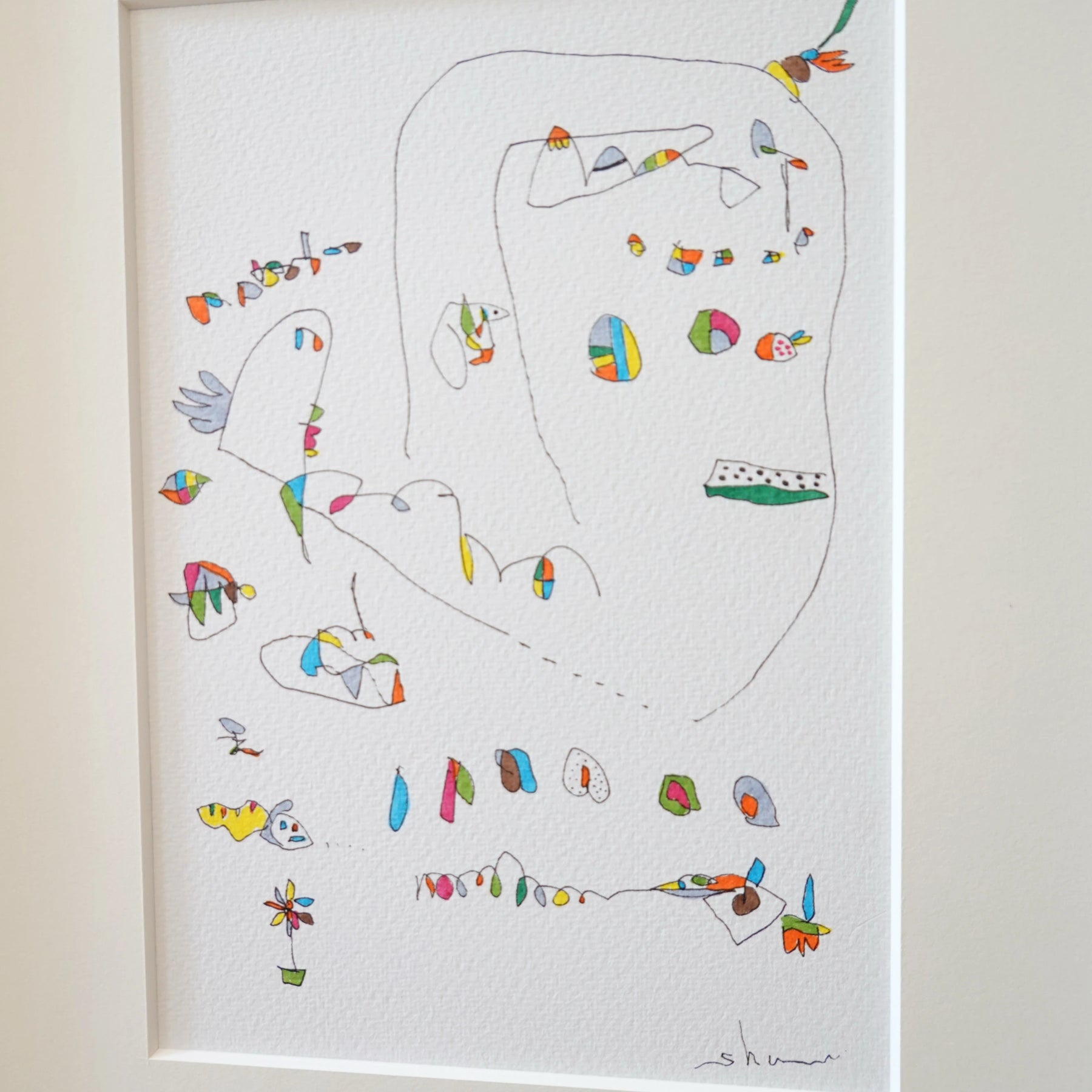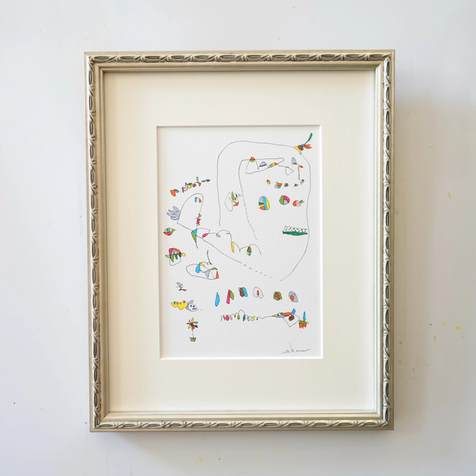 細い線がやわらかくたどる道の上に、色とりどりの記号が静かに浮かんでいます。言葉にならなかった想いや、夢の端を集めたような風景が、ふと心を解きほぐしてくれます。白壁に掛けると、光の中にひそむやさしい気配が立ち上がり、穏やかで澄んだ空気をまとった空間に変わります。クラシカルな額縁とも調和し、リビングや読書のそばにも心地よく馴染みます。