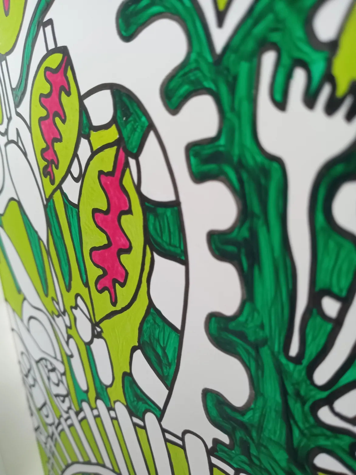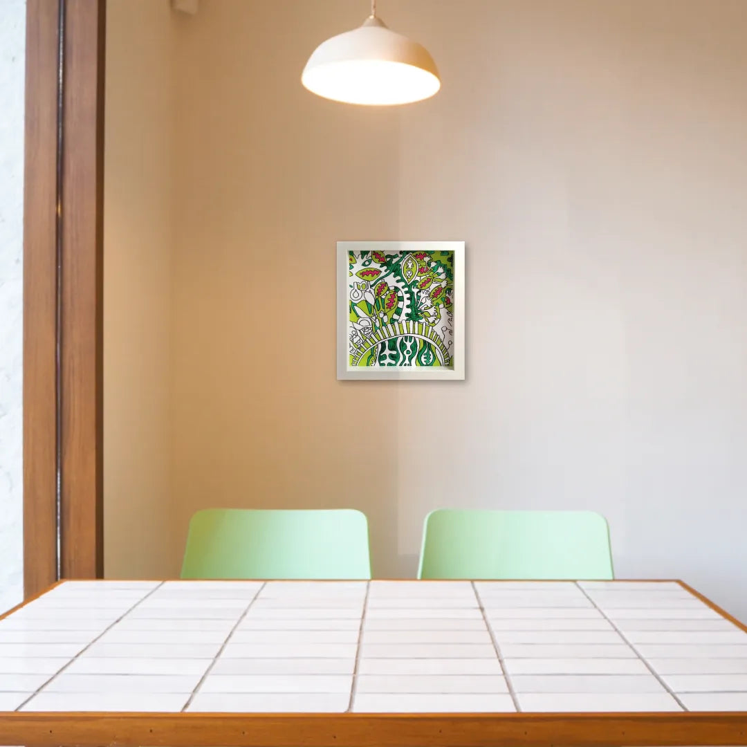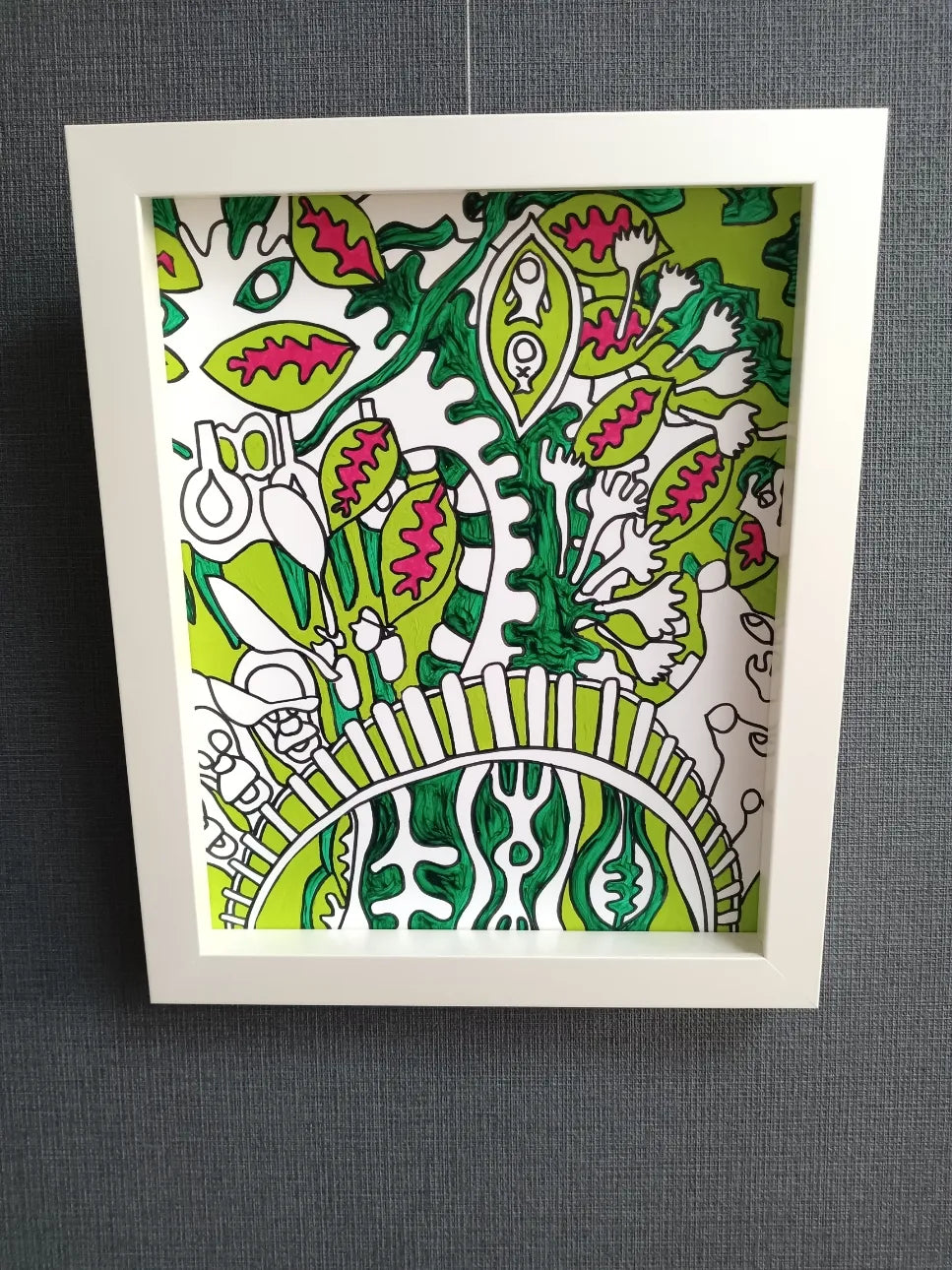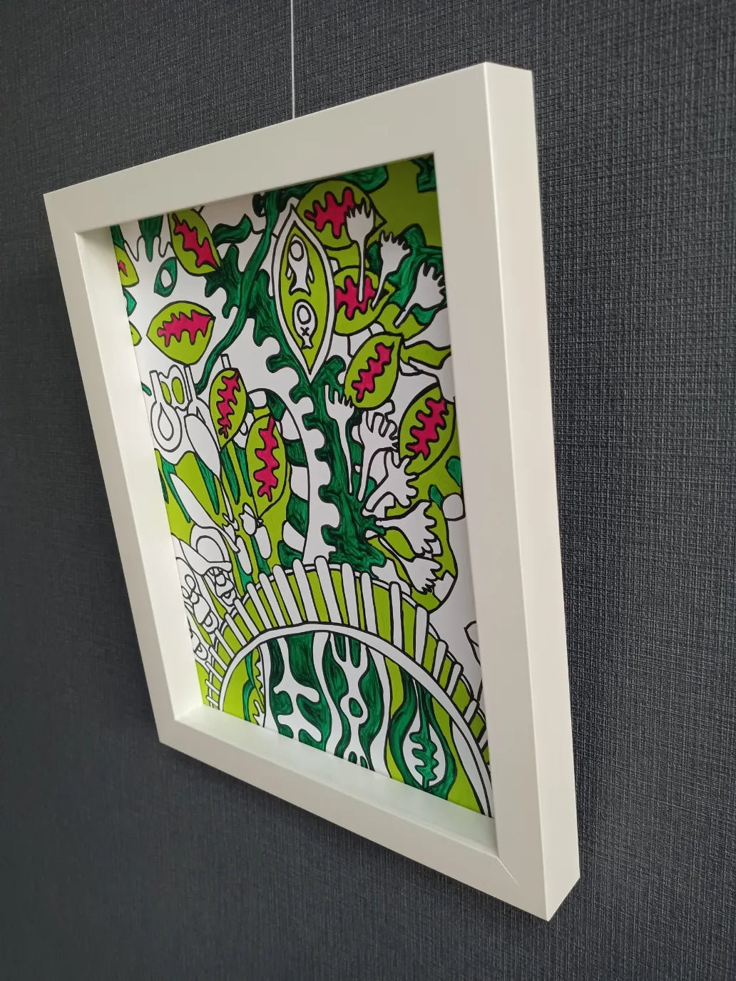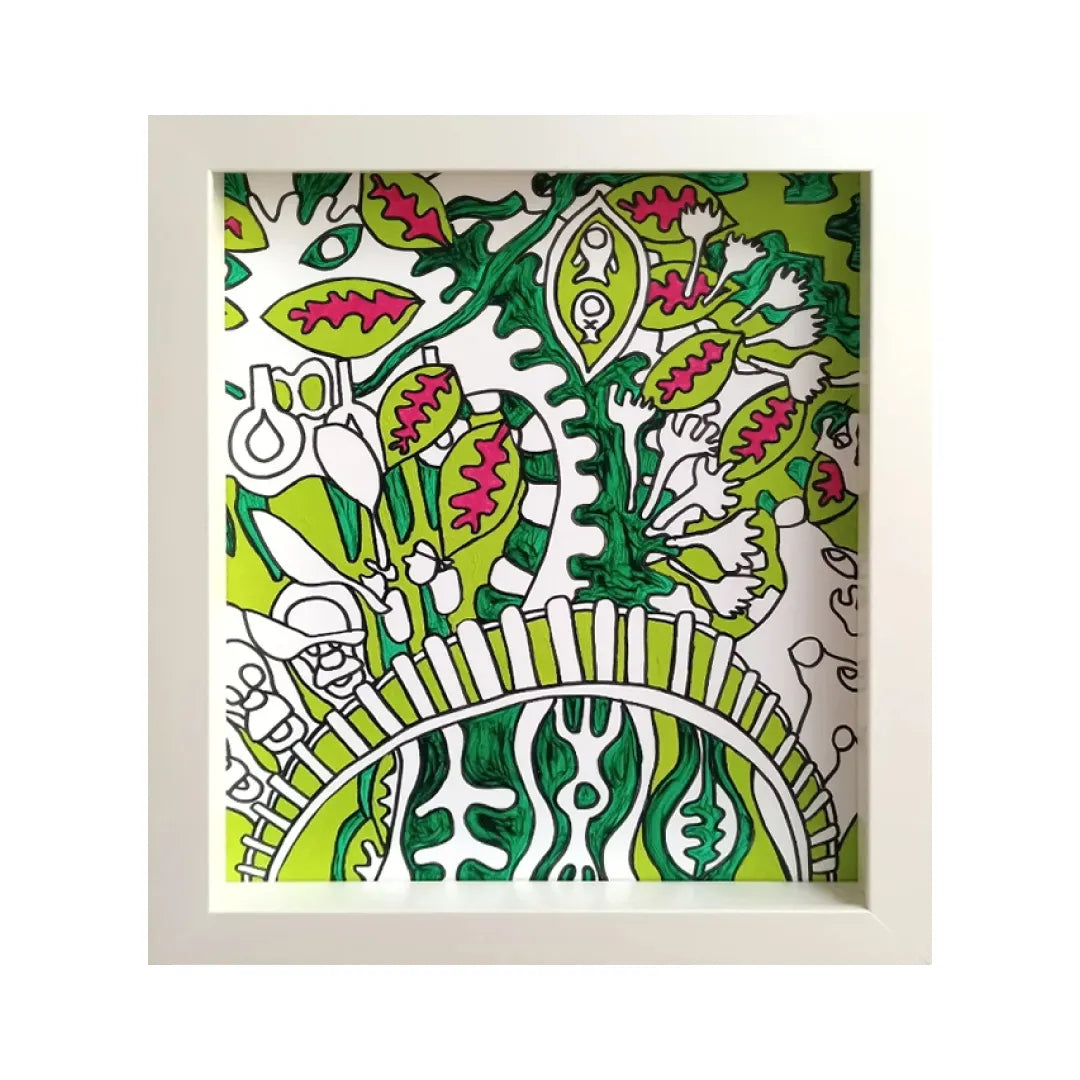 鮮やかなグリーンとショッキングピンクが目に飛び込んでくる、生命力あふれる作品です。大胆な線と有機的な形が絡み合い、まるで深い森の中にある神秘的な世界を覗き込んでいるかのよう。細かく描き込まれた模様や隠れたモチーフが、遊び心と想像力を刺激します。ナチュラルや北欧、ポップなリビングや玄関に飾ることで、お部屋全体にポジティブでエネルギッシュな彩りをもたらしてくれるでしょう。