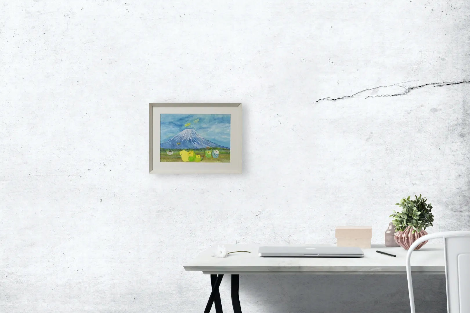 雄大な山を背景に、小さな生き物たちが凧を揚げて遊ぶ、のびやかな情景を描いた作品です。広がる空とやわらかな色彩が、画面全体に軽やかなリズムを生み出しています。それぞれの表情や仕草からは、無邪気な楽しさと穏やかな時間の流れが伝わってきます。飾ることで空間に開放感が生まれ、忙しい日常の中に、ふっと肩の力が抜けるような余白をもたらしてくれる一枚です。