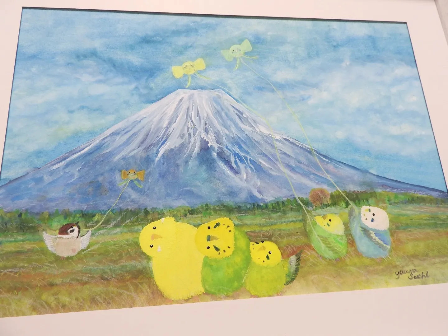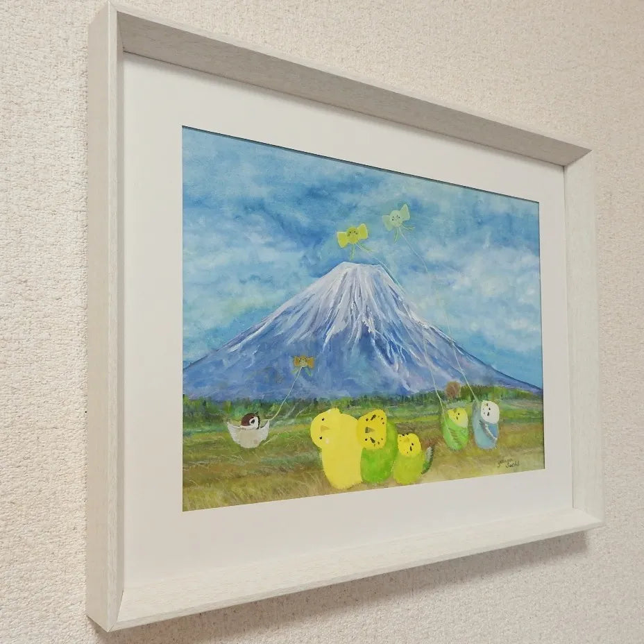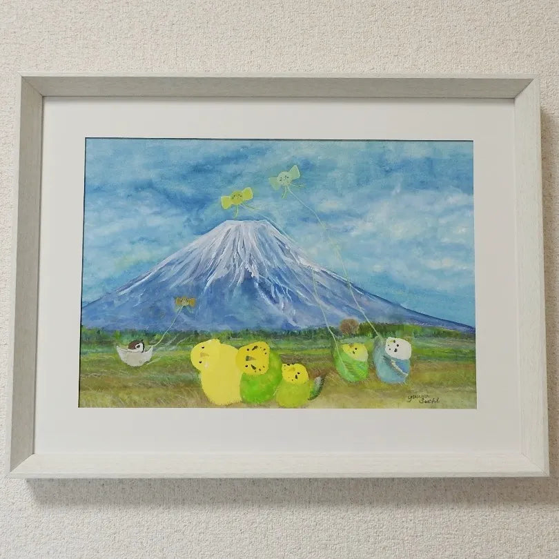 - 子供の頃、大好きだった凧上げ。 小さくなるまで遠く遠く飛んでいく凧。 爽やかな青空と富士山と小鳥たちを描きました。