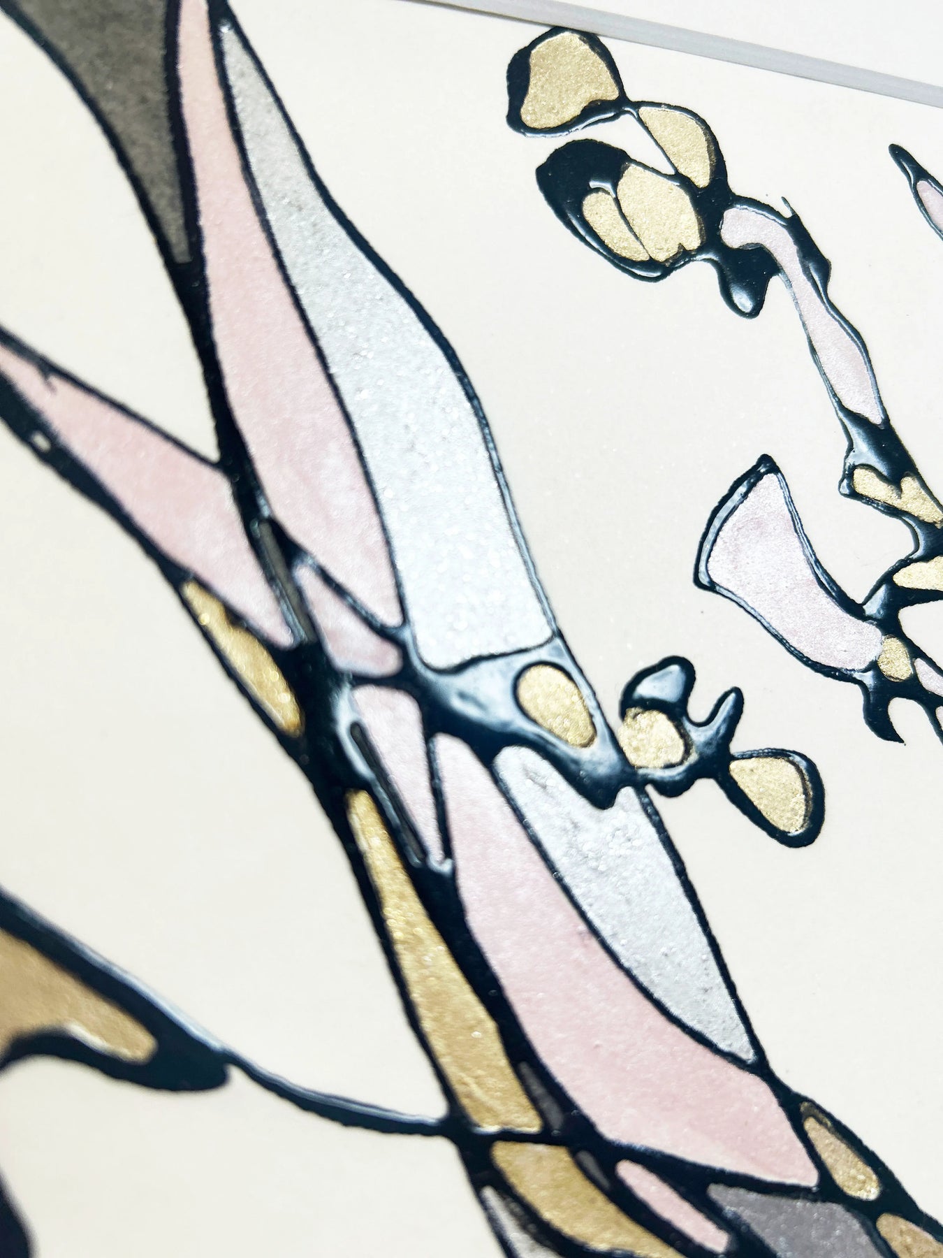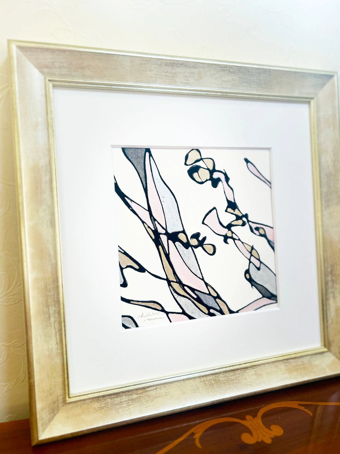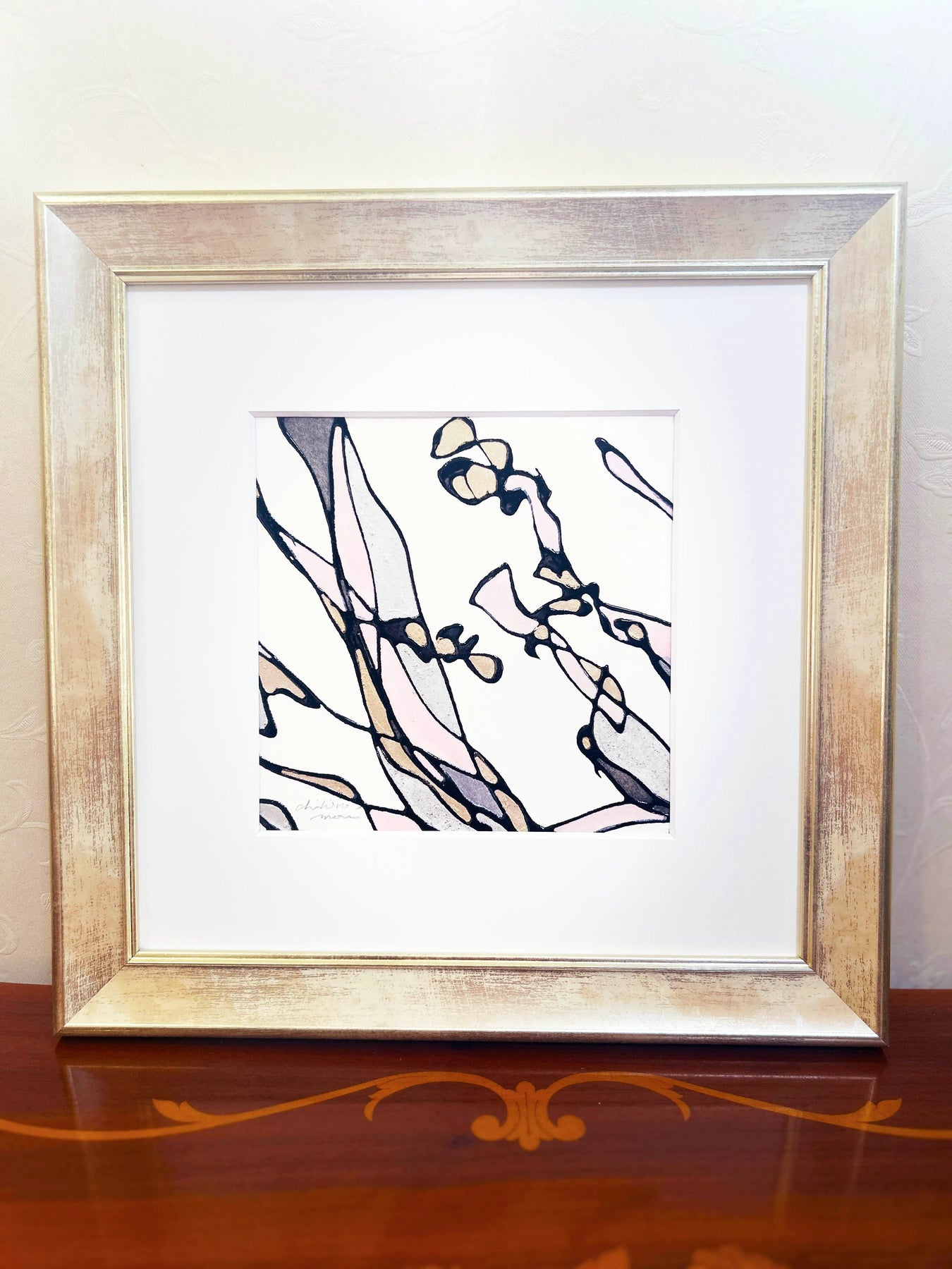 - MT-Line。それは、紙面に筆を触れることなく、ただ流れるまま、空間から紡ぎ出される線で描いています。やわらかな空気をまとう筆先が、光の粒をすくい上げるようにして生まれる、しなやかな軌跡。 そんな線で描いた「Petite fleur」シリーズは、花がもつ愛らしく優しい面影を、しなやかに宿しています。 優美なピンクにシルバーを溶け込ませた色彩の層に、筆跡が息づくラインの凹凸と、極小の銀箔・金箔を重ね、「紫蘭」の清廉な美しさを表現しました。 洗練された光を宿す、立体的なラインの連なり。それらが色彩と溶け合い、花が呼吸するように空間を潤す、優美な息吹。 このたおやかな彩りが、皆様の日々にそっと溶け込み、心ほどけるような優しいひとときを紡いでくれますように。