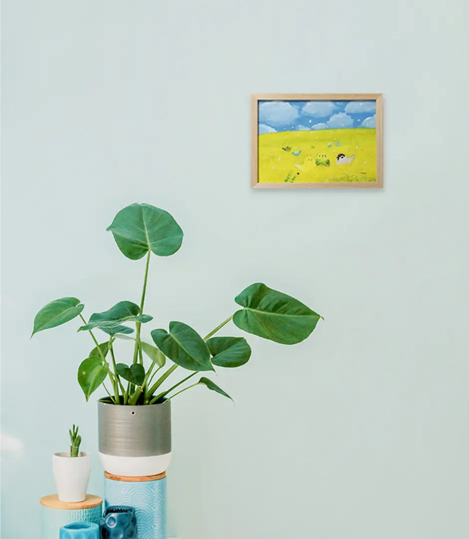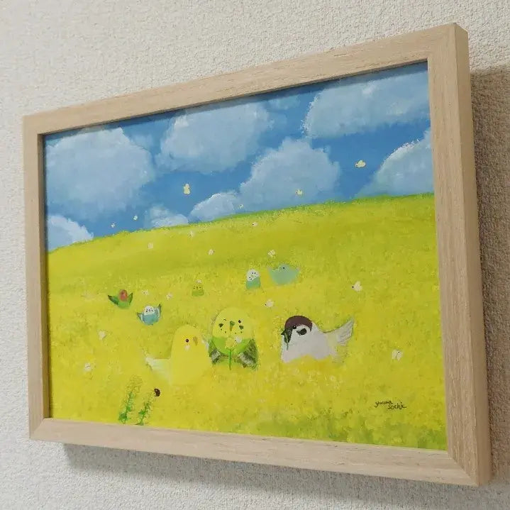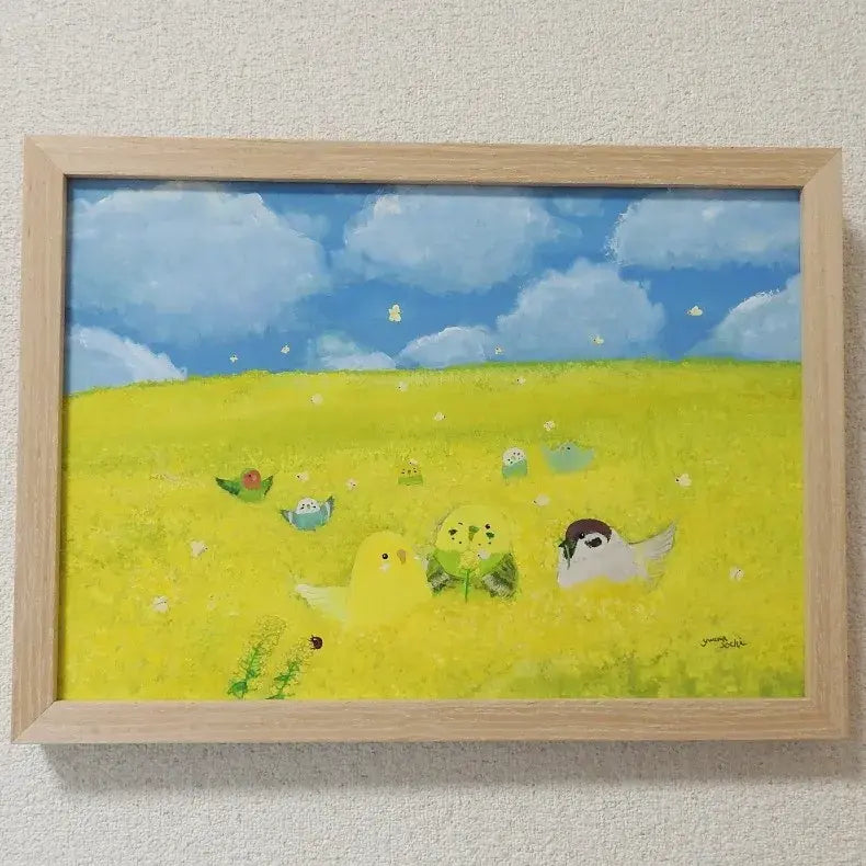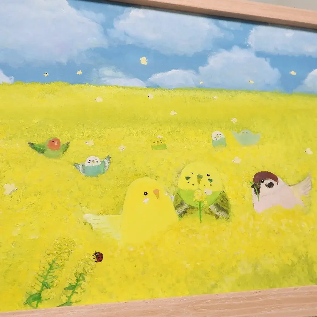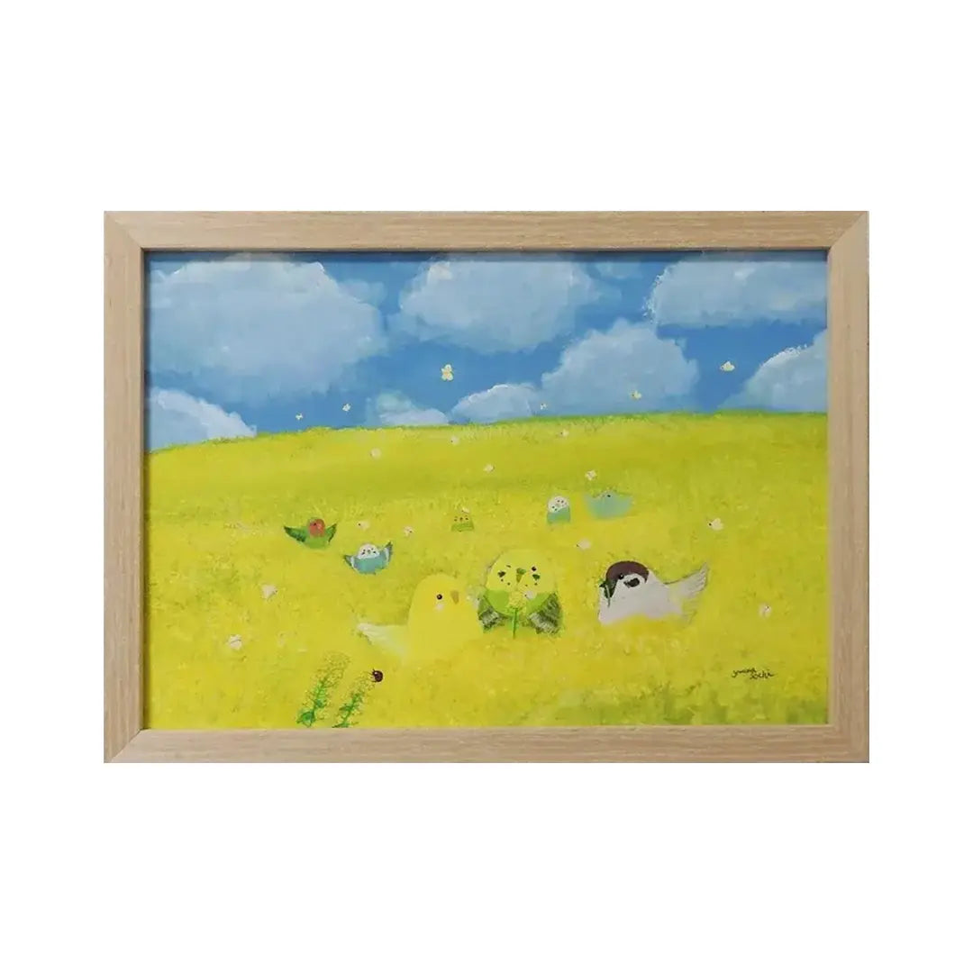 見渡す限りの菜の花畑に、愛らしい小鳥たちが集い、楽しげな歌声を響かせているようです。澄み渡る青空と眩いほどの黄色が織りなすコントラストは、眺めるだけで心が弾むような、幸福な春の訪れを予感させてくれます。この作品を飾ることで、お部屋の中に爽やかな風と明るい陽光が差し込み、日々の暮らしに穏やかな笑顔が広がっていくでしょう。家族が集うリビングや玄関に、木目調の家具と合わせるのも素敵です。