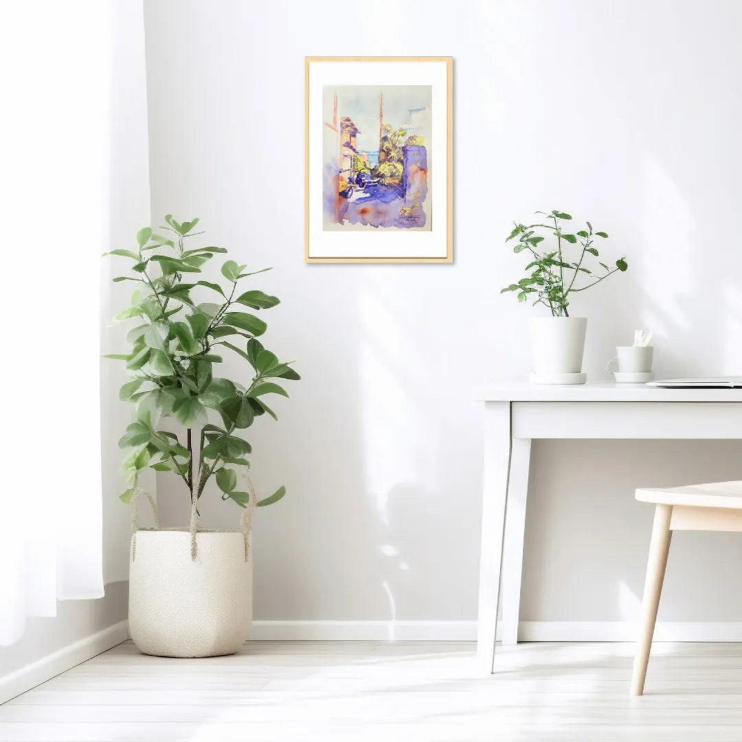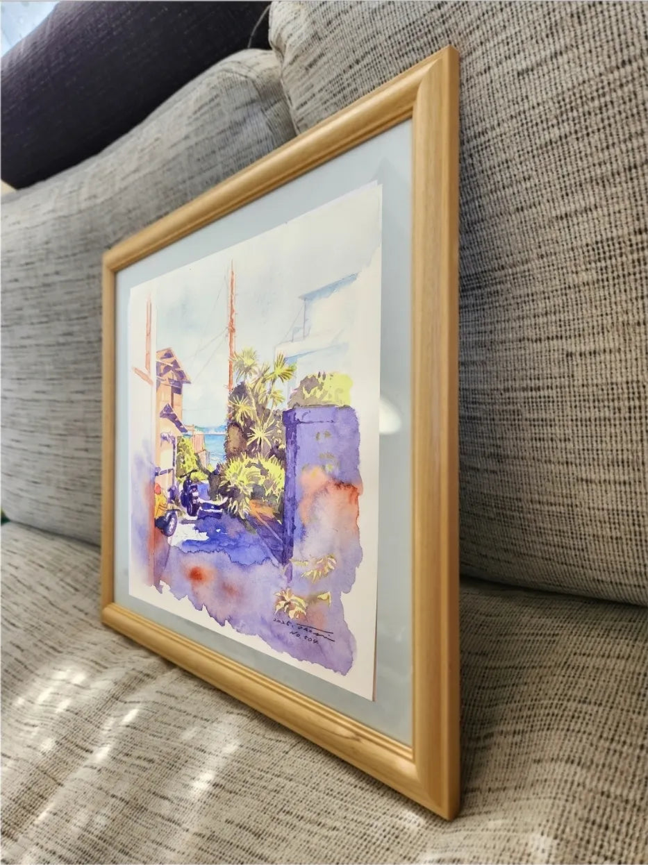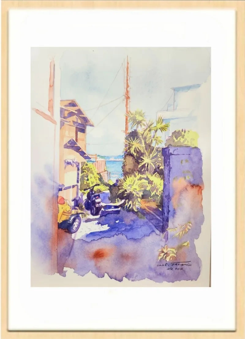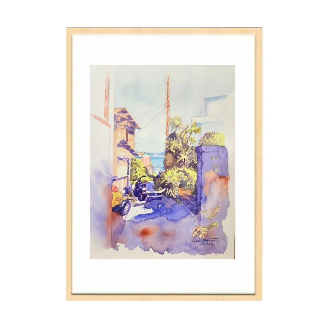 建物の間から差し込む光が、路地を鮮やかな色彩で照らし、その奥には穏やかに輝く海が広がります。大胆なタッチと、にじむような柔らかな水彩の表現が、熱気や風、遠くから聞こえる潮騒の音を伝えているようです。飾ることで、日常の喧騒から離れた、どこか遠い異国の地へと誘われるような心地よさを感じられるでしょう。玄関やリビングに飾ると、日々の暮らしに心安らぐ風景が広がります。