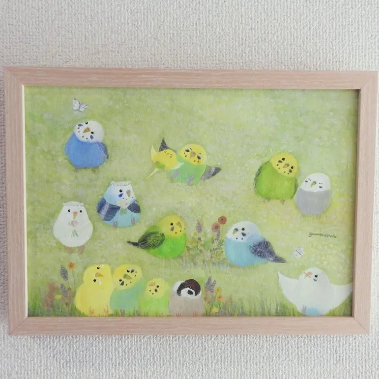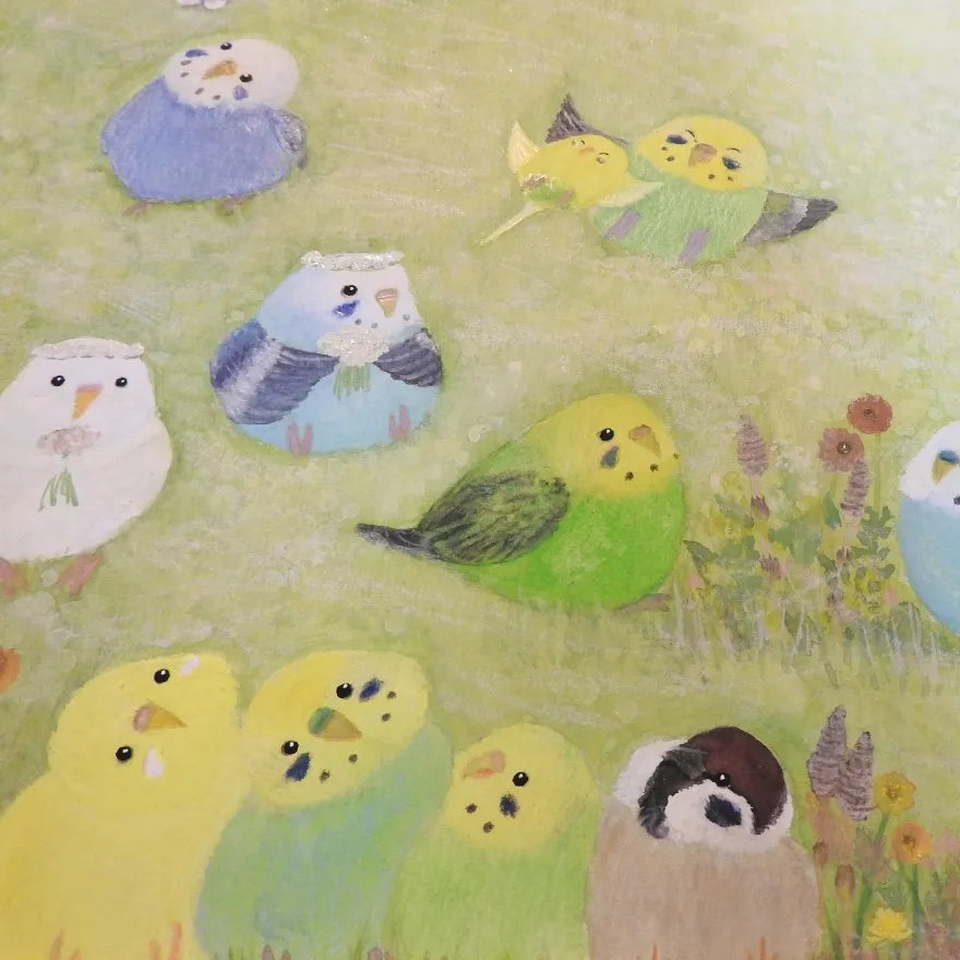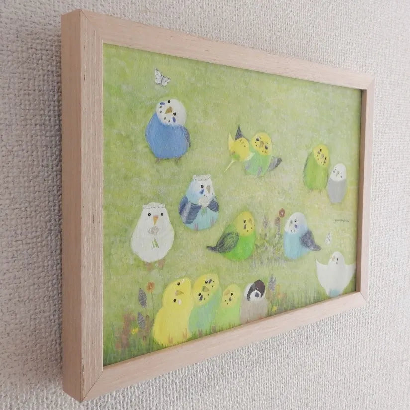 瑞々しい緑の草原に、色彩豊かな小鳥たちが集い、楽しげに語らう様子が生き生きと描かれています。柔らかな筆致で表現された草花と、羽を休める鳥たちの穏やかな表情は、見る人を陽だまりのような幸福感で包み込むでしょう。この作品を飾れば、お部屋の空気がふわりと軽やかになり、心までリフレッシュされるような開放感が生まれます。北欧風の明るいリビングや、お子様の成長を見守る子ども部屋にもよく馴染みます。