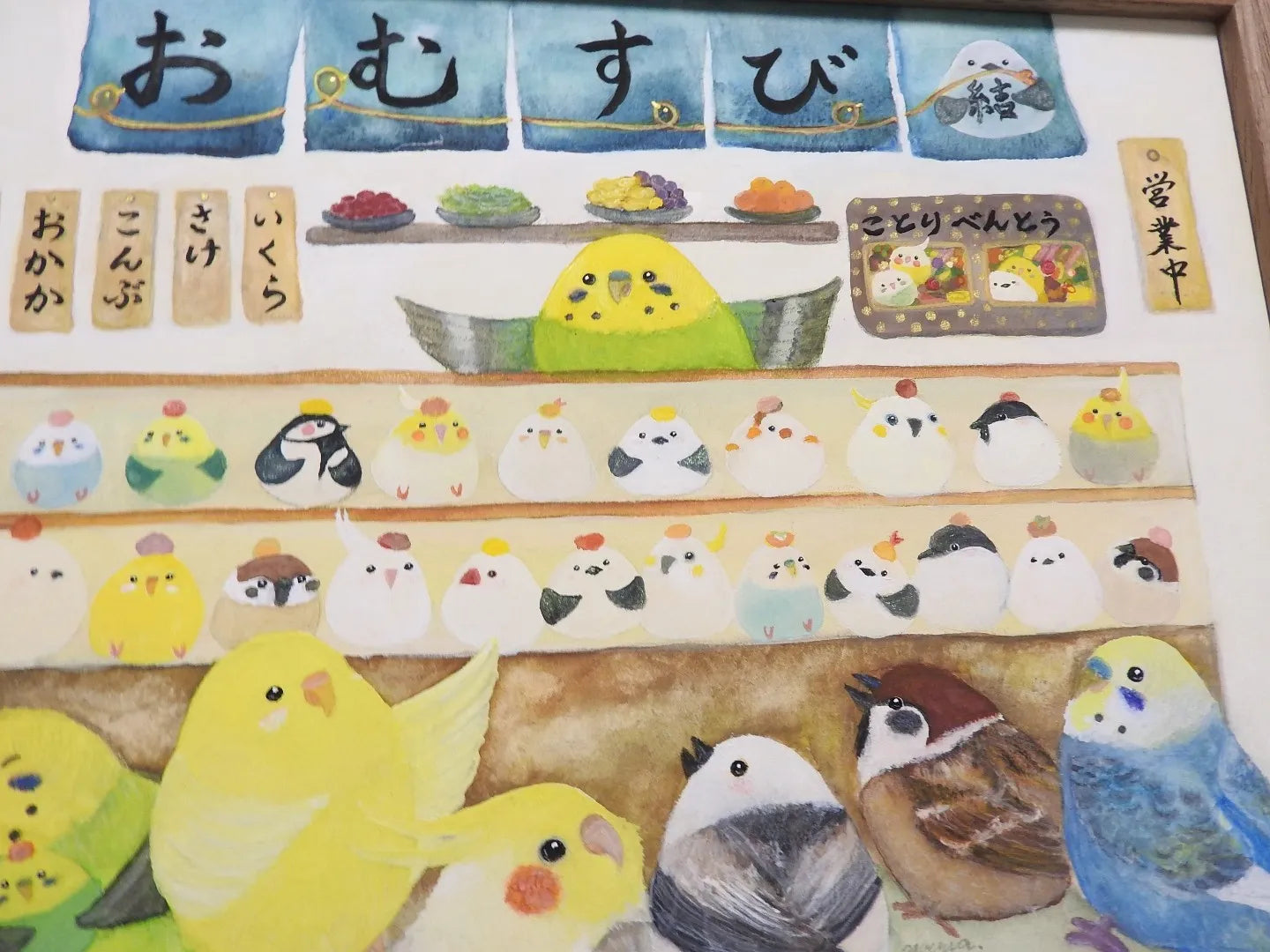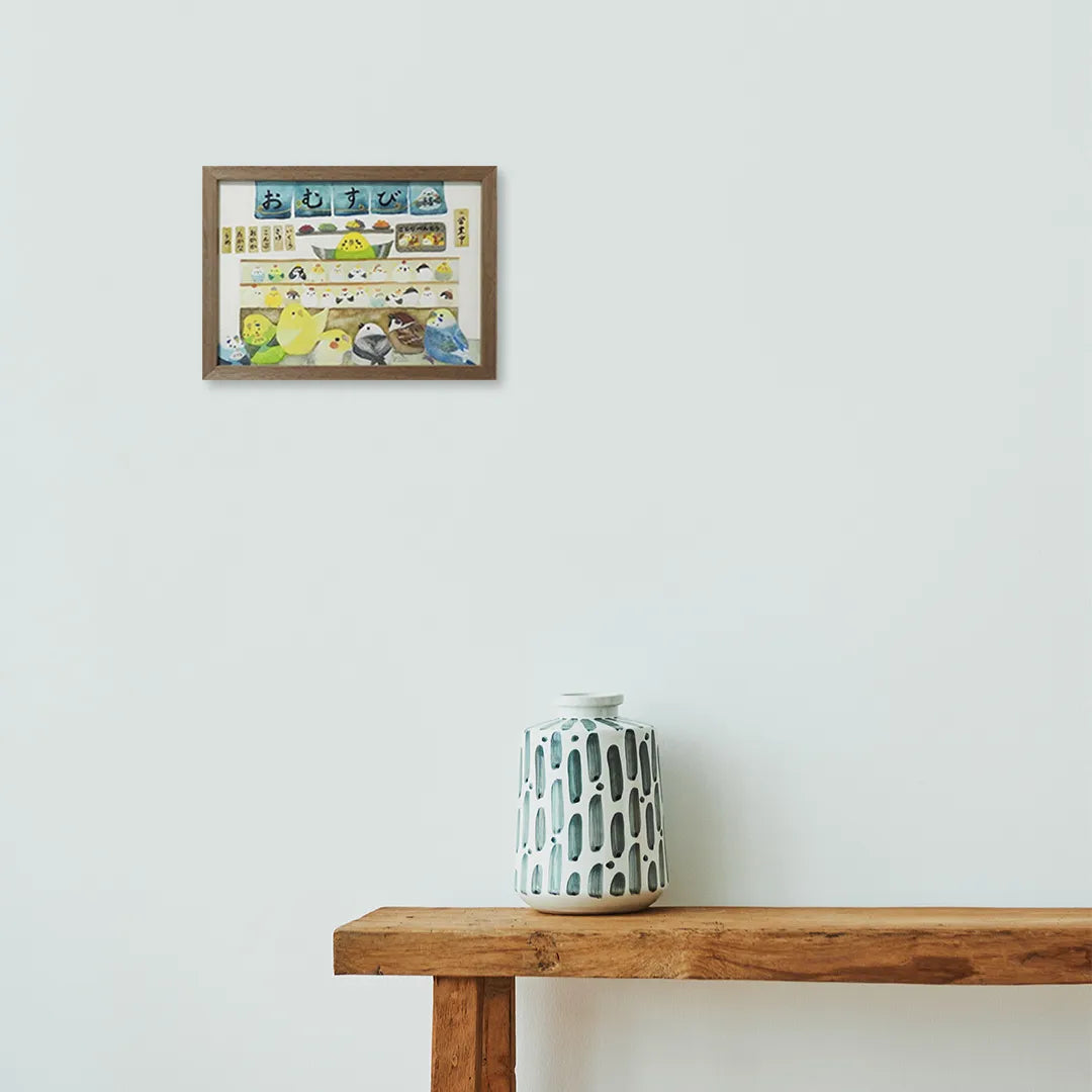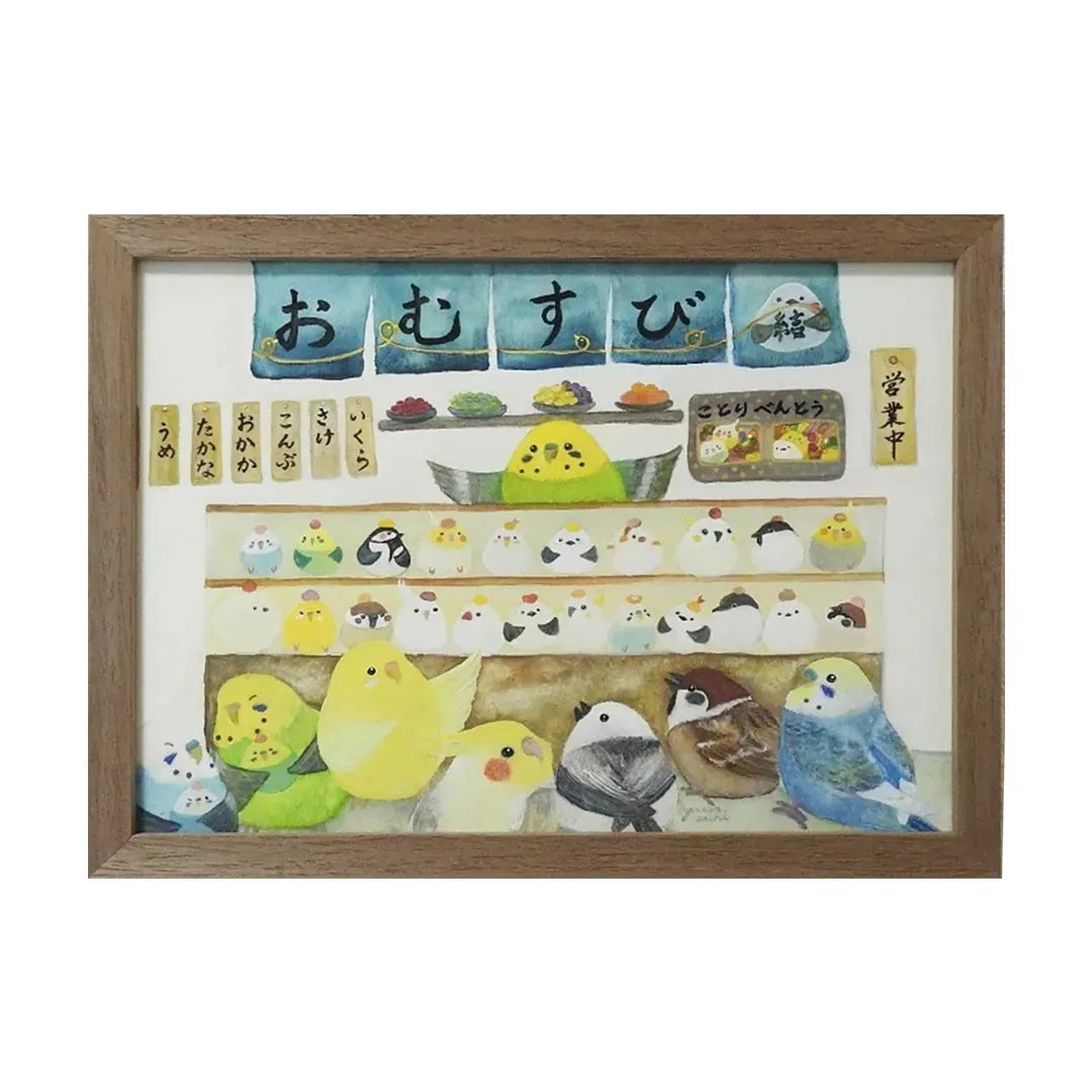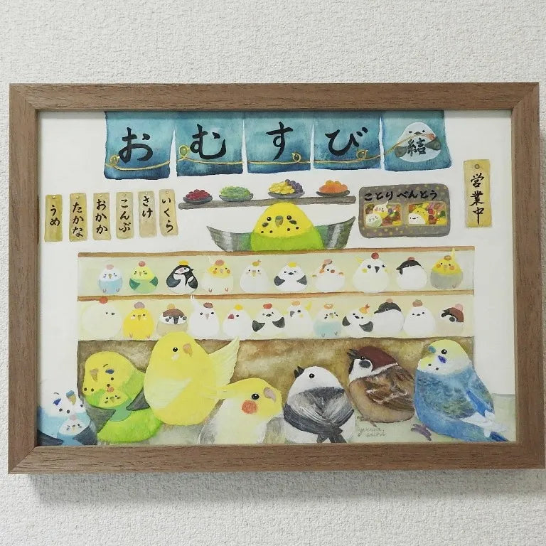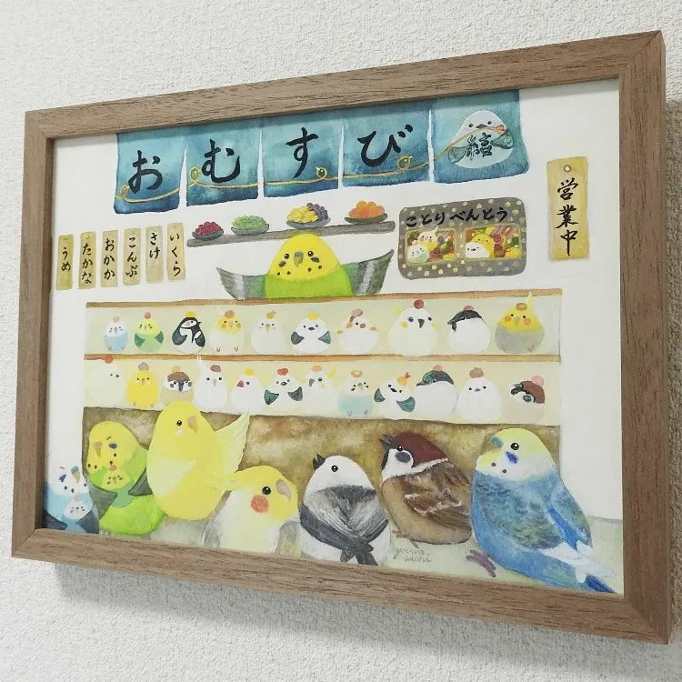 青い暖簾の向こうに、おむすびと小鳥たちがひしめき合う、活気とユーモアに満ちた世界が広がります。店番をするインコや、期待に胸を膨らませて並ぶ面々の愛らしい姿は、眺めるだけで心が解け、日常に小さな笑みを運んでくれるでしょう。この絵を壁に掛けるだけで、部屋の空気がぱっと陽気に塗り替えられ、家族やゲストとの会話が自然に弾むはずです。キッチンやダイニングに飾れば、木製の食卓とも賑やかに調和します。