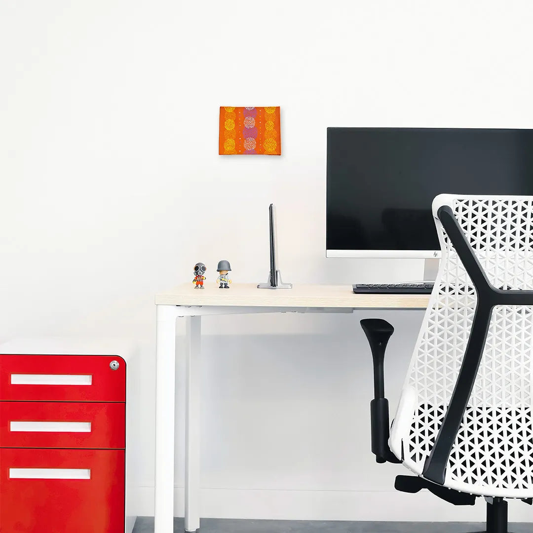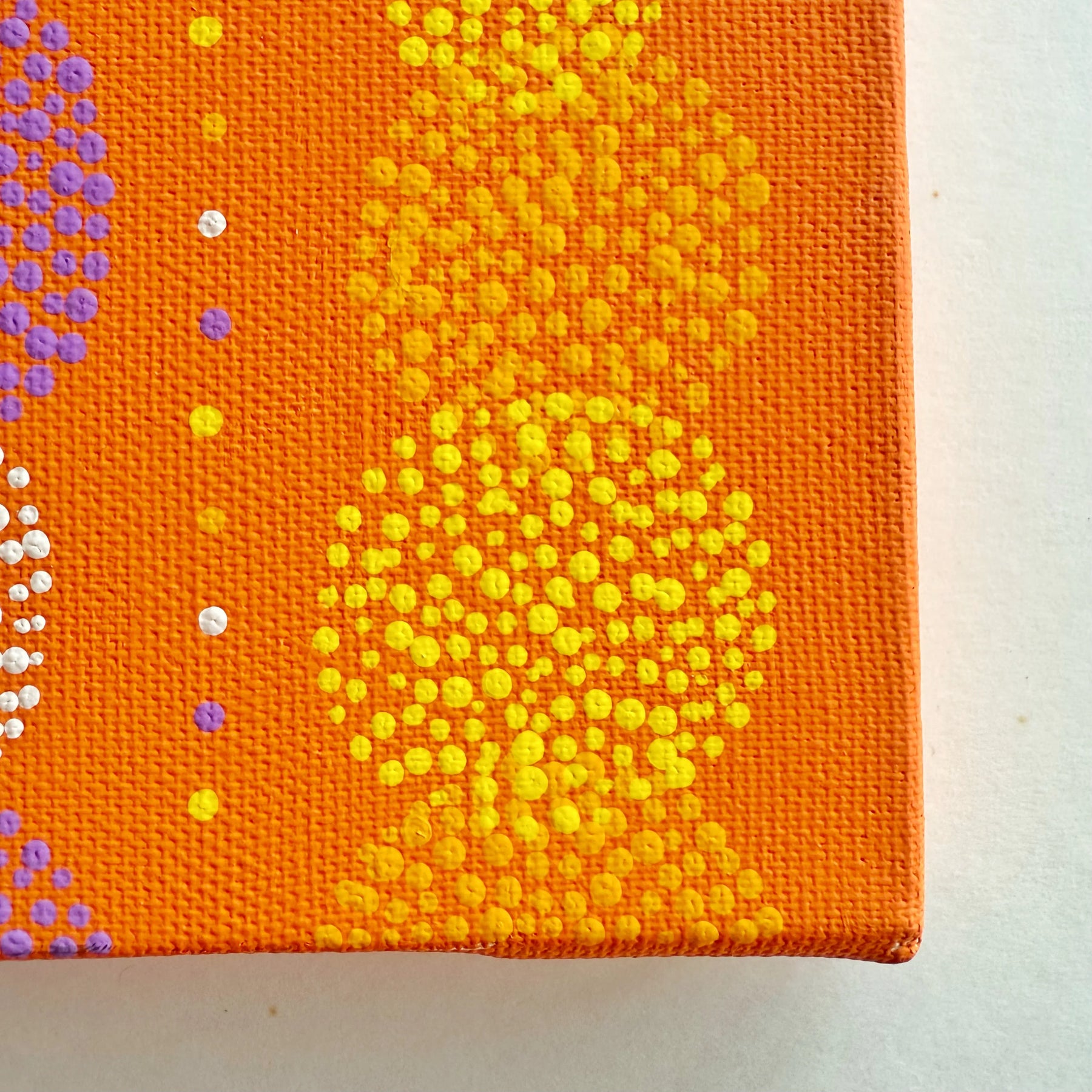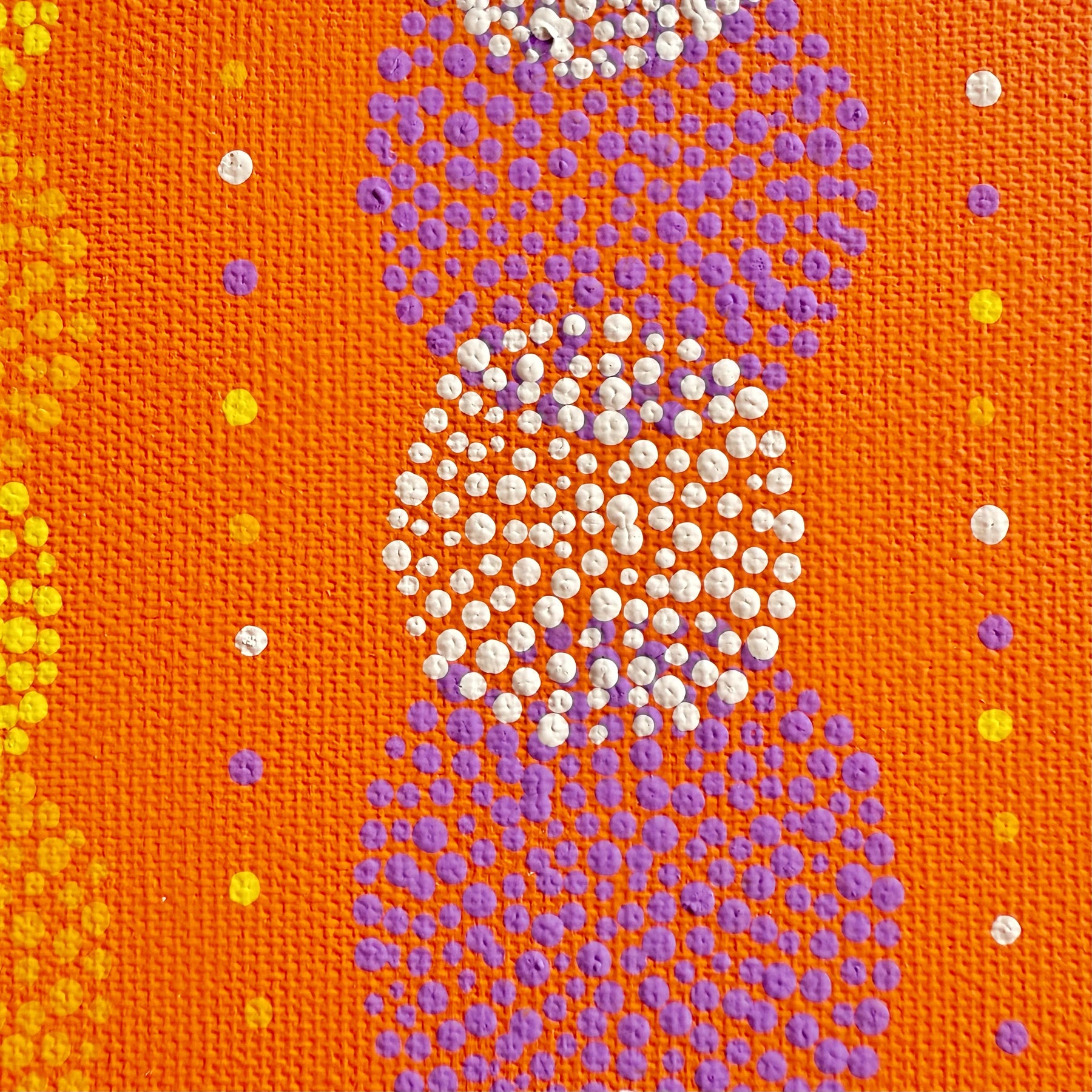 鮮やかなオレンジの背景に、白や紫のドットが円を描き、まるで熟した果実が太陽を浴びて輝いているようです。一粒ずつ丁寧に紡がれた色彩は、心に元気を与えるビタミンのような温かさを放ち、眺めるだけで内側から力が湧いてくるのを感じます。この作品を一点飾ることで、お部屋がパッと明るい陽気に包まれ、家族が自然と笑顔になるような心地よい団欒の場へと変わります。