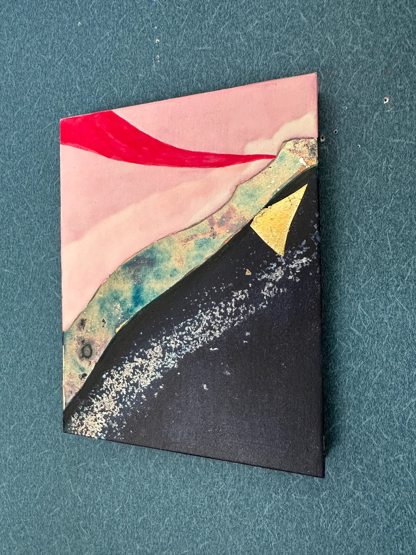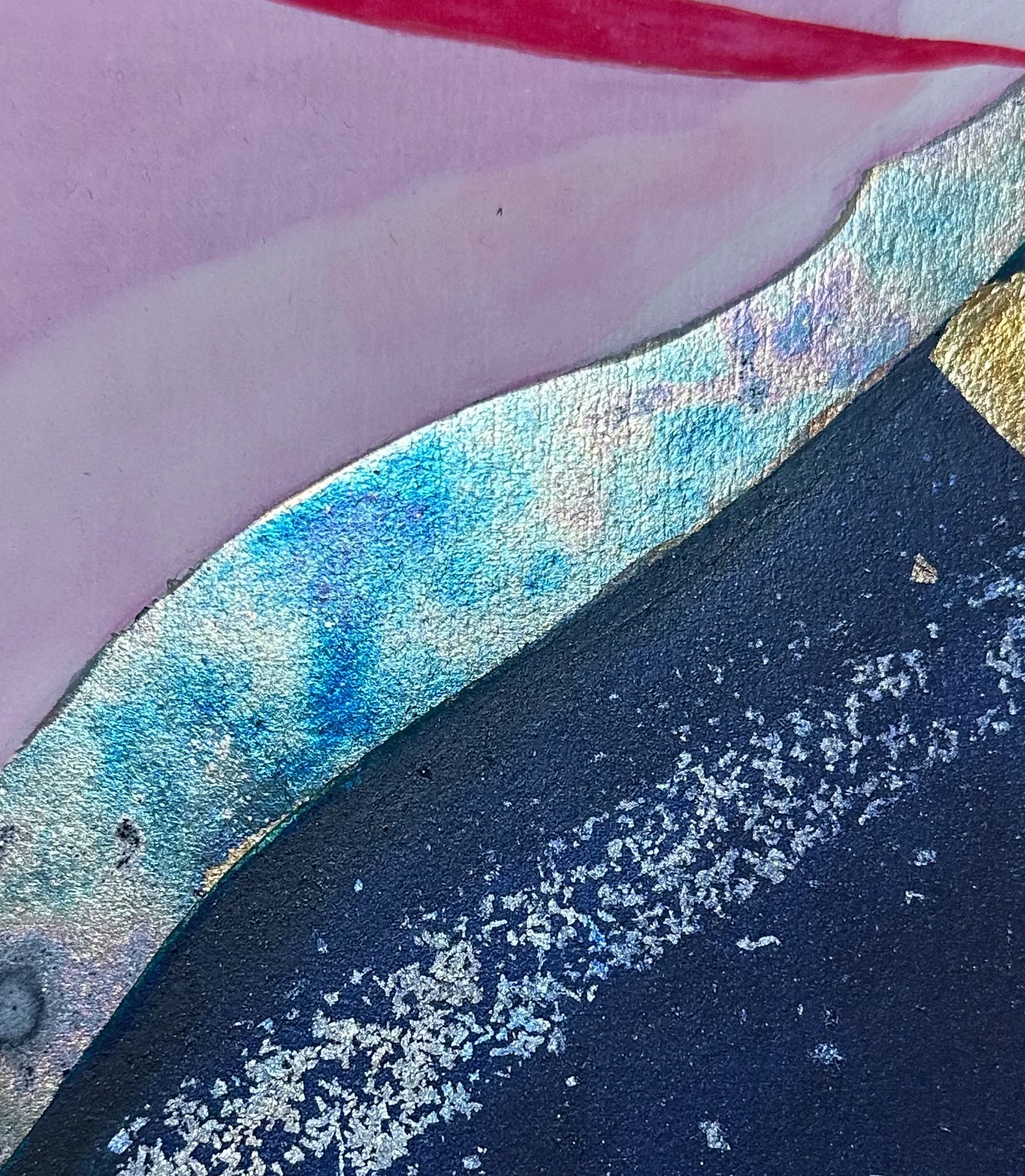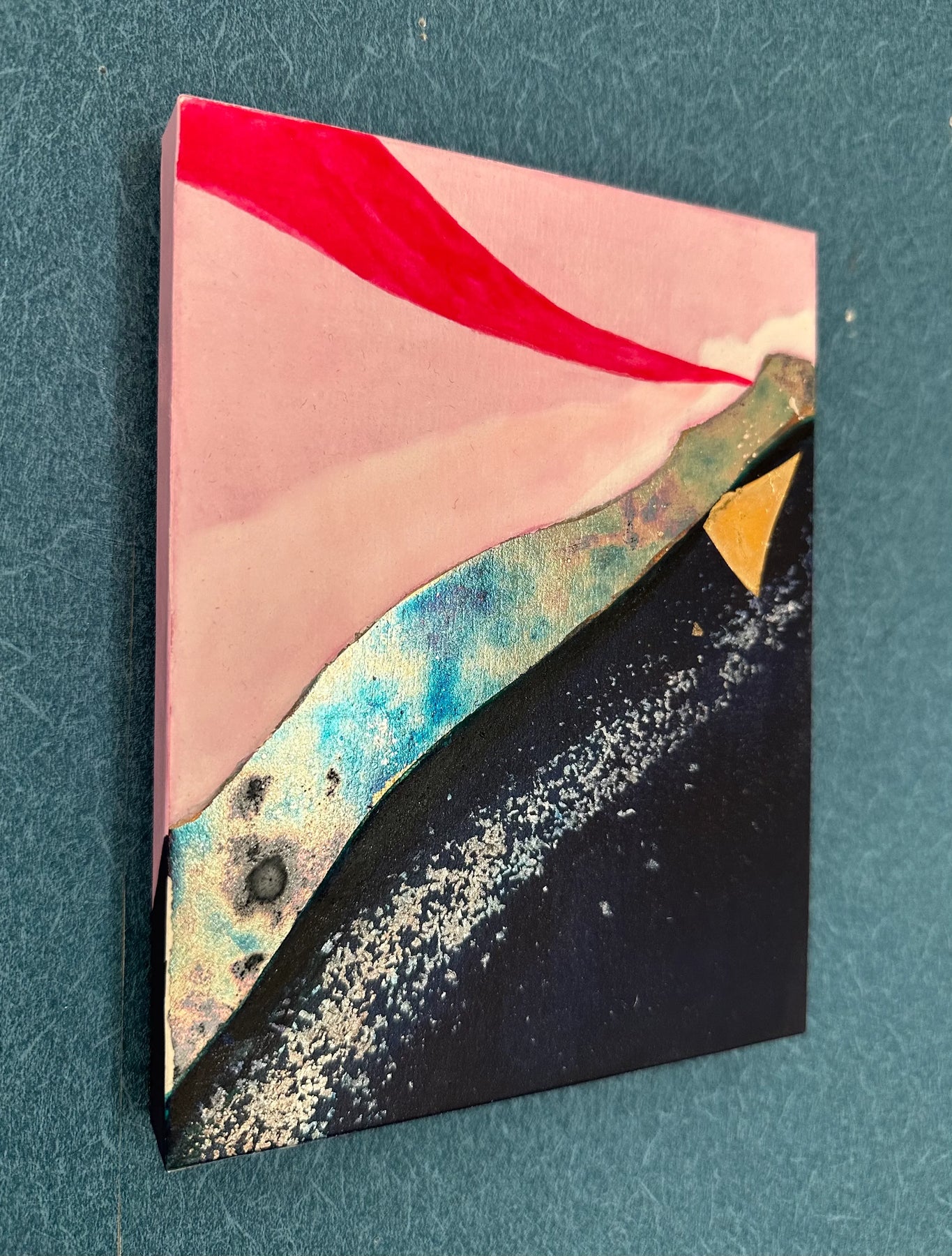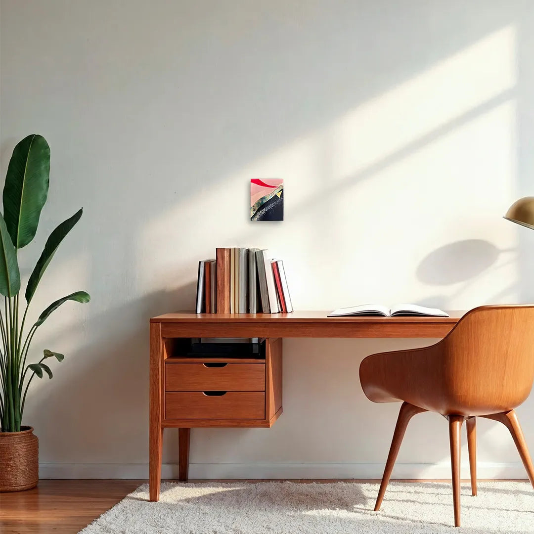 柔らかな桃色の空に、鮮烈な紅の筆致と煌めく鉱石のような質感が重なり、未踏の地の夜明けを思わせる神秘を宿しています。画面を斜めに横断する力強いコントラストは、眺めるほどに新たな一歩を踏み出す勇気を授け、心に心地よい刺激を届けてくれるでしょう。この独創的な一作を飾ることで、室内には開放的なエネルギーが満ち、日々の景色を鮮やかに塗り替えます。