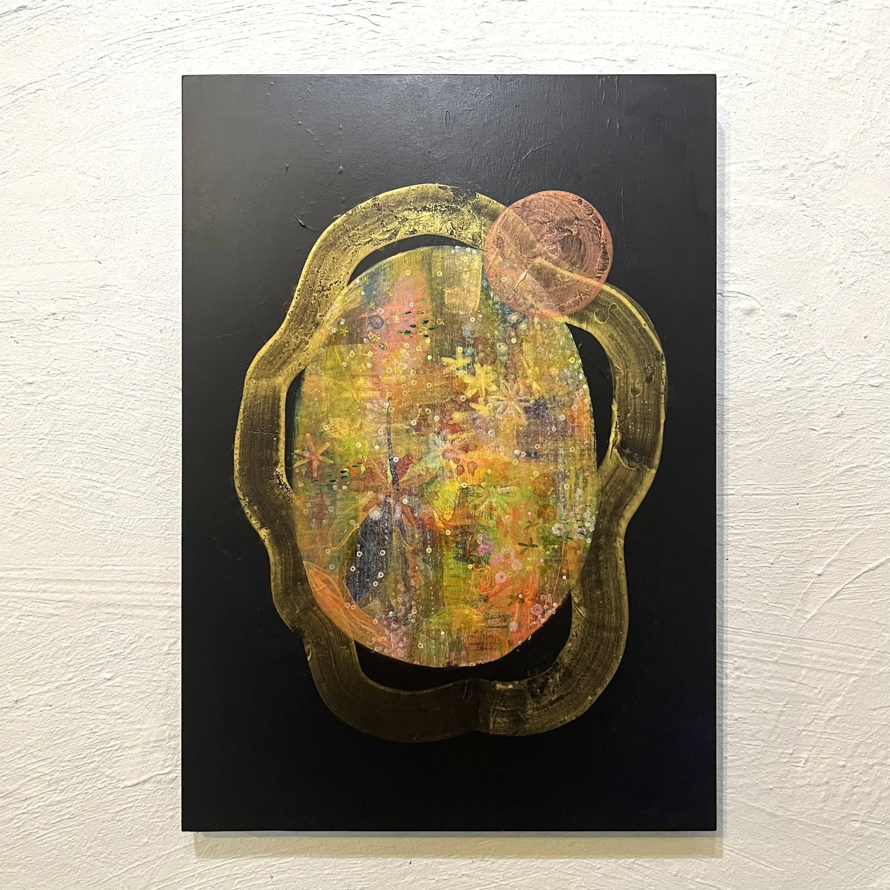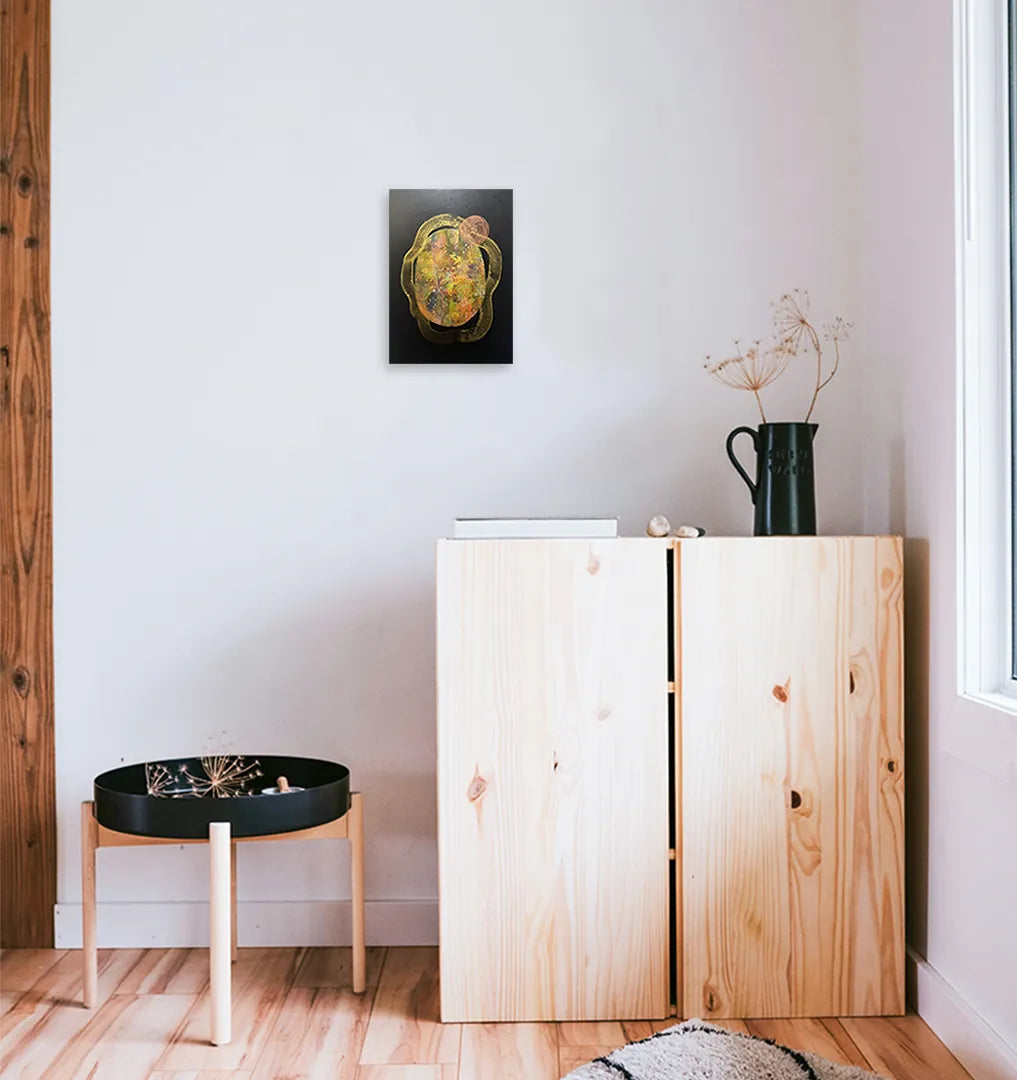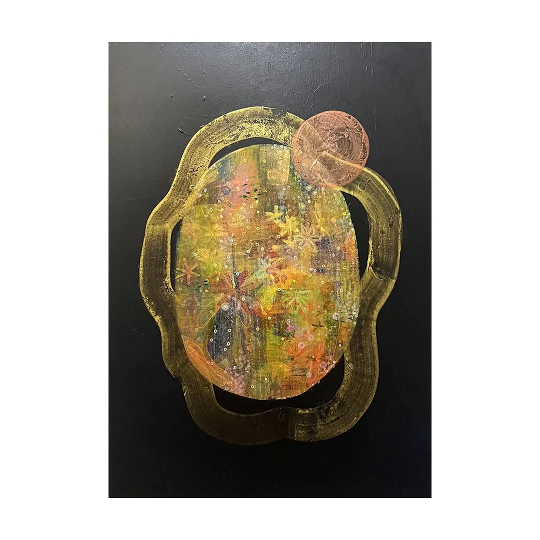 やわらかな金色の輪が、内側の世界をそっと包み込んでいます。淡い花や星のような模様が重なり、夜明け前の夢の名残のように揺れています。光の粒が静かに息づくその姿は、時間の流れさえやさしく溶かすようです。壁に飾ると、空間全体が穏やかに呼吸をはじめ、思考を深める静けさが生まれます。黒を基調としたモダンなリビングや、灯りの落ち着いた書斎にも自然に調和します。